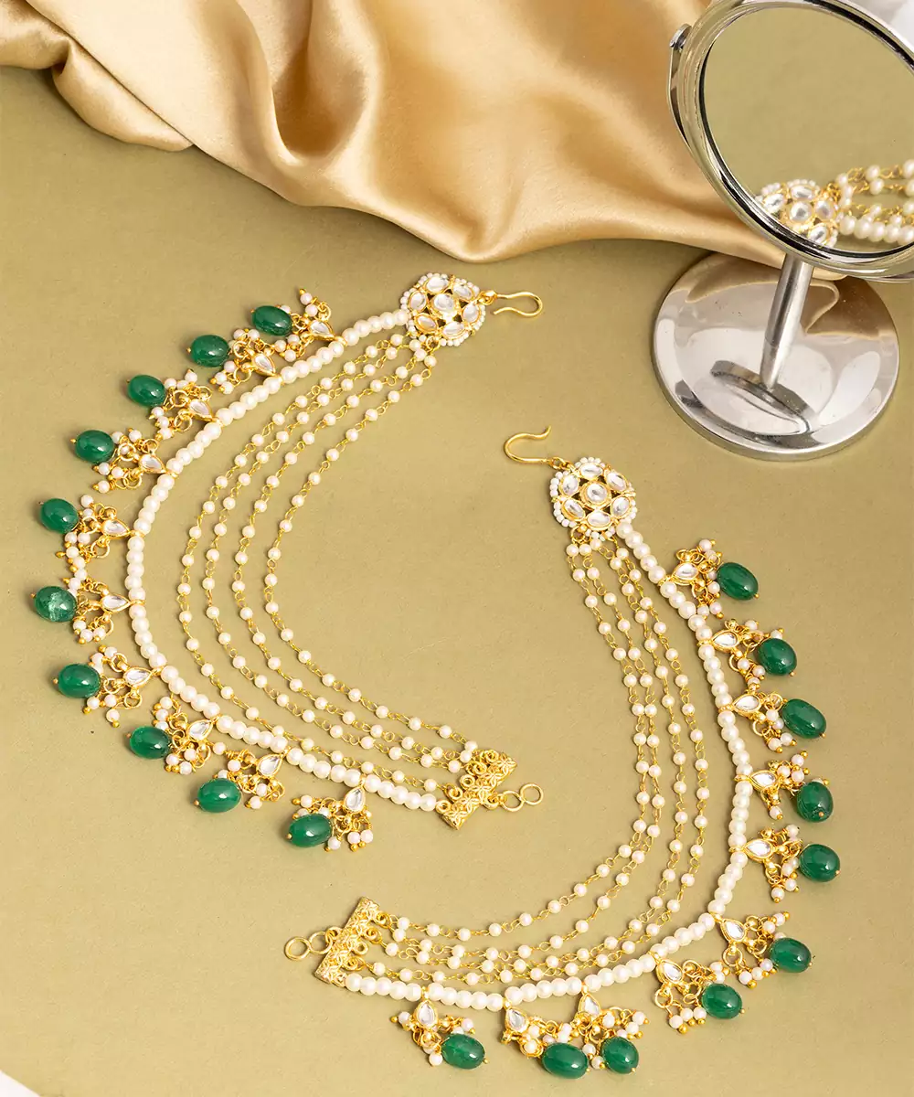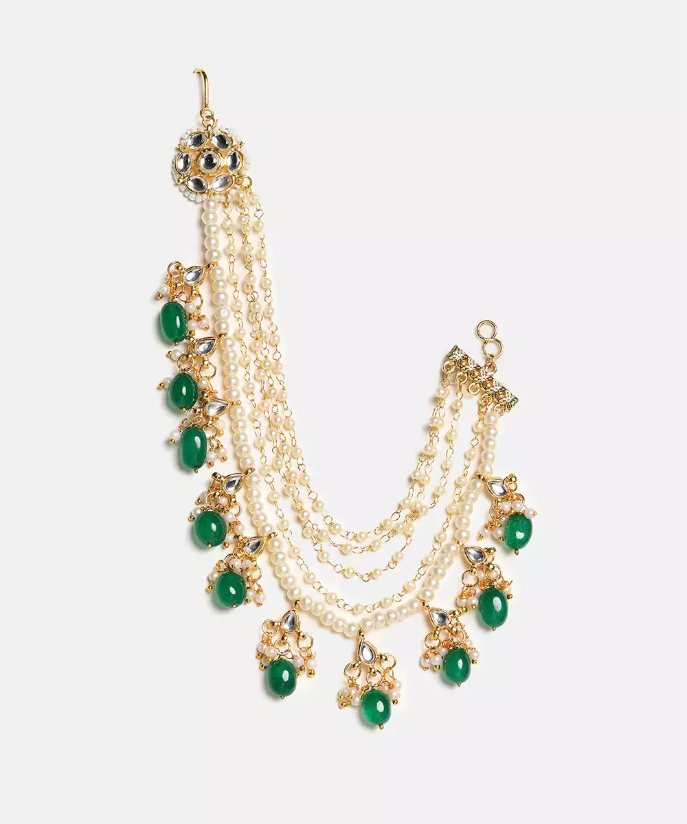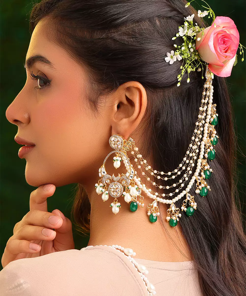 These Gold Plated Kundan Green Stones Chain Earrings Highlight Refined Artistry And Vibrant Beauty. Featuring Green Stones With Kundan Work, They Create A Striking Accessory For Festive Occasions. Perfect For Weddings And Celebrations, These Chain Earrings Enhance Traditional Outfits With Elegance And Charm.