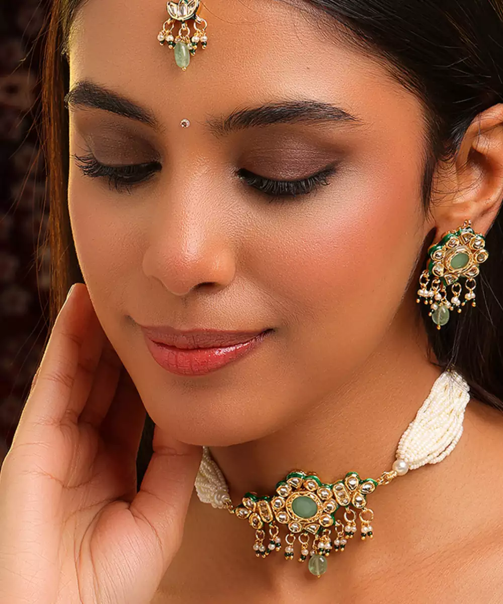 This Gold Plated Kundan Green Stones Choker Necklace Set Highlights Classic Artistry And Refined Beauty. Crafted With Kundan Detailing And Rich Green Stones, It Creates A Striking Accessory For Special Occasions. Ideal For Weddings And Festivities, This Choker Set Enhances Lehengas And Sarees With Regal Sophistication.