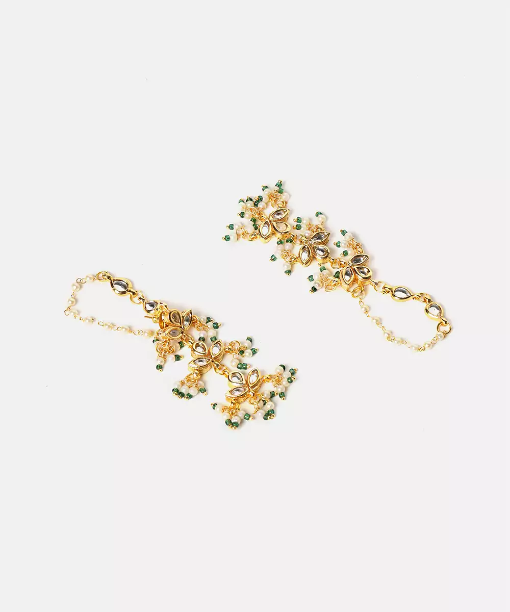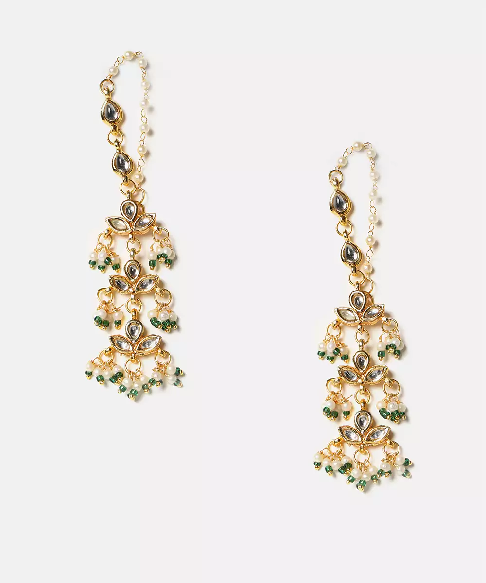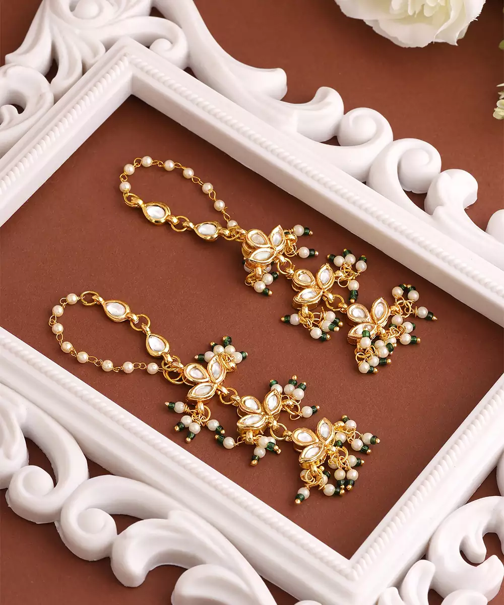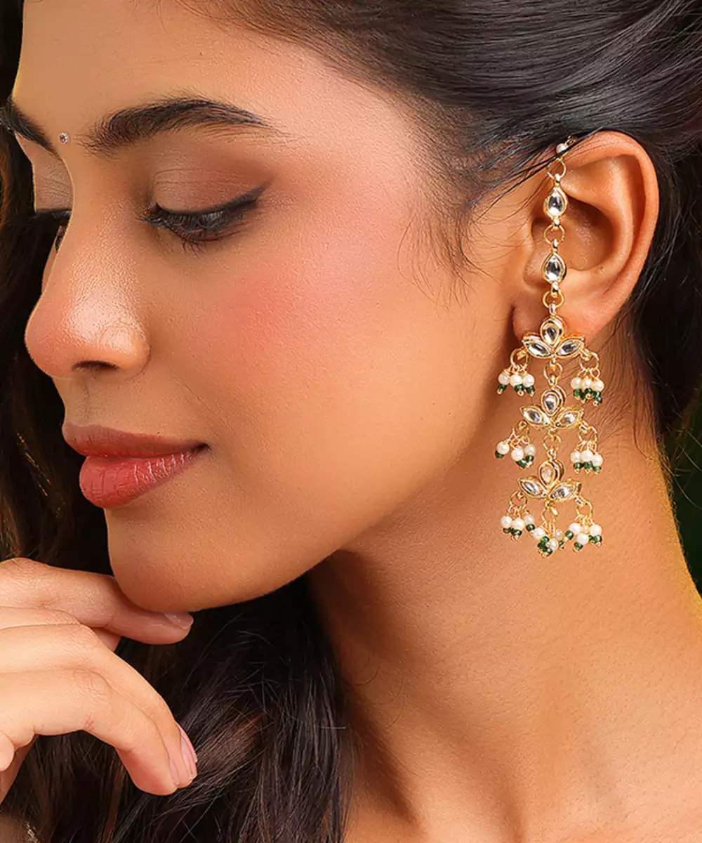 These Gold Plated Kundan Green Stones Earrings Highlight Classic Elegance And Traditional Craftsmanship. Featuring Deep Green Stones And Kundan Work, They Add Sophistication To Festive Looks. Ideal For Weddings And Special Occasions, These Earrings Beautifully Complement Ethnic Outfits With Refined Charm.