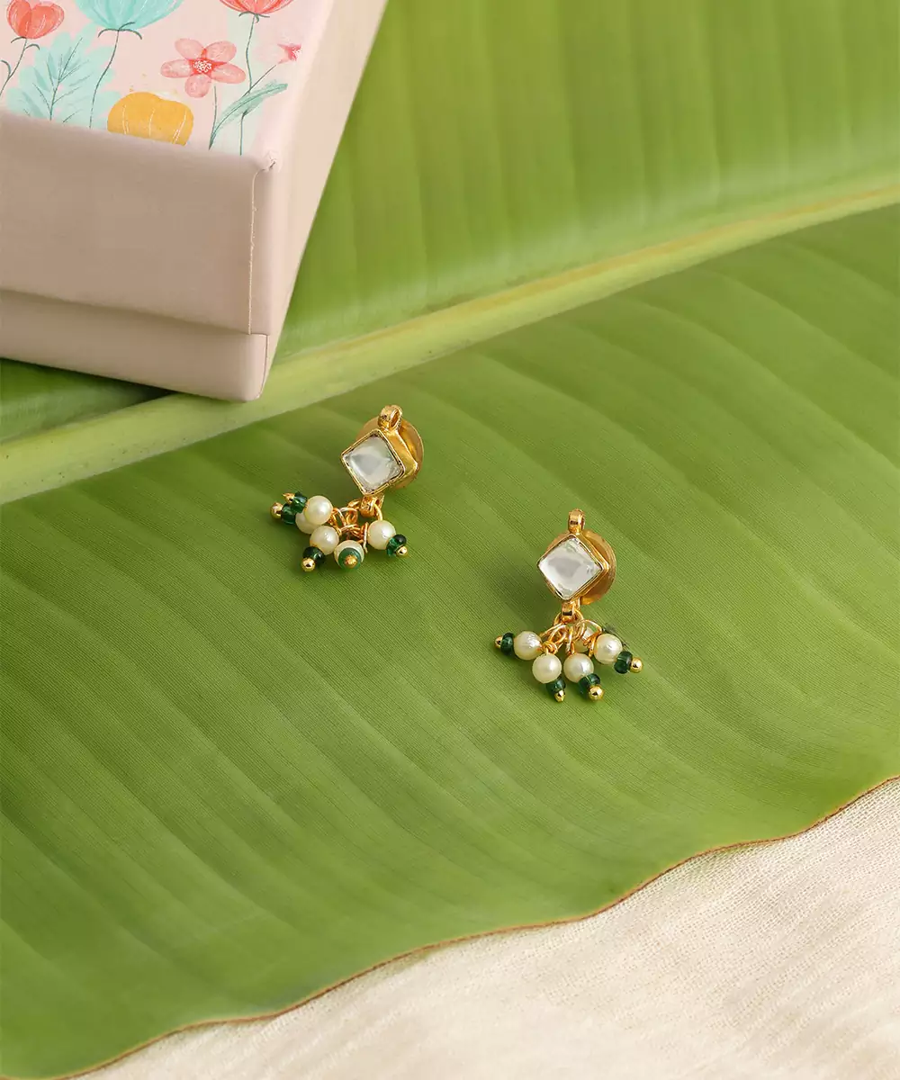These Elegant Gold Plated Kundan Earrings Are Embellished With Green Stones For A Fresh And Regal Look. The Intricate Detailing Enhances Traditional Outfits, Making Them Ideal For Weddings And Festive Occasions. They Complement Sarees And Lehengas While Adding Sophistication And Vibrant Ethnic Charm.