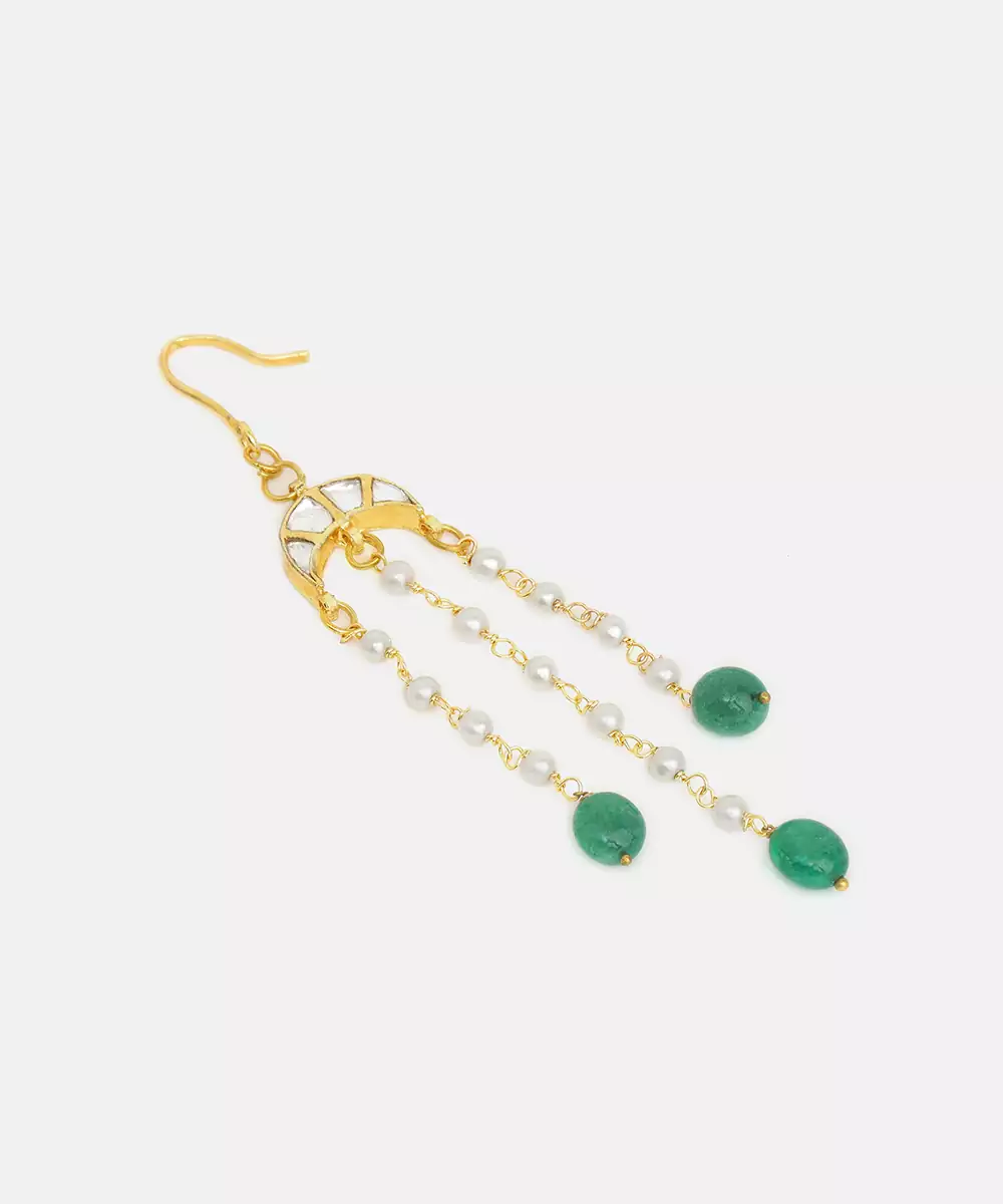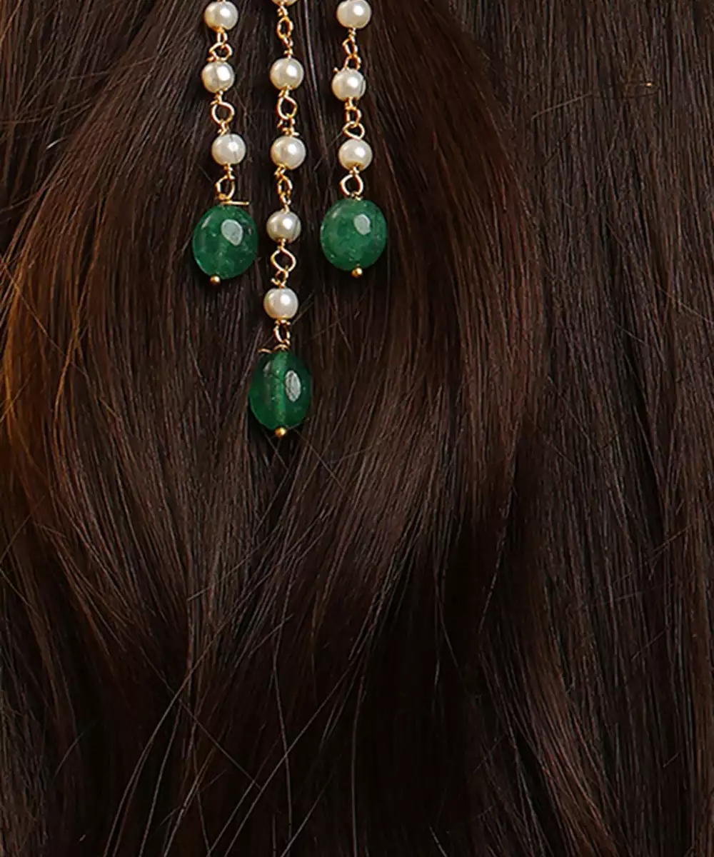 Adorned With Vibrant Green Stones, This Gold Plated Kundan Hair Clip Offers A Graceful Blend Of Tradition And Style. Its Detailed Design Adds Richness To Hairdos While Ensuring A Firm Hold. Perfect For Festive And Wedding Wear, It Complements Sarees And Lehengas Beautifully.