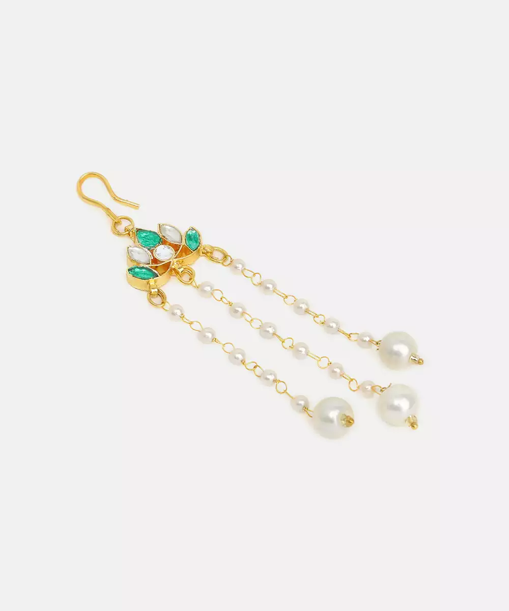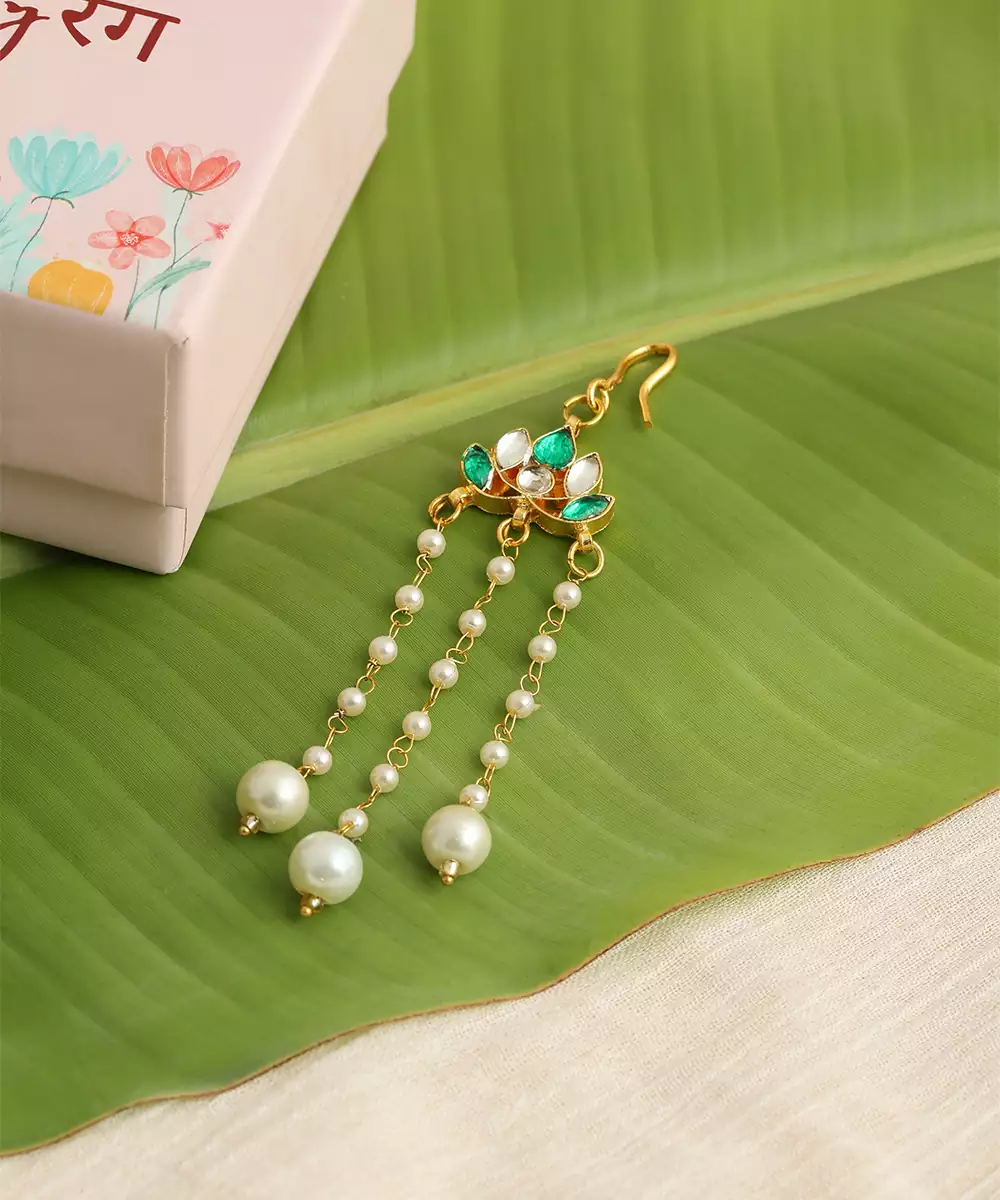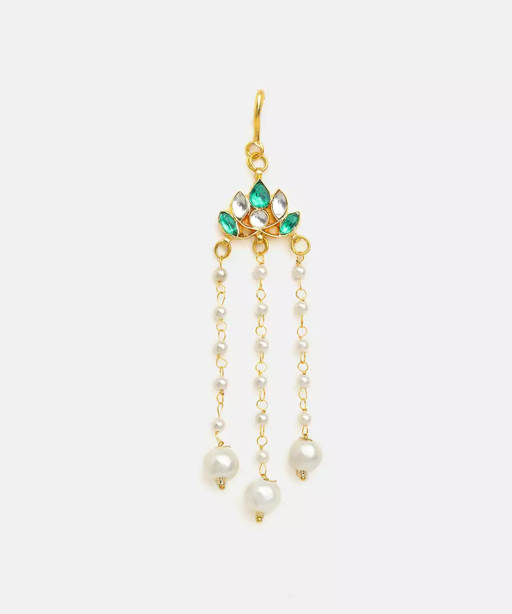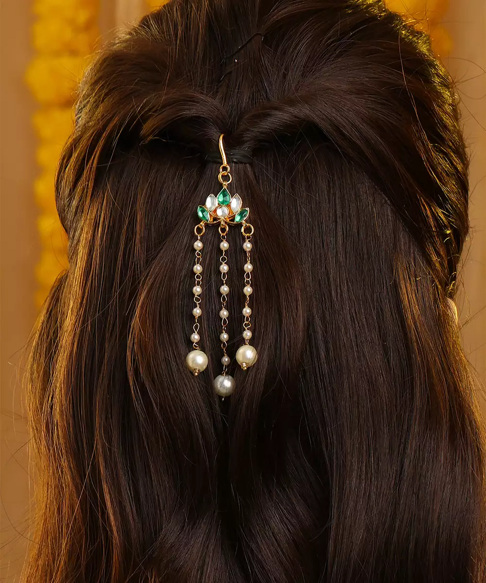 Featuring Luminous Green Stones, This Gold Plated Kundan Hair Clip Reflects Classic Elegance And Intricate Detailing. Designed For Comfort And Secure Wear, It Beautifully Enhances Bridal And Festive Hairstyles. A Perfect Accessory For Traditional Occasions, It Pairs Seamlessly With Ethnic Ensembles For A Polished Finish.