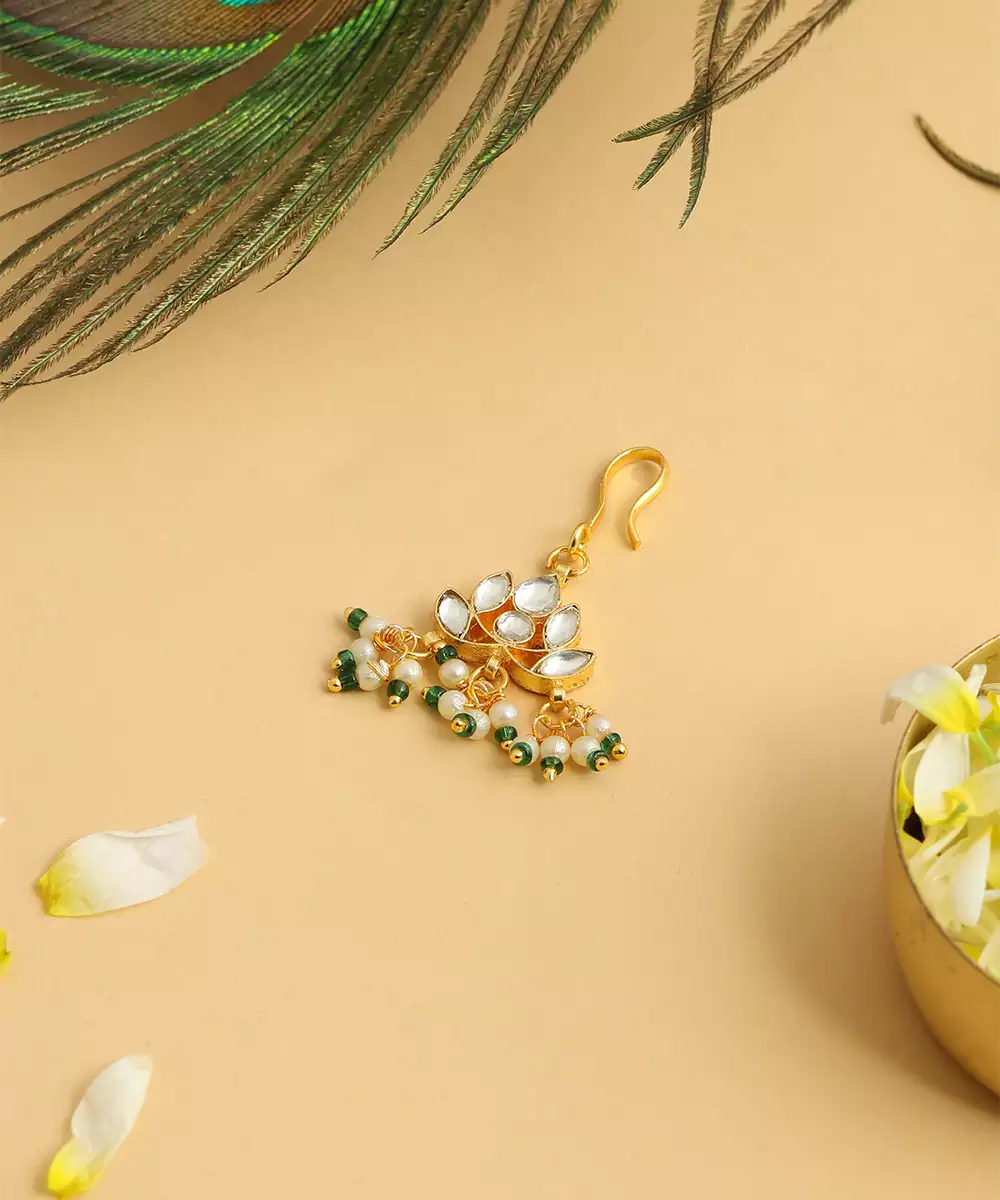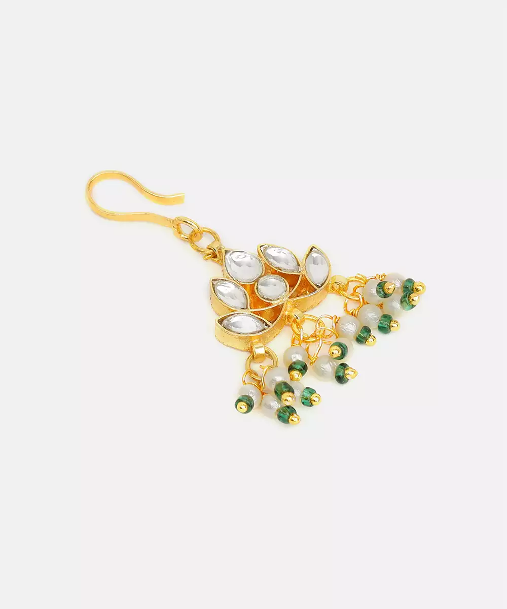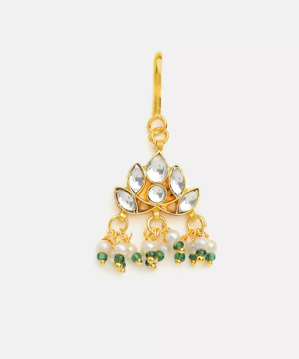 This Gold Plated Kundan Hair Clip Is Adorned With Rich Green Stones That Exude Royal Elegance. Its Detailed Craftsmanship Highlights Traditional Charm While Securing Hair Firmly. Perfect For Wedding Functions And Celebrations, It Adds A Luxurious Touch To Hairstyles And Complements Ethnic Outfits Beautifully.