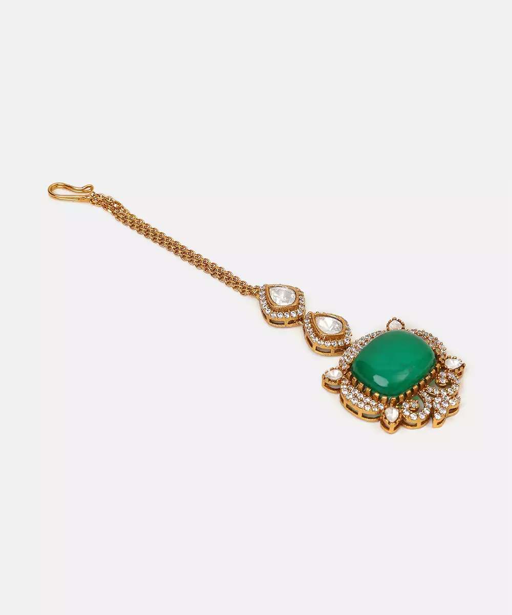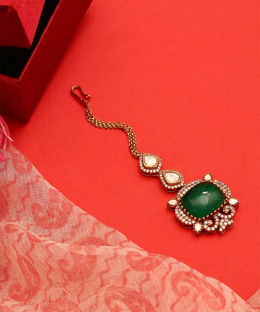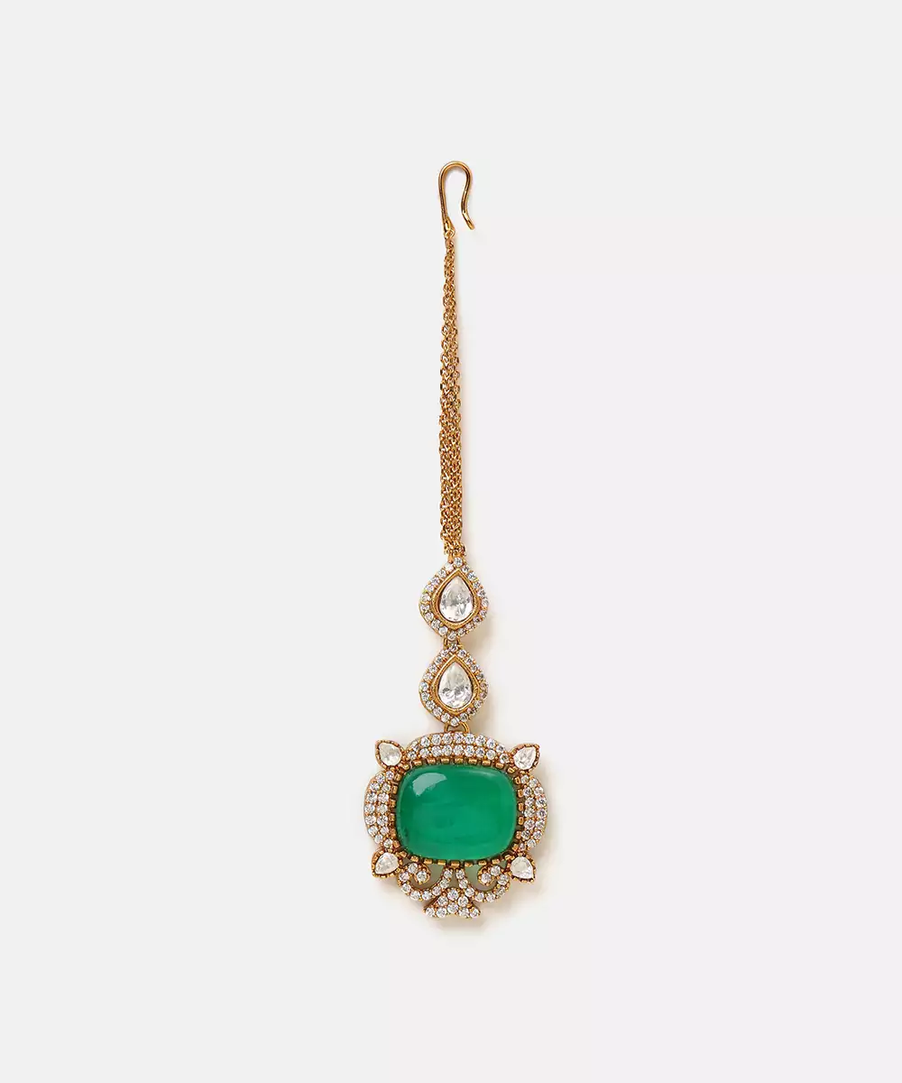 This Gold Plated Kundan Green Stones Maang Tikka Reflects Exquisite Craftsmanship And Timeless Appeal. Featuring Kundan Detailing With Vibrant Green Stones, It Creates A Striking Bridal Accessory. Ideal For Weddings And Festive Wear, This Maang Tikka Complements Traditional Outfits With Royal Sophistication.