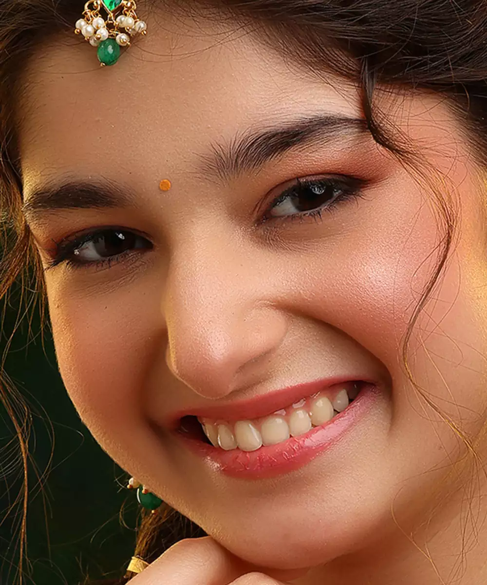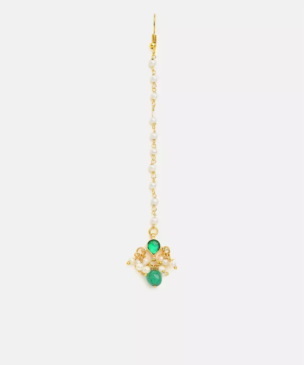 This Beautifully Crafted Gold Plated Kundan Maang Tikka Features Rich Green Stones That Symbolize Elegance And Tradition. Its Detailed Design Highlights Classic Artistry And Refined Finishing. Suitable For Bridal And Festive Wear, It Adds A Graceful Focal Point To Your Look While Enhancing Traditional Outfits.