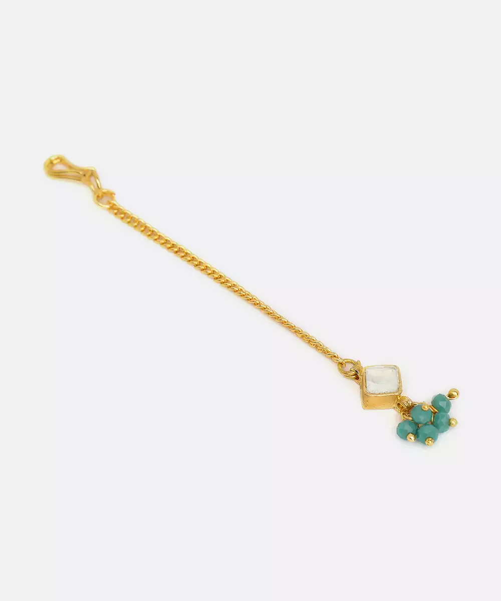 Designed With Radiant Green Stones, This Gold Plated Kundan Maang Tikka Enhances Traditional Hairstyles With Refined Elegance. Its Intricate Pattern Reflects Skilled Artistry And Cultural Charm. Suitable For Bridal And Festive Wear, It Pairs Effortlessly With Lehengas And Sarees For A Polished Ethnic Look.