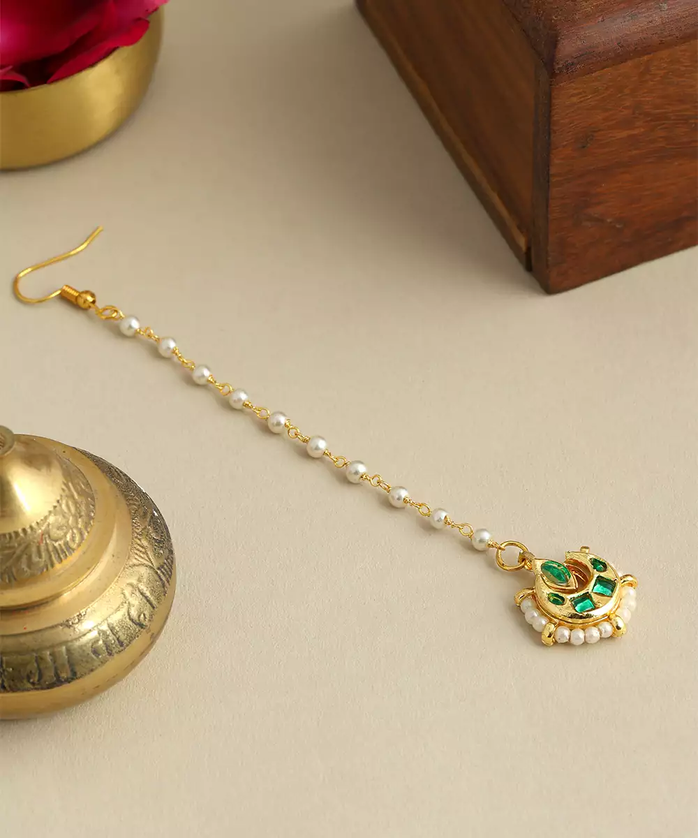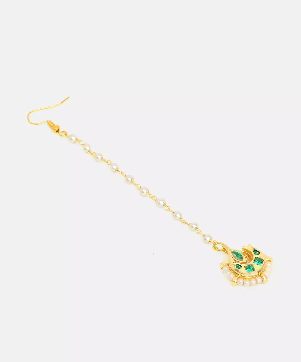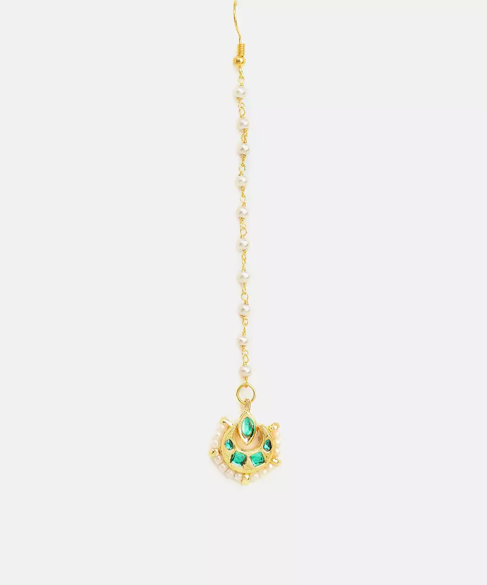 This Gold Plated Kundan Maang Tikka Features Luminous Green Stones In An Intricately Crafted Traditional Motif. The Elegant Design Enhances The Forehead While Maintaining Comfort. Ideal For Bridal And Festive Occasions, It Pairs Beautifully With Lehengas And Sarees For A Sophisticated Ethnic Statement.