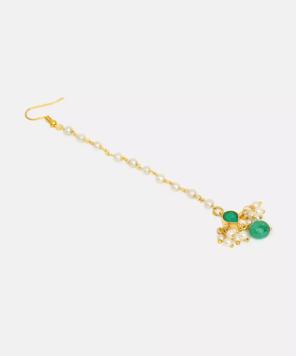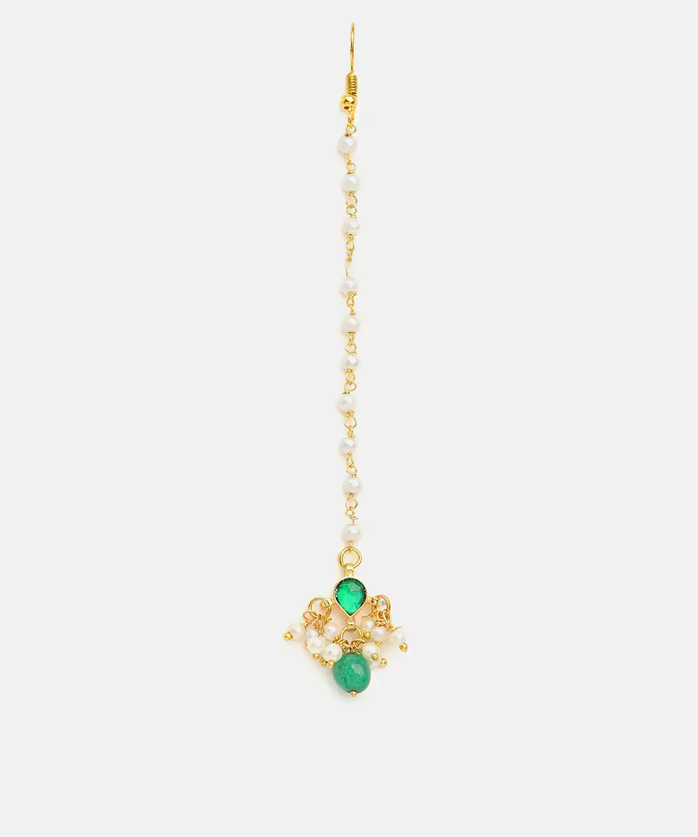 This Elegant Gold Plated Kundan Maang Tikka Showcases Radiant Green Stones In A Traditional Design. Its Detailed Craftsmanship Creates A Regal Focal Point On The Forehead. Ideal For Festive And Bridal Wear, It Complements Sarees And Lehengas With Sophistication And Cultural Beauty.