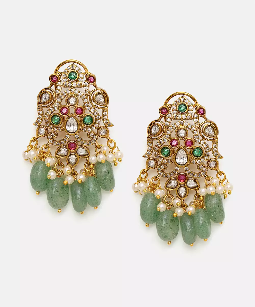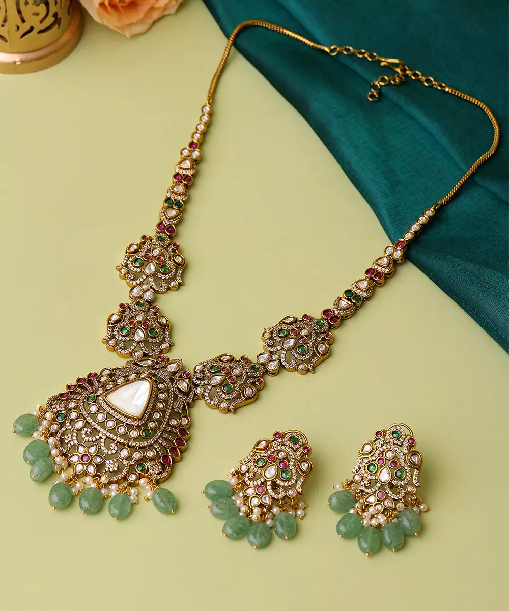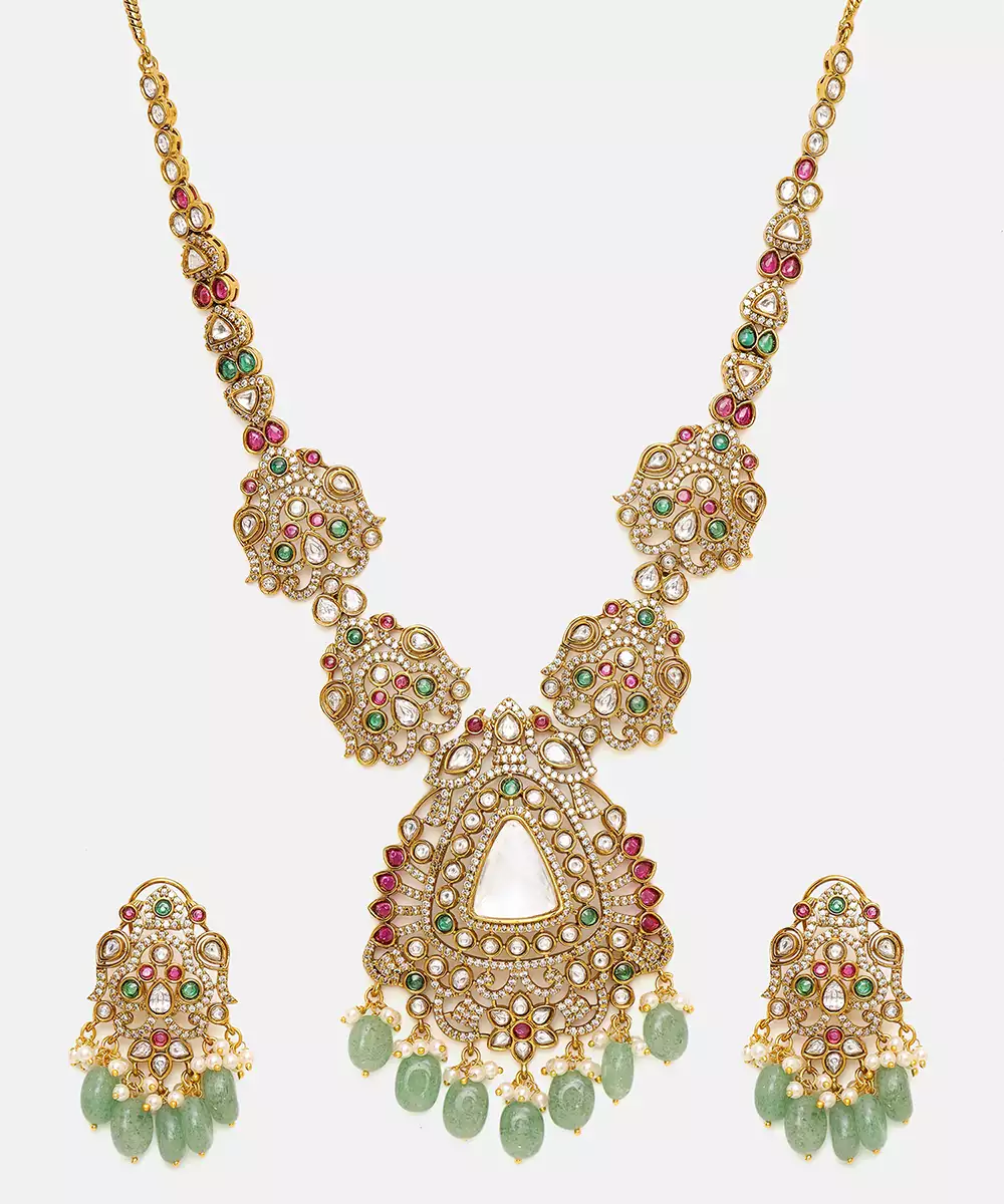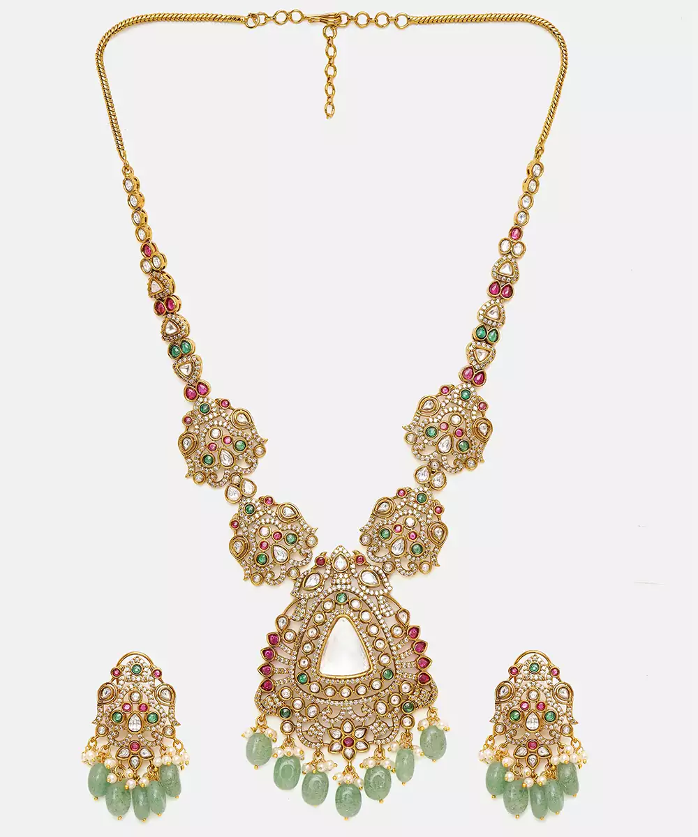 This Gold Plated Kundan Green Stones Necklace Set Radiates Regal Elegance With Its Intricate Craftsmanship And Rich Detailing. Adorned With Classic Kundan Work And Vibrant Green Accents, It Adds A Festive, Traditional Charm. Perfect For Weddings, Celebrations, And Special Occasions, It Beautifully Complements Ethnic And Bridal Ensembles With Timeless Sophistication.