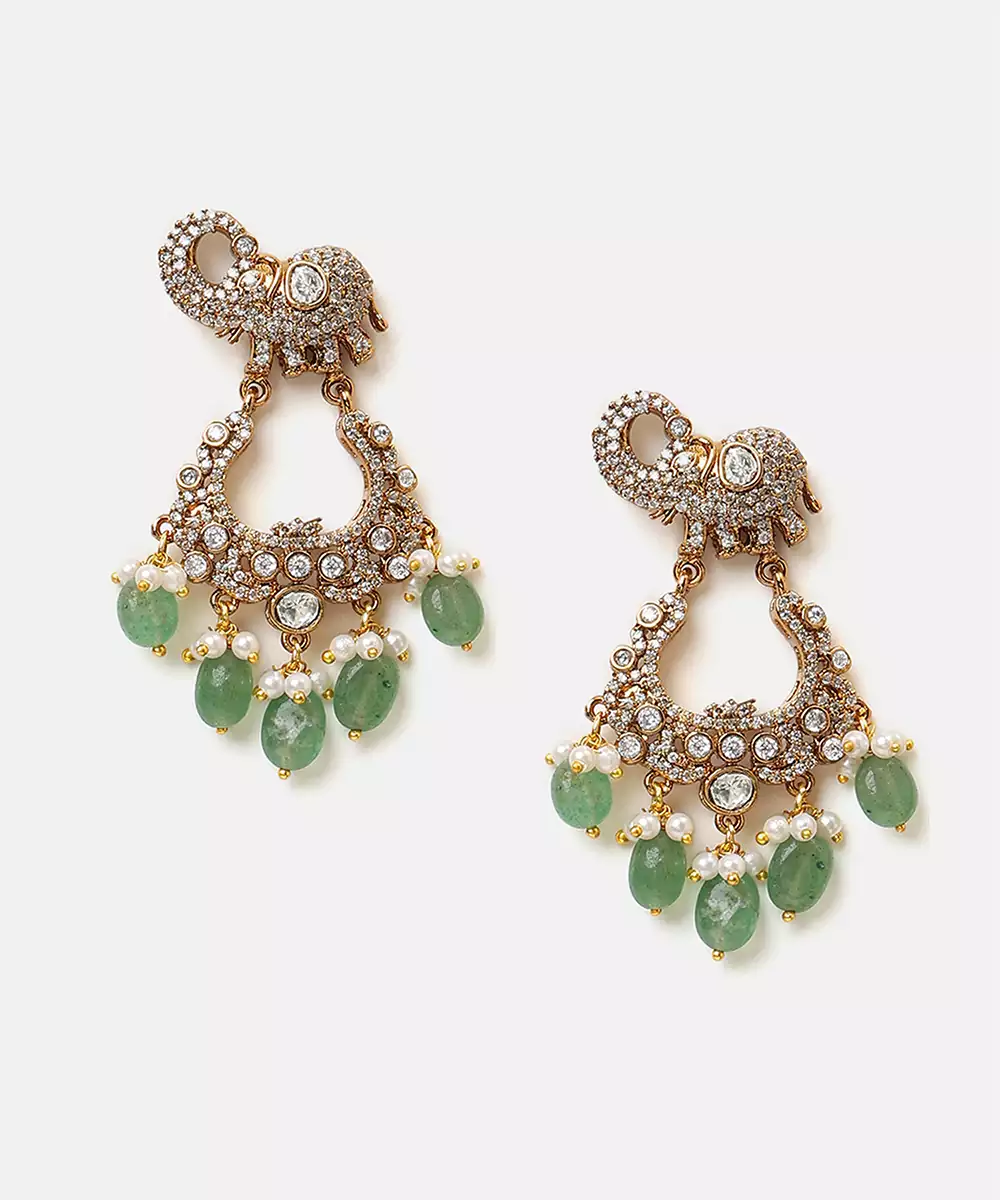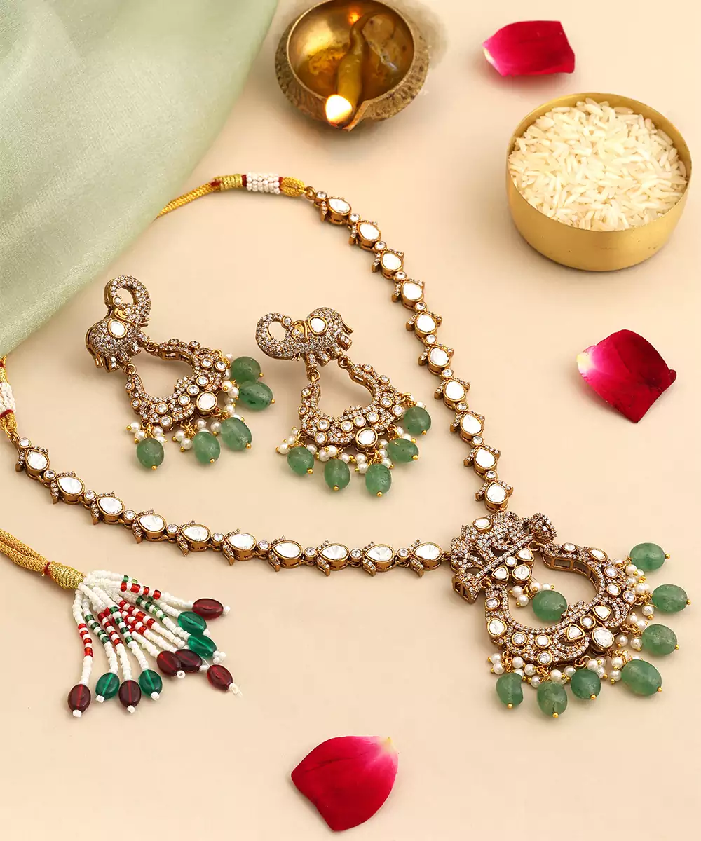 This Gold Plated Kundan Green Stones Necklace Set Exudes Regal Elegance And Refined Craftsmanship. Designed With Vibrant Green Stones And Traditional Kundan Work, It Adds Richness To Bridal And Festive Wear. Perfect For Weddings And Special Occasions, This Necklace Set Beautifully Complements Sarees And Lehengas.