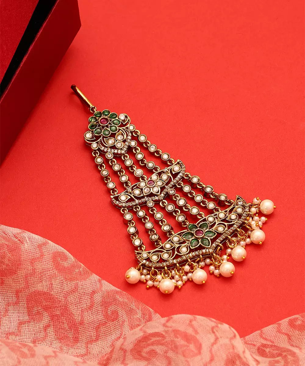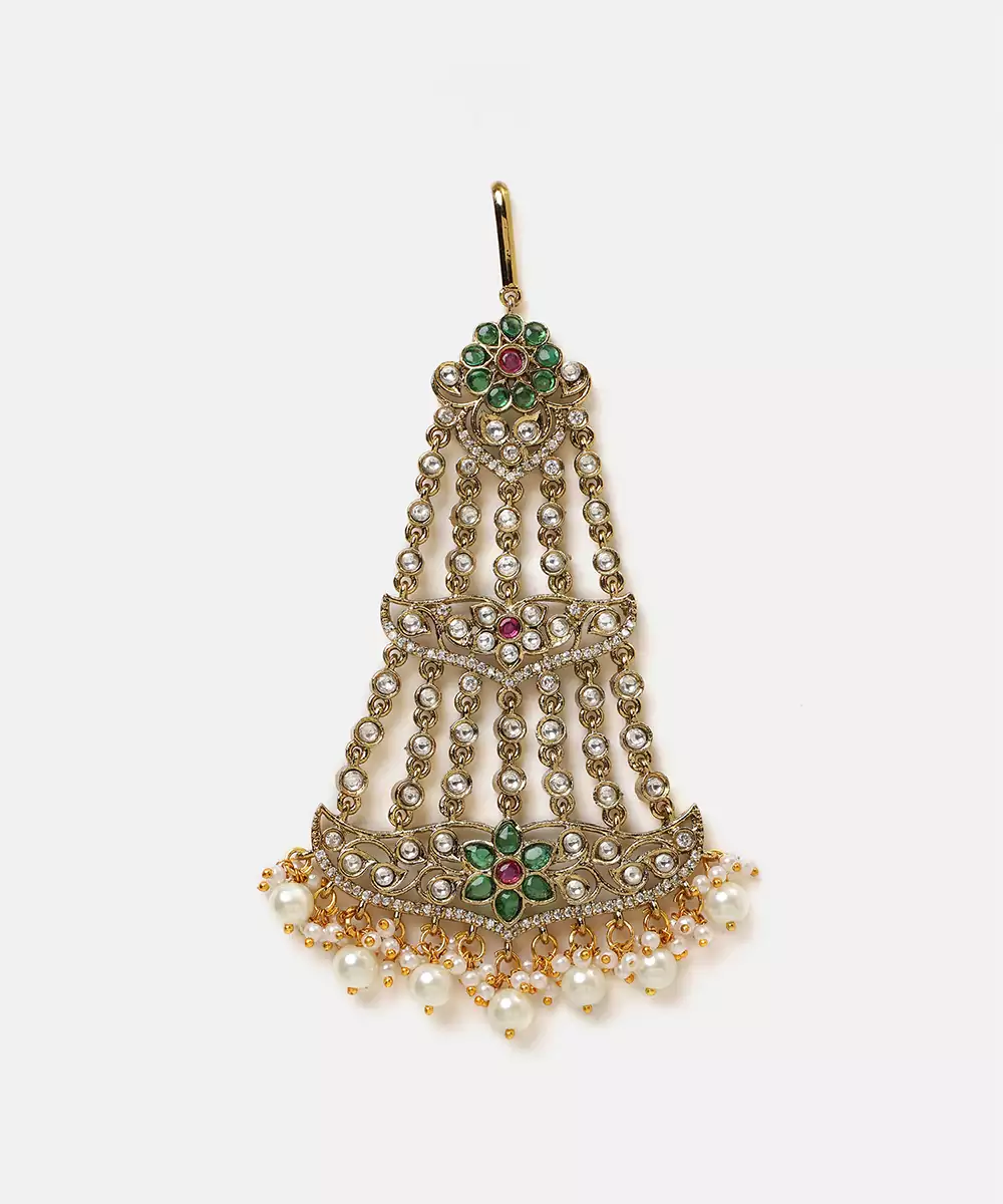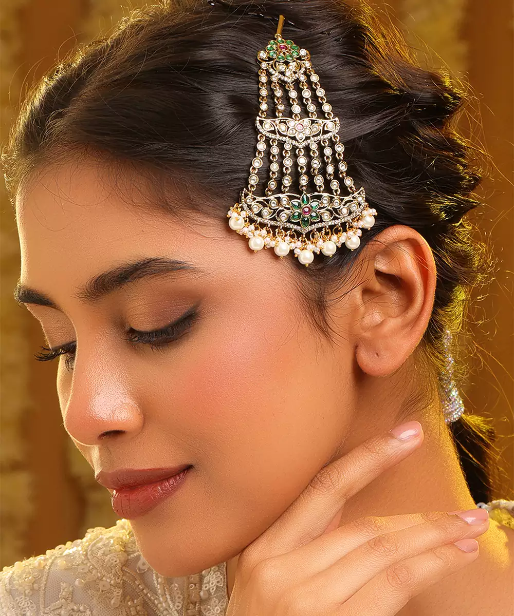 This Gold Plated Kundan Green Stones Passa Reflects Royal Heritage And Elegant Craftsmanship. Adorned With Vibrant Green Stones And Kundan Detailing, It Adds A Majestic Side Head Ornament To Bridal Styling. Perfect For Weddings And Festive Occasions, This Passa Beautifully Enhances Lehengas And Traditional Attire.