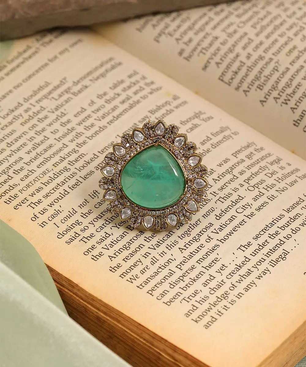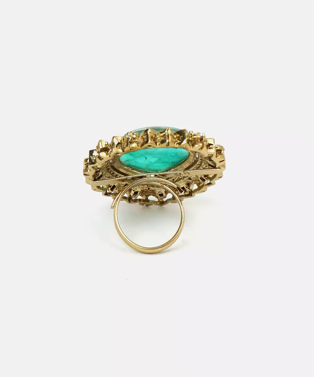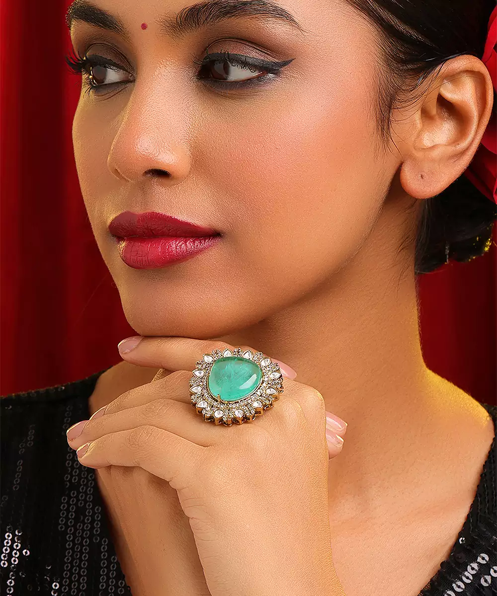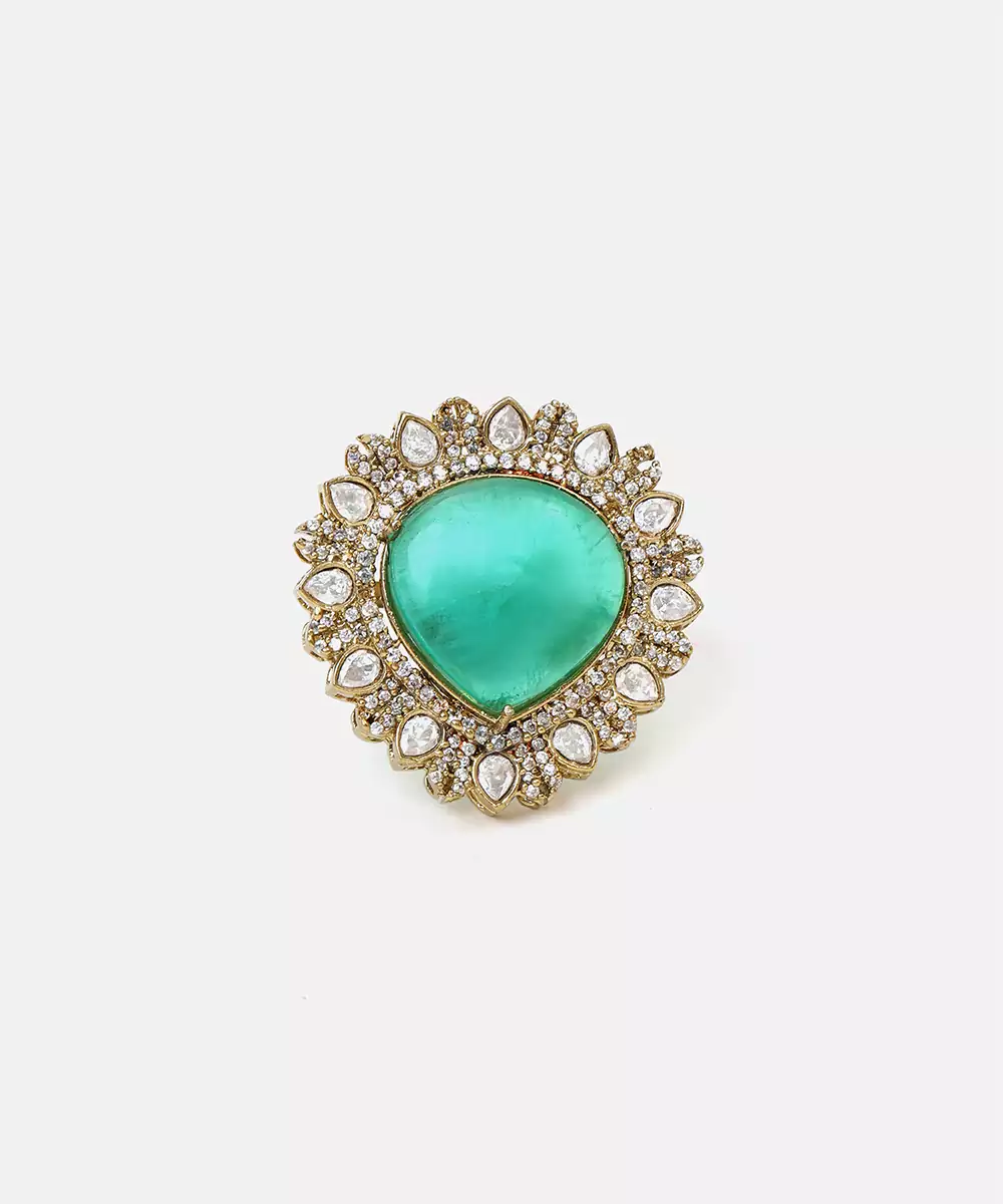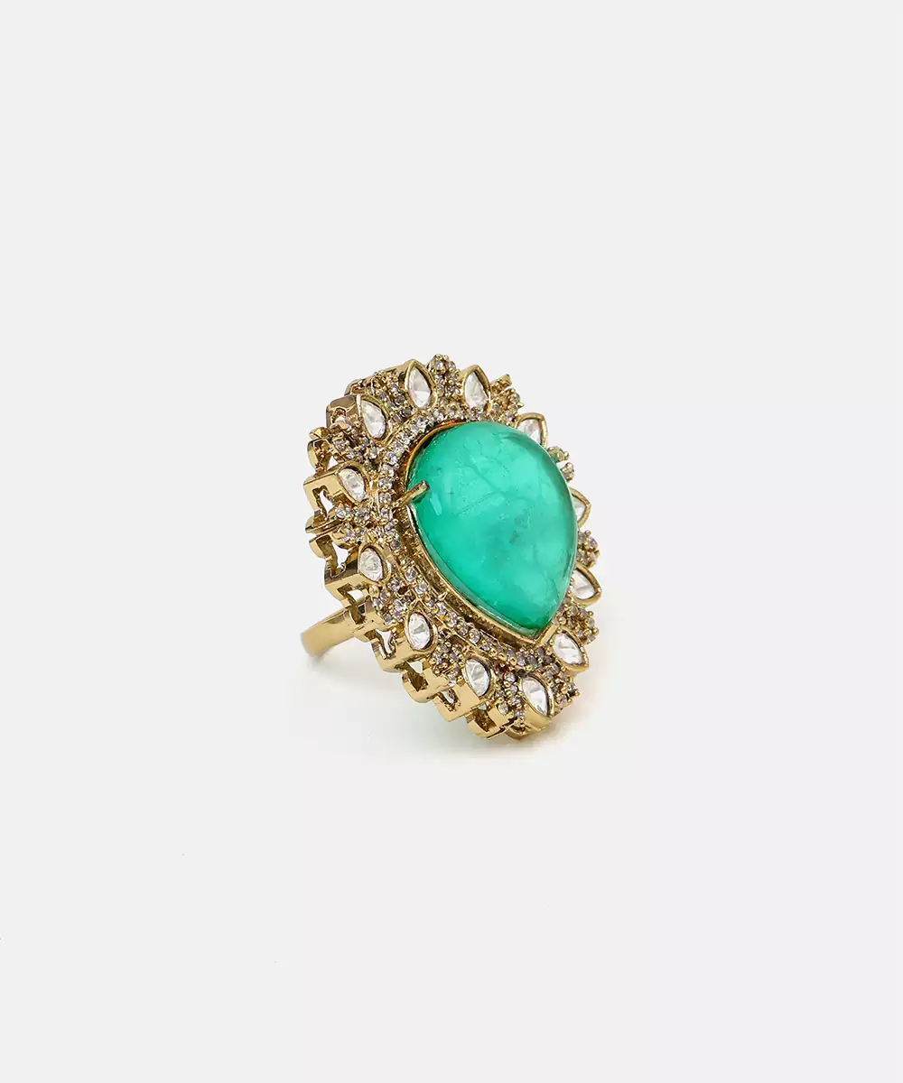 This Gold Plated Kundan Green Stones Ring Showcases Regal Elegance And Traditional Artistry. Crafted With Classic Kundan Work And Vibrant Green Stones, It Adds A Rich Pop Of Color And Sophistication. Ideal For Weddings, Festive Celebrations, Or Special Occasions, This Ring Beautifully Complements Ethnic And Fusion Outfits With Timeless Charm.