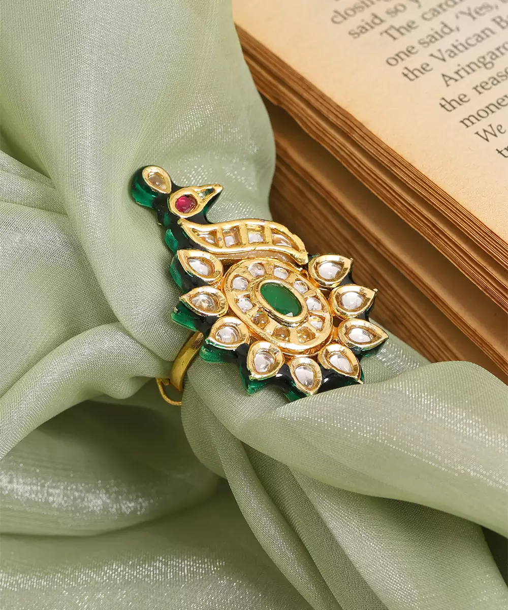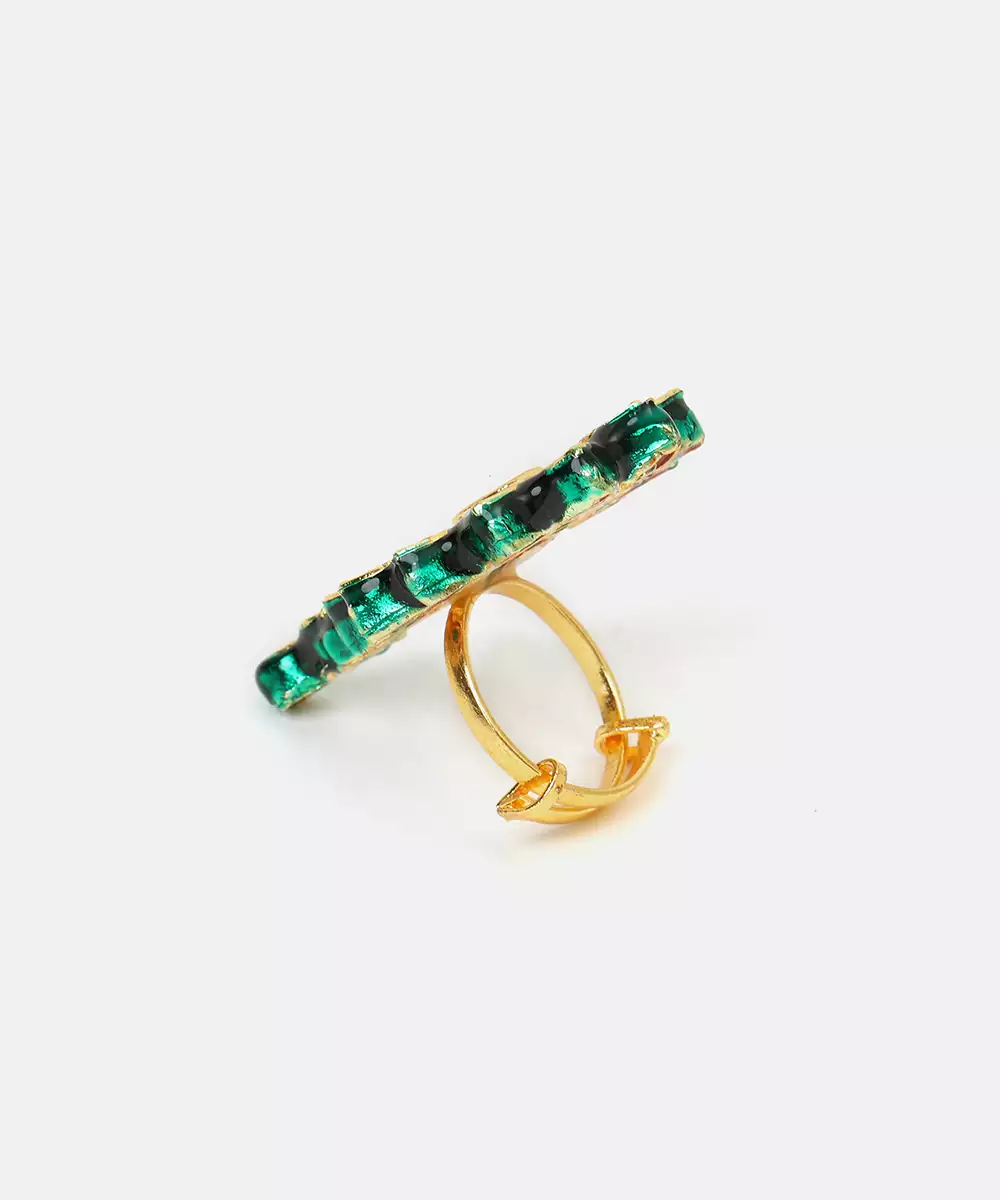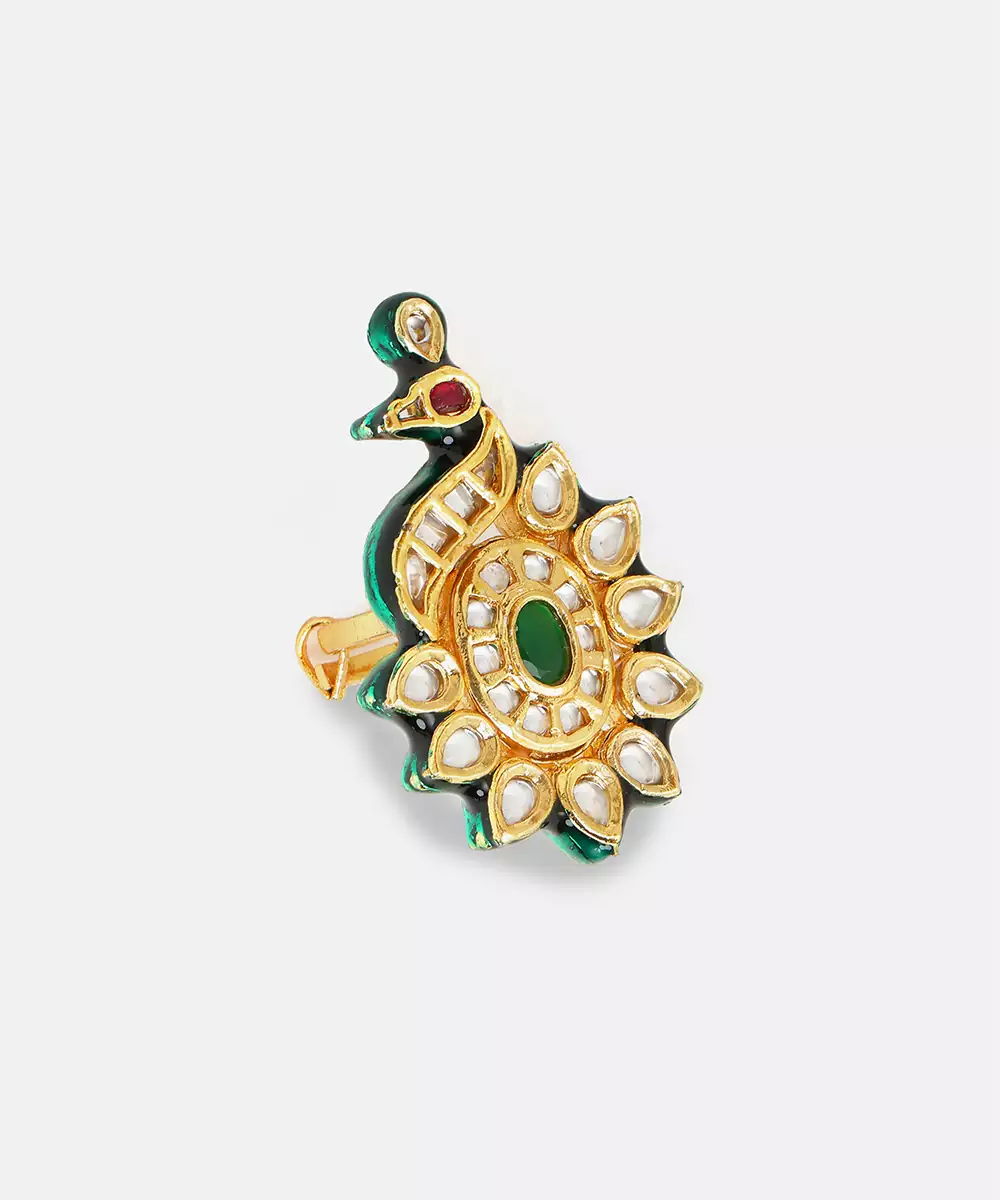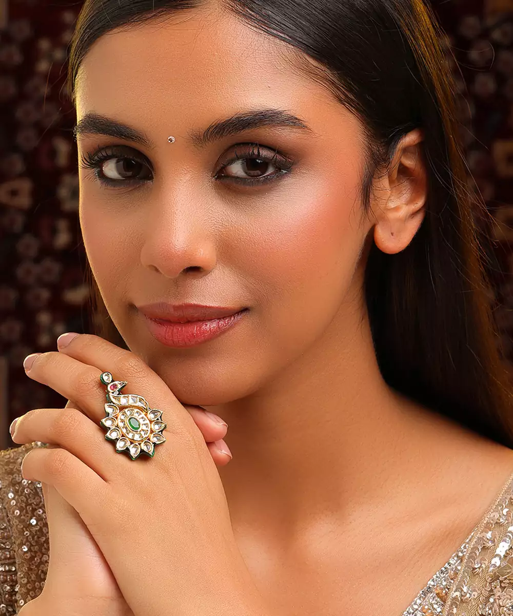 This Gold Plated Kundan Green Stones Ring Showcases Regal Elegance And Traditional Artistry. Crafted With Classic Kundan Work And Vibrant Green Stones, It Adds A Rich Pop Of Color And Sophistication. Ideal For Weddings, Festive Celebrations, Or Special Occasions, This Ring Beautifully Complements Ethnic And Fusion Outfits With Timeless Charm.
