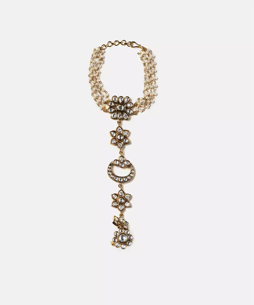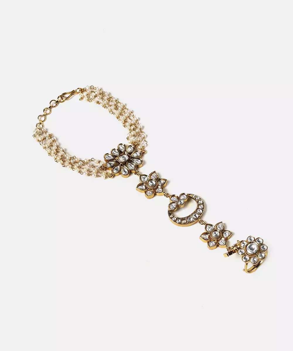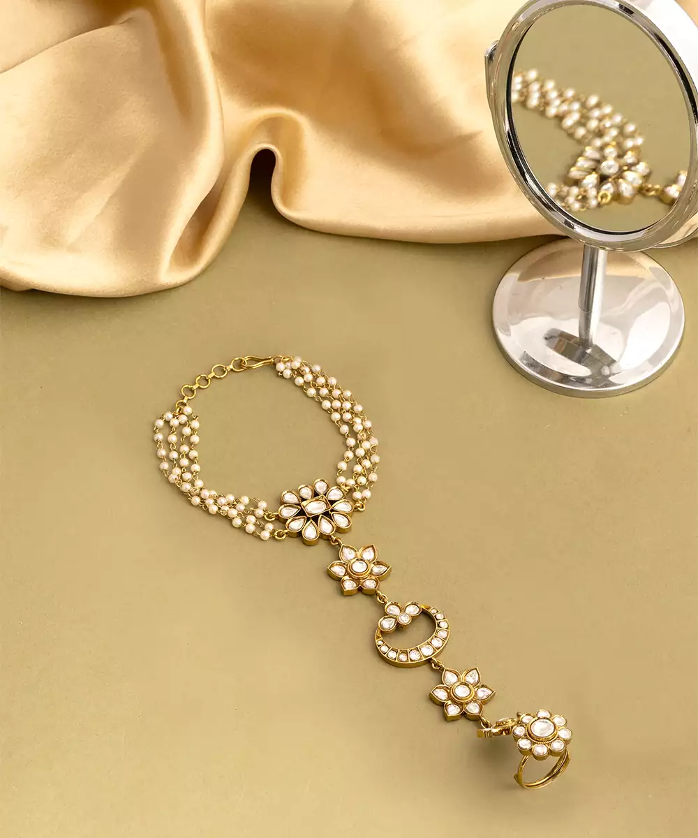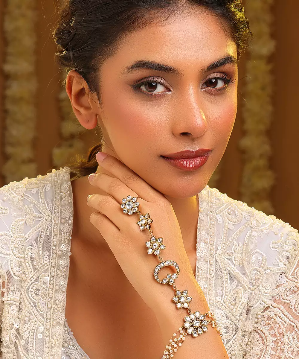 This Gold Plated Kundan Haath Phool Reflects Timeless Craftsmanship And Feminine Grace. Designed With Intricate Kundan Detailing, It Beautifully Adorns The Hand With A Connected Ring And Bracelet Pattern. Ideal For Bridal And Festive Wear, It Enhances Traditional Outfits With Elegance And Refined Sophistication.