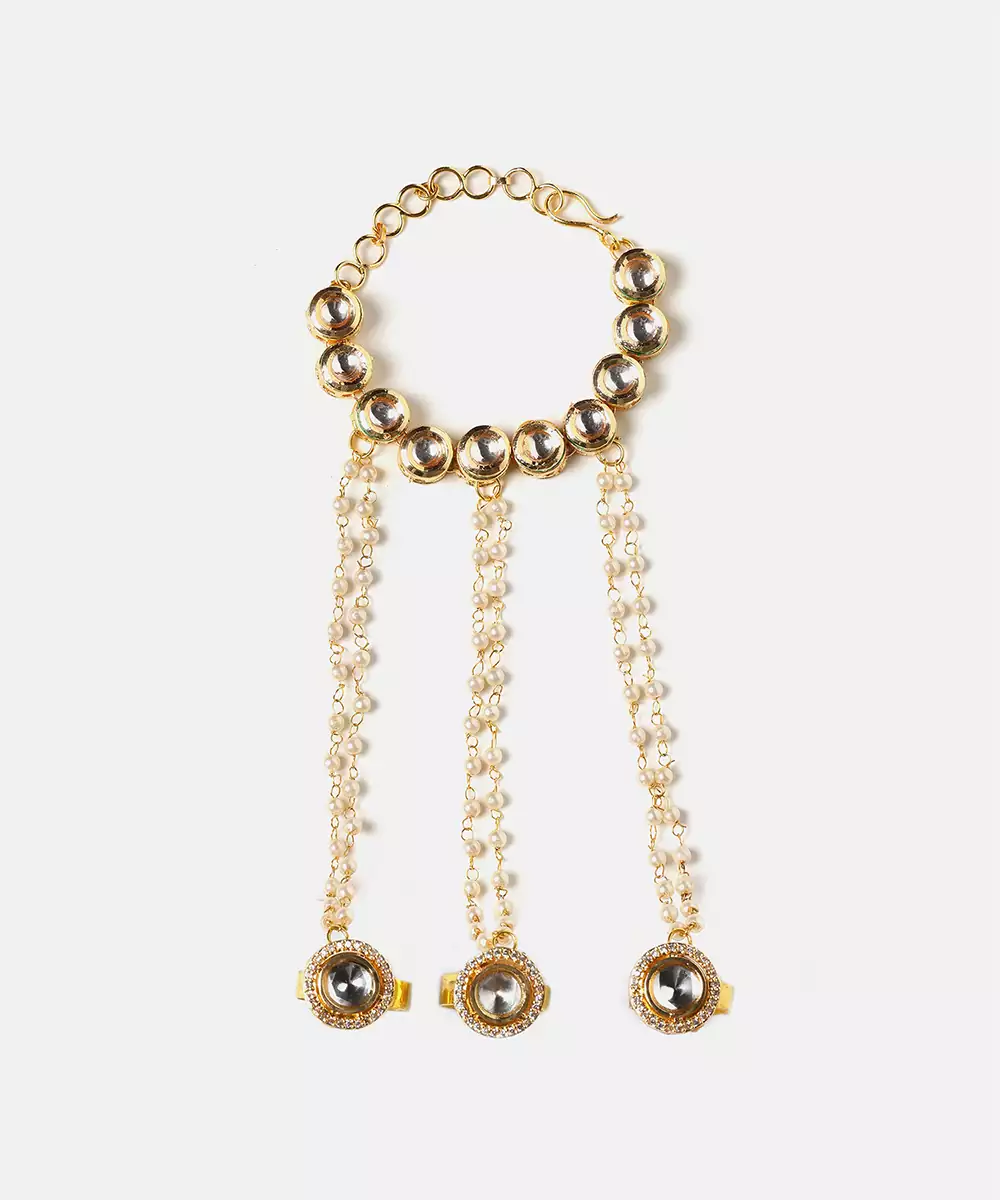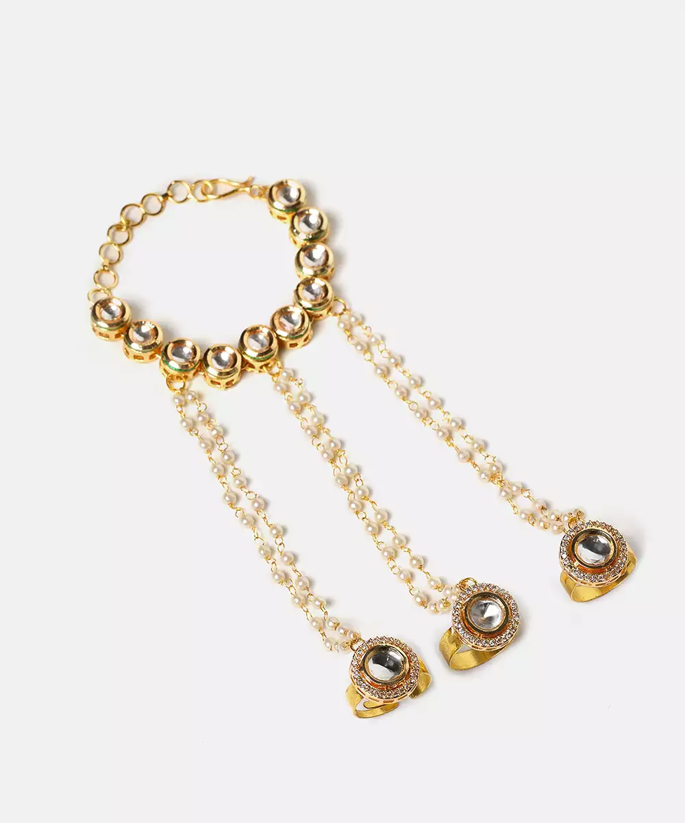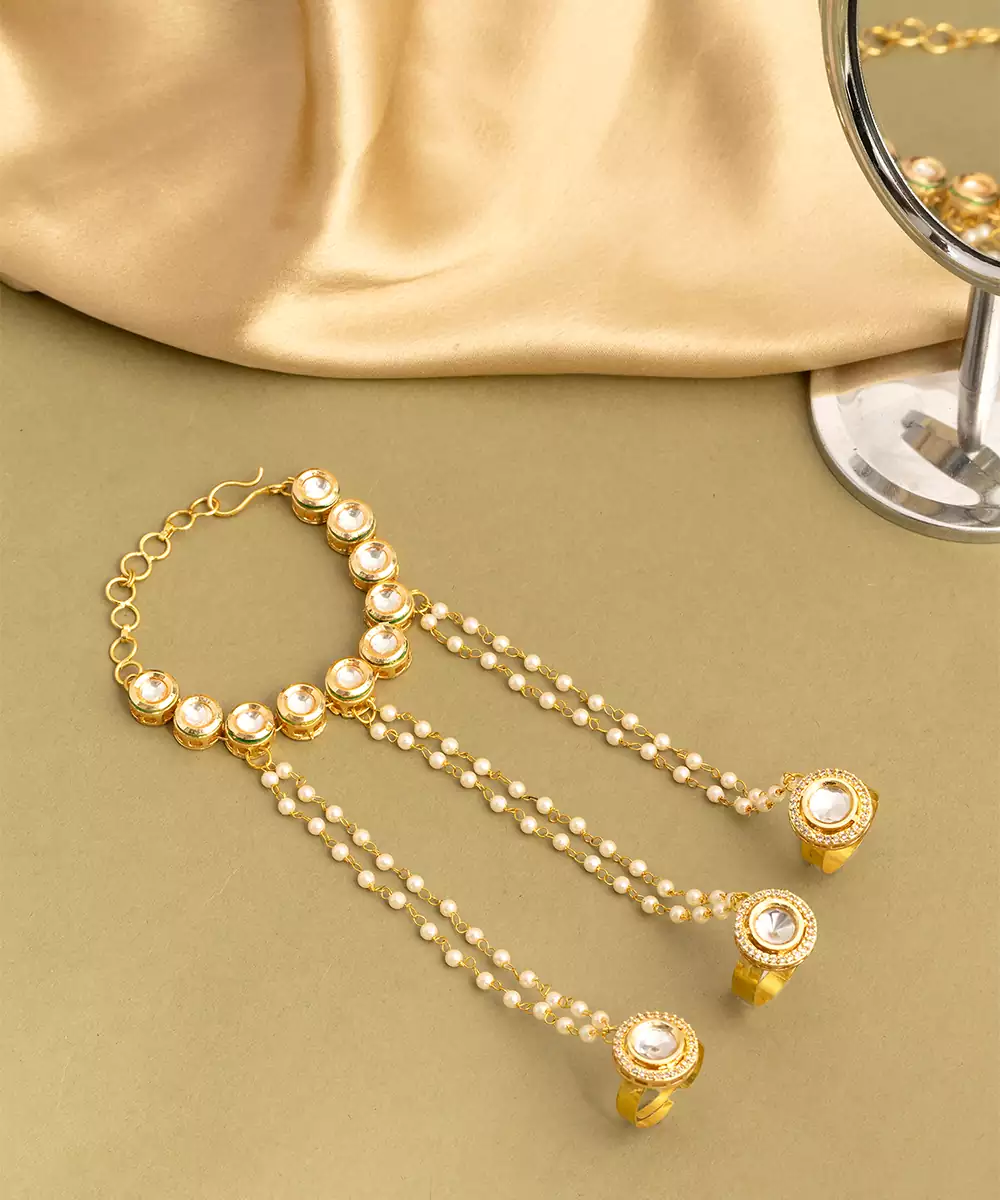 This Gold Plated Kundan Haath Phool Reflects Timeless Craftsmanship And Feminine Grace. Designed With Intricate Kundan Detailing, It Beautifully Adorns The Hand With A Connected Ring And Bracelet Pattern. Ideal For Bridal And Festive Wear, It Enhances Traditional Outfits With Elegance And Refined Sophistication.