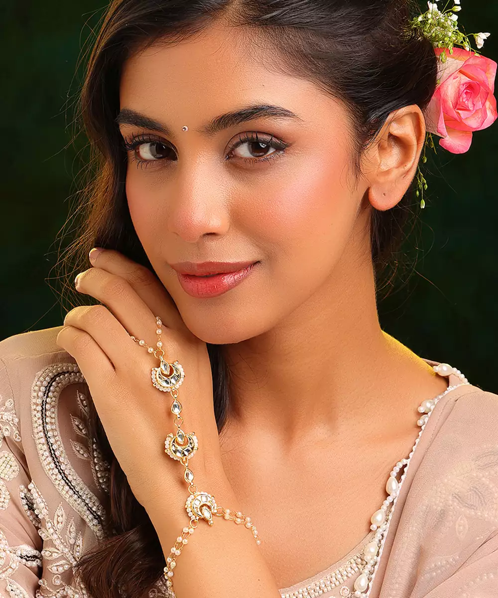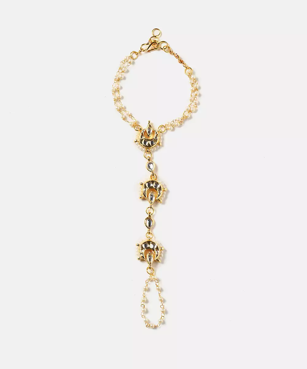 This Gold Plated Kundan Haath Phool Reflects Timeless Craftsmanship And Feminine Grace. Designed With Intricate Kundan Detailing, It Beautifully Adorns The Hand With A Connected Ring And Bracelet Pattern. Ideal For Bridal And Festive Wear, It Enhances Traditional Outfits With Elegance And Refined Sophistication.