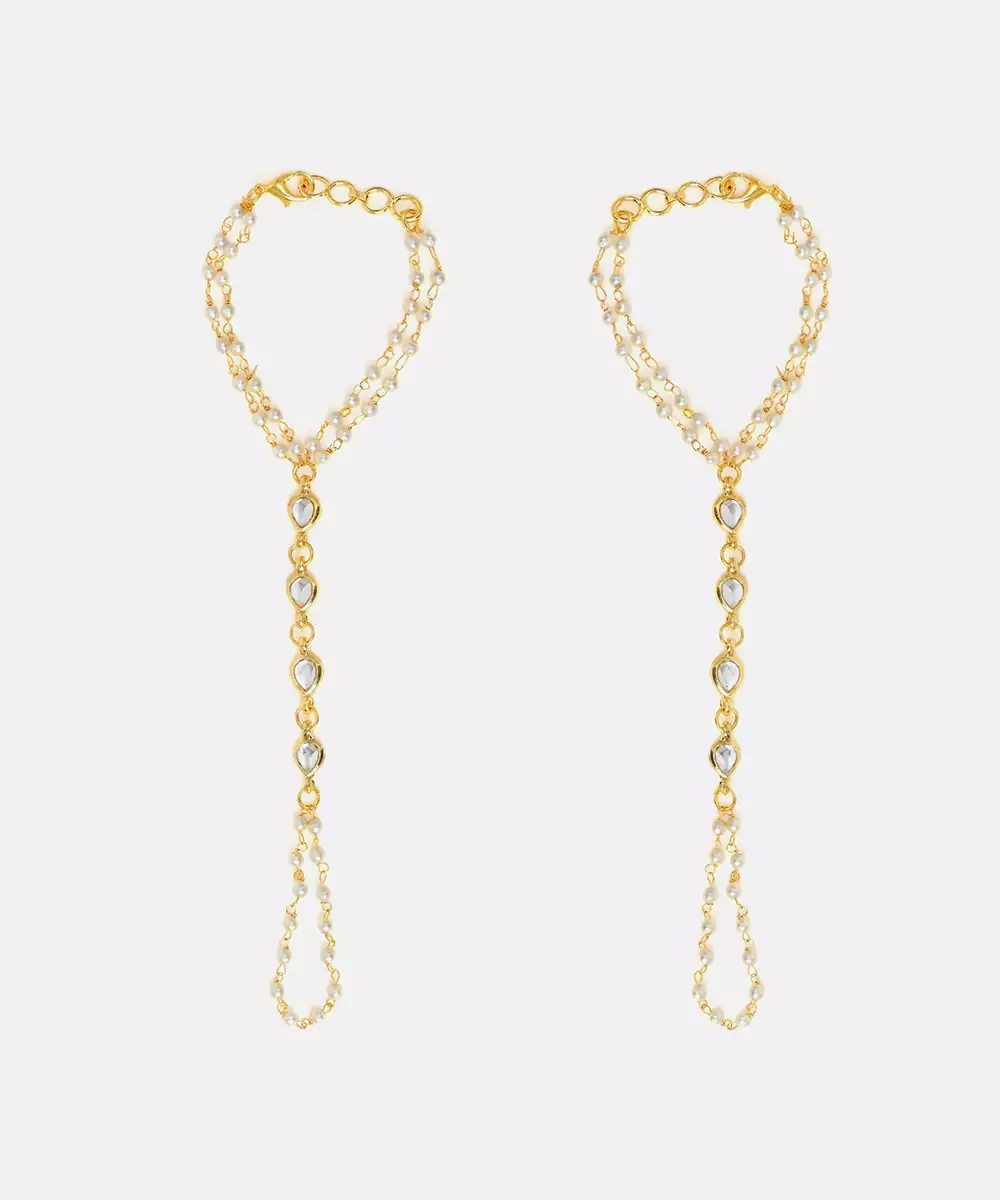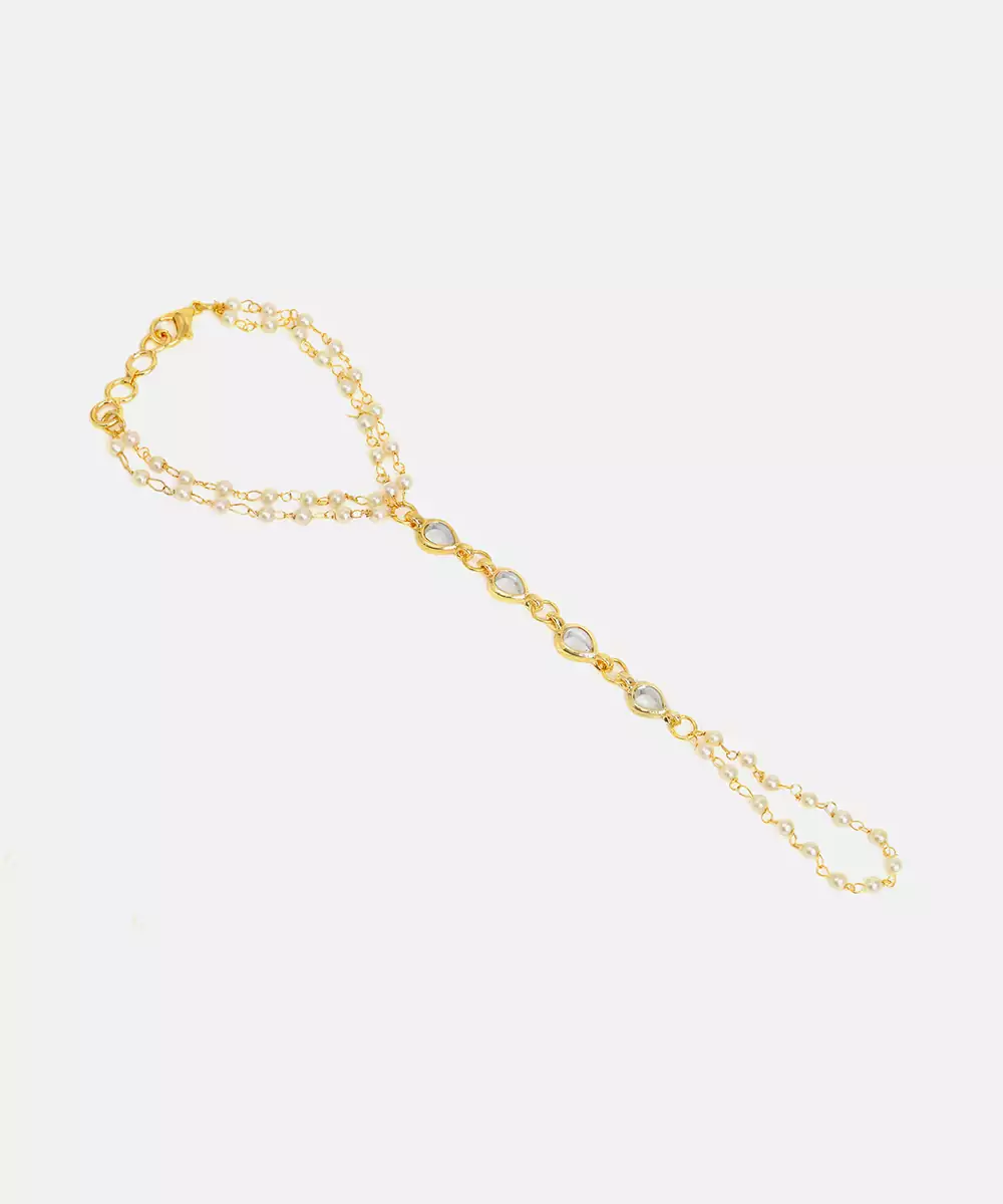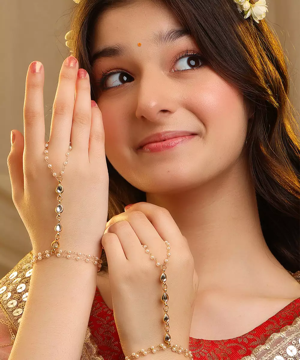 This Gold Plated Kundan Haath Phool Showcases Classic Craftsmanship With A Graceful Design Linking Ring And Bracelet. Its Elegant Detailing Enhances Festive And Bridal Outfits Effortlessly. Comfortable To Wear And Visually Striking, It Adds Charm To Hand Adornment And Completes Traditional Ensembles With Refined Sophistication.