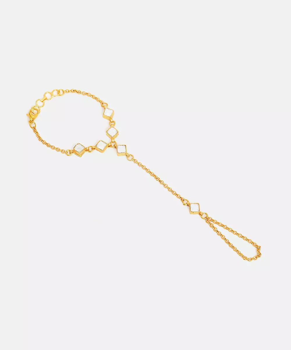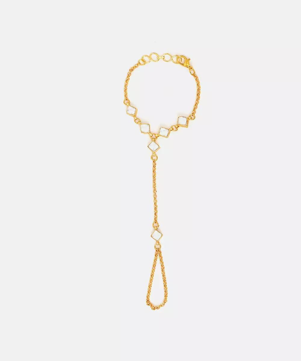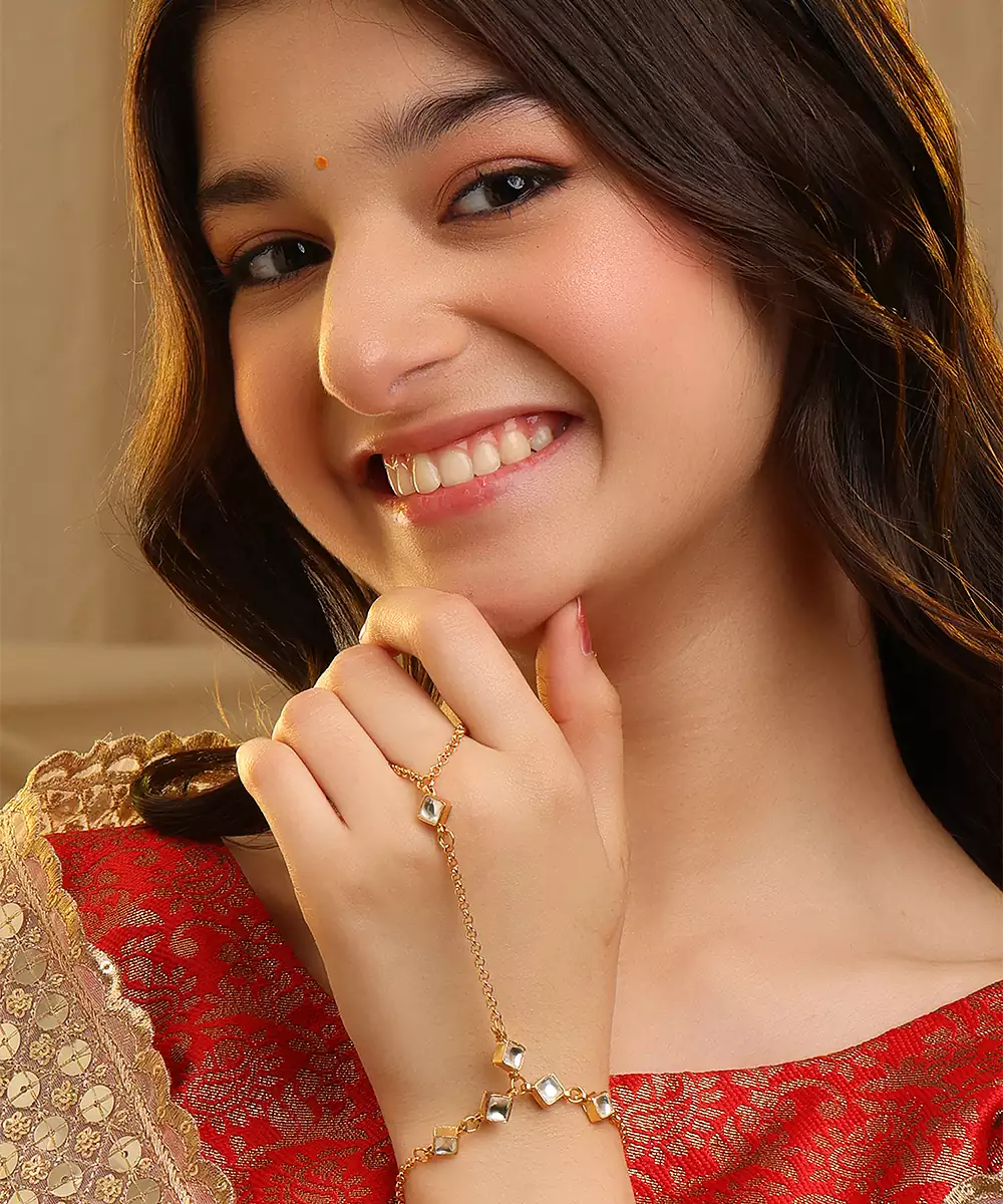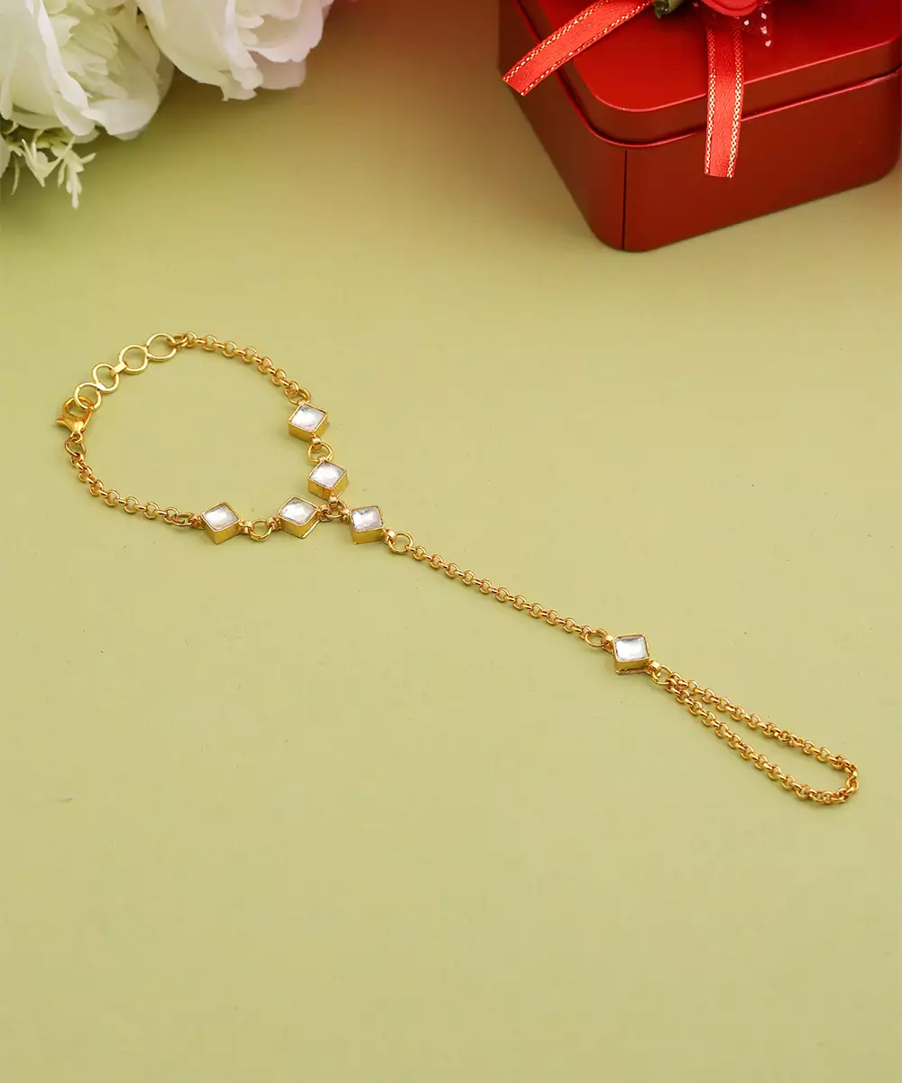 This Gold Plated Kundan Haath Phool Features A Classic Traditional Design Connecting Ring And Bracelet With Elegant Detailing. Crafted For Festive And Bridal Wear, It Enhances Hand Movements Beautifully. Comfortable And Lightweight, It Pairs Perfectly With Ethnic Outfits, Adding Timeless Charm And Graceful Sophistication.