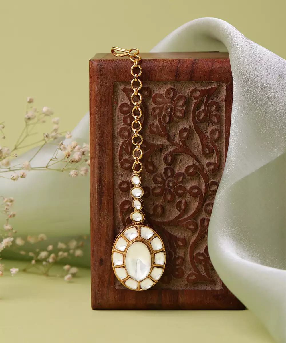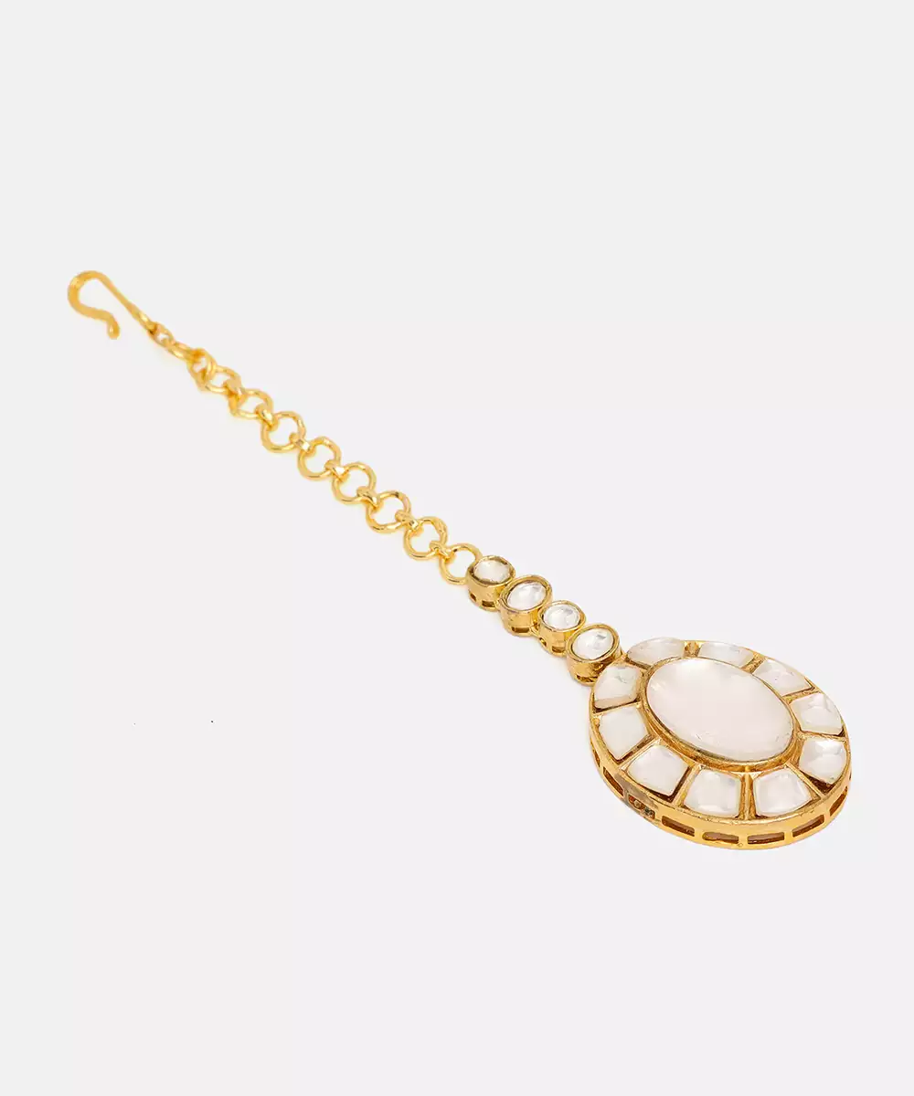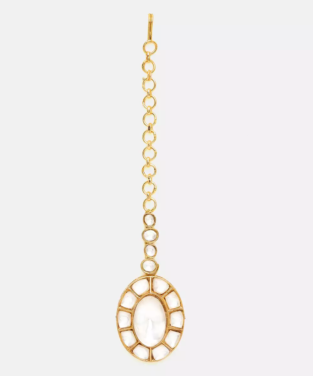 This Gold Plated Kundan Maang Tikka Exudes Timeless Elegance With Its Intricate Craftsmanship And Classic Design. Adorned With Shimmering Kundan Stones In Soft White Tones, It Adds A Regal, Festive Touch. Perfect For Weddings, Celebrations, And Special Occasions, It Beautifully Complements Traditional Bridal And Ethnic Ensembles.