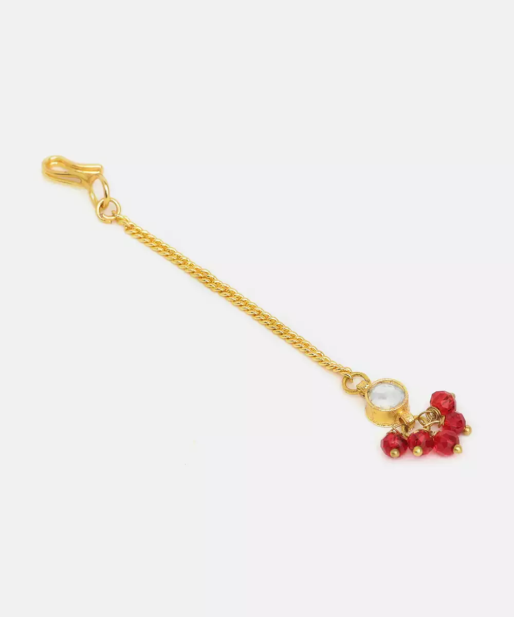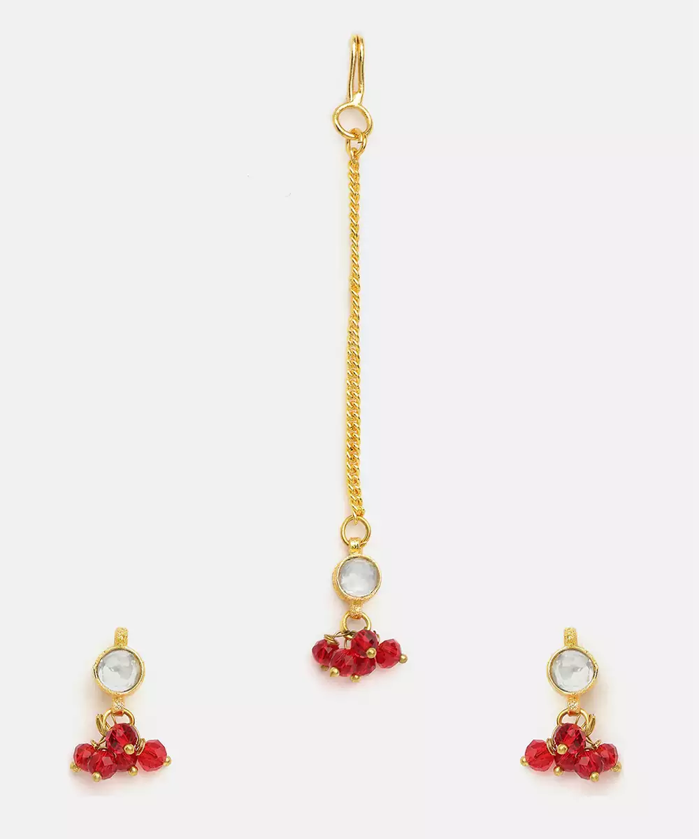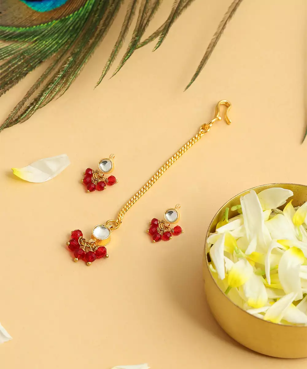 Featuring Deep Maroon Stones, This Gold Plated Kundan Maang Tikka Offers A Royal And Sophisticated Appeal. Intricate Detailing Reflects Traditional Artistry While Adding Richness To Bridal And Festive Looks. Perfect For Sarees And Lehengas, It Creates A Striking Focal Point For Your Hairstyle.