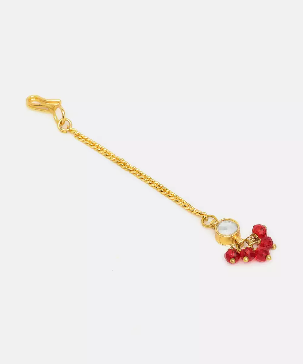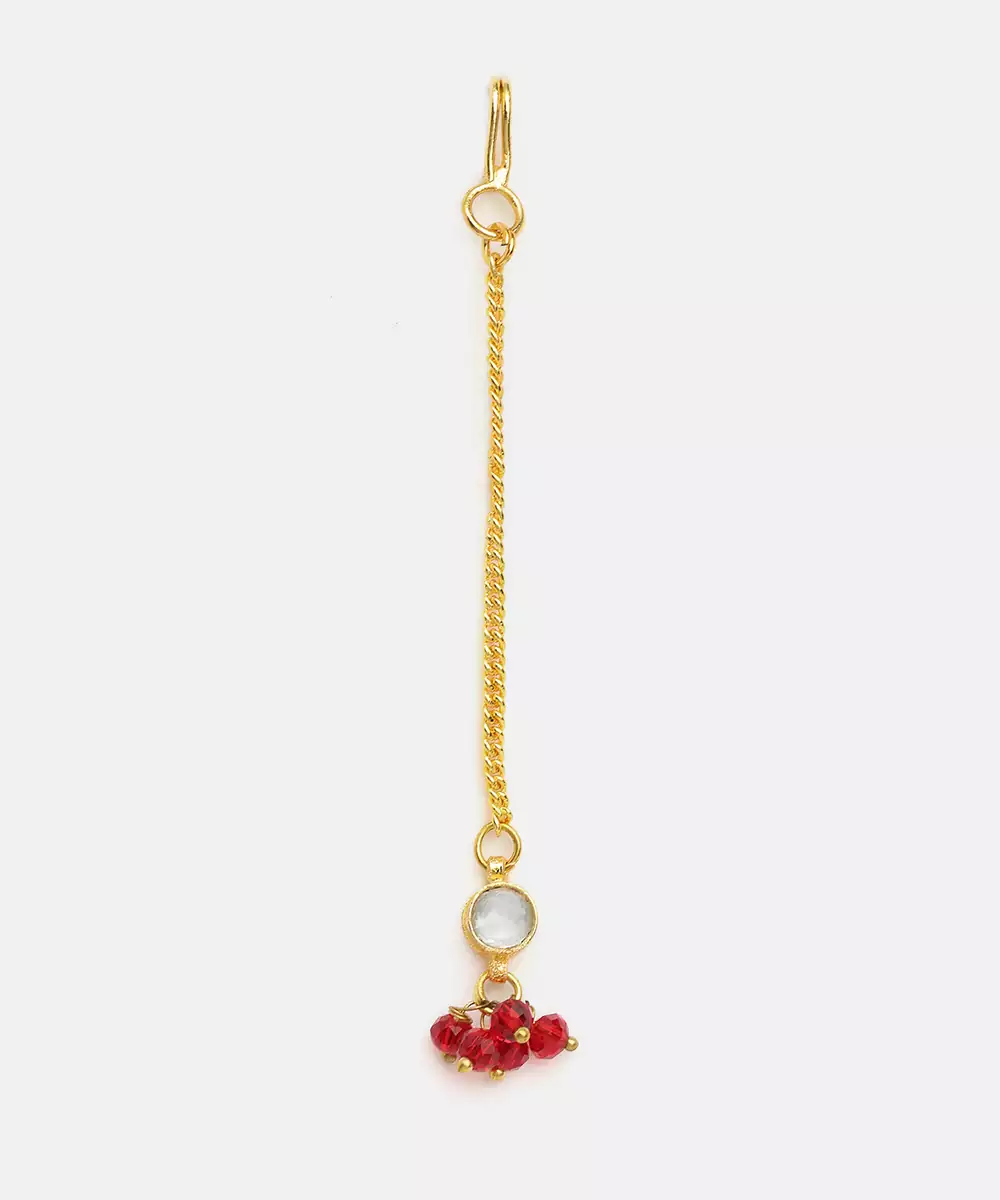 This Beautifully Designed Gold Plated Kundan Maang Tikka Features Maroon Stones For A Deep, Elegant Finish. Crafted With Precision, It Highlights Cultural Craftsmanship While Adding Richness To Ethnic Ensembles. Perfect For Weddings And Festive Events, It Offers A Royal And Sophisticated Appeal.