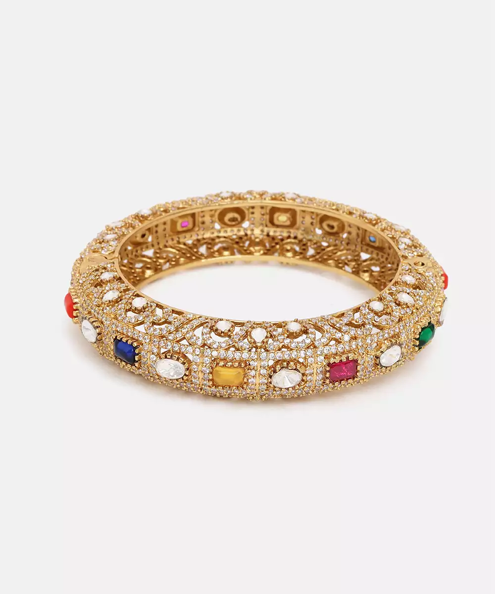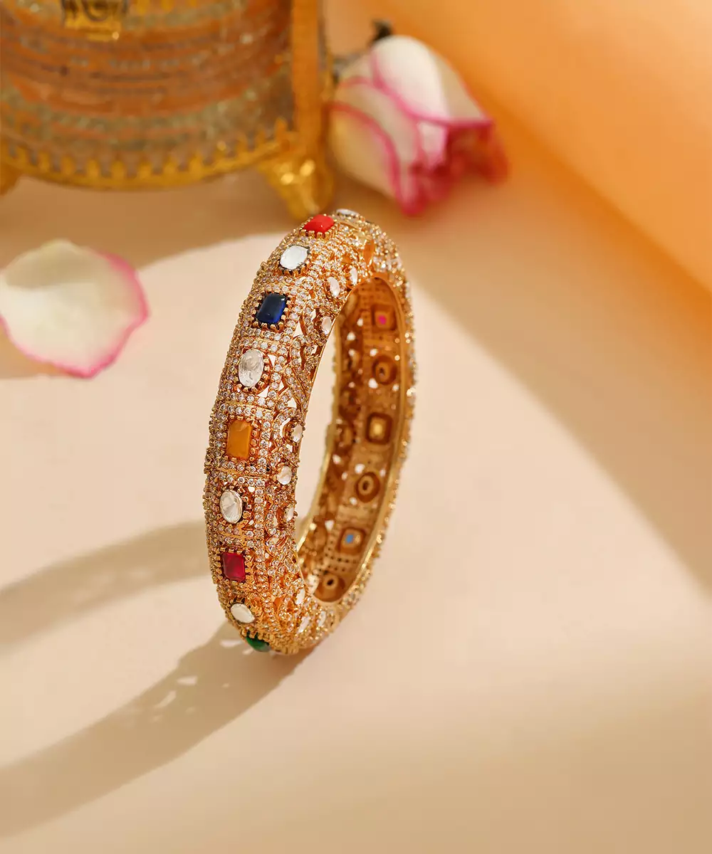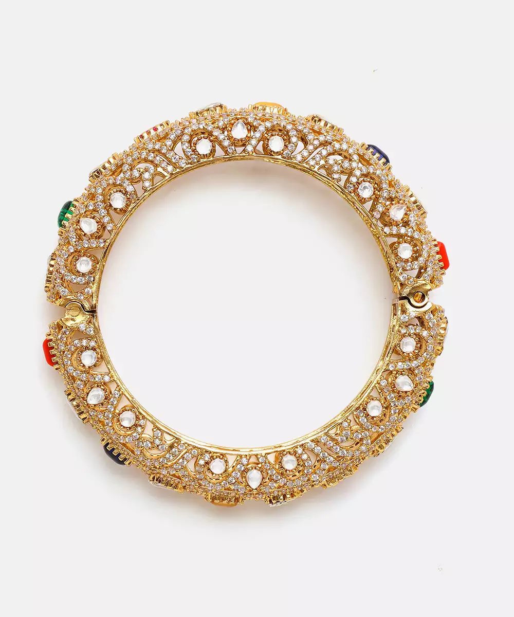 This Gold Plated Kundan Multicolor Stone Bangle Radiates Vibrant Elegance With Its Intricate Craftsmanship And Rich Detailing. Embellished With Classic Kundan Work And Colorful Accents, It Adds A Festive, Regal Touch. Perfect For Weddings, Celebrations, And Special Occasions, It Beautifully Enhances Traditional And Ethnic Ensembles With Timeless Charm And Sophistication.