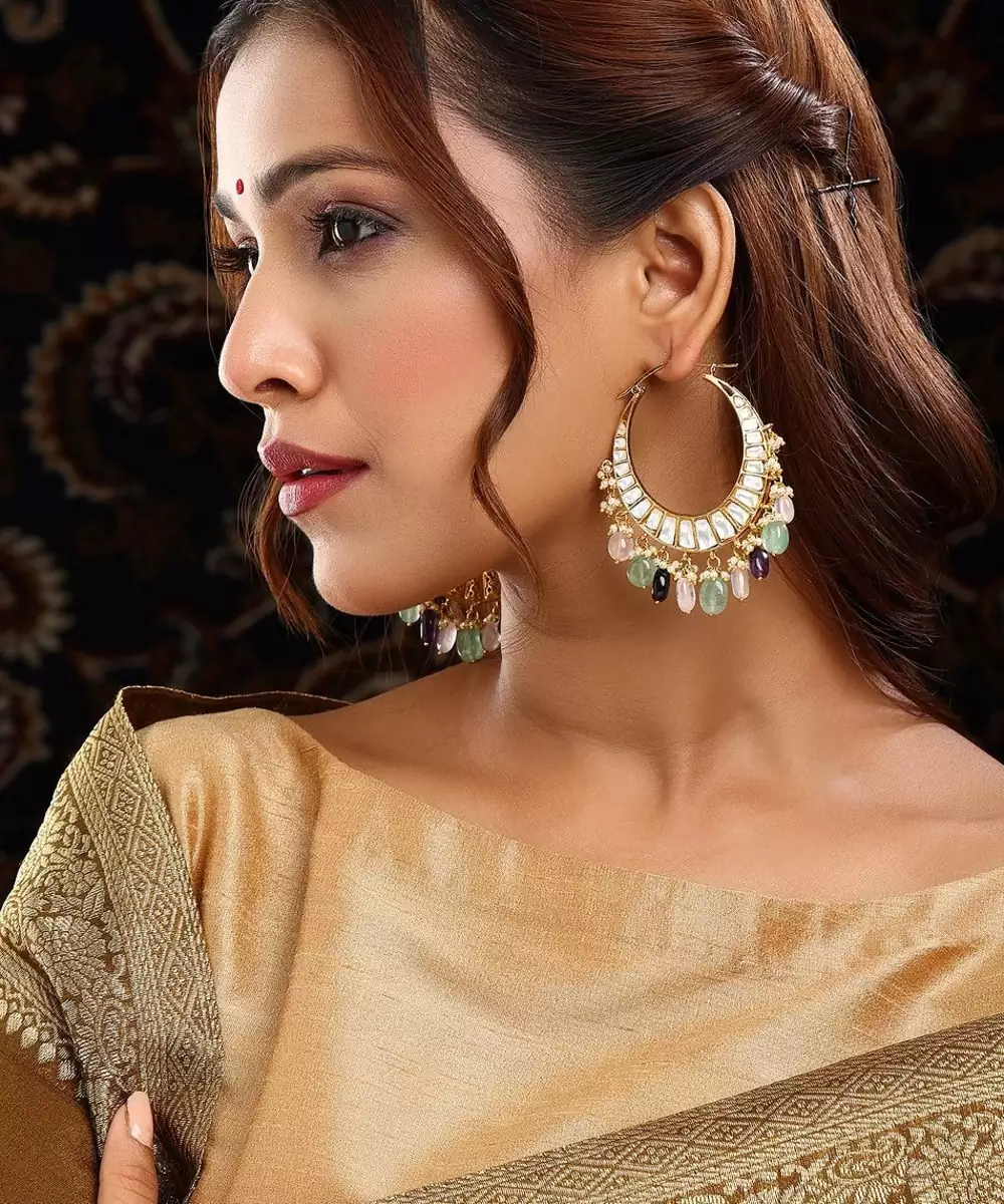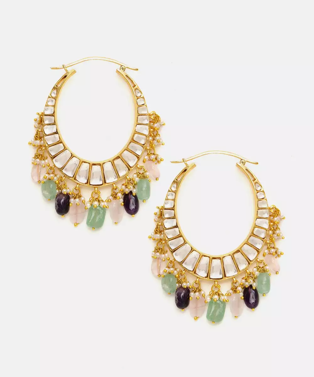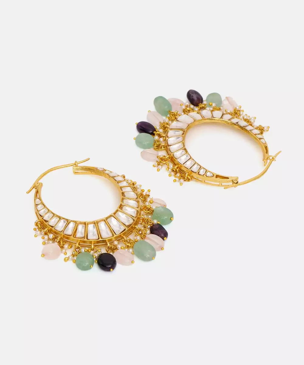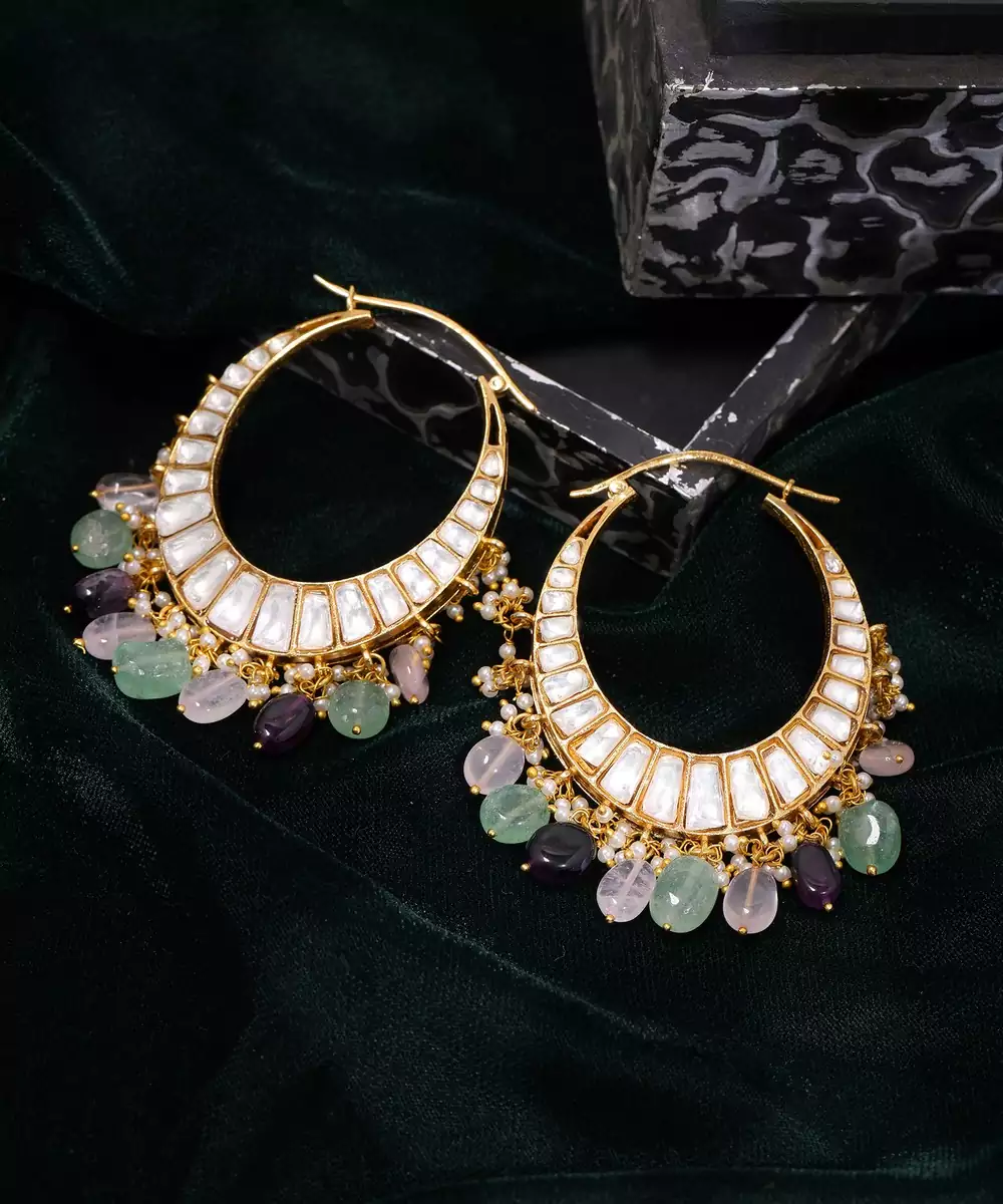 Gold Plated Kundan Multicolor Stone Hoop Earrings