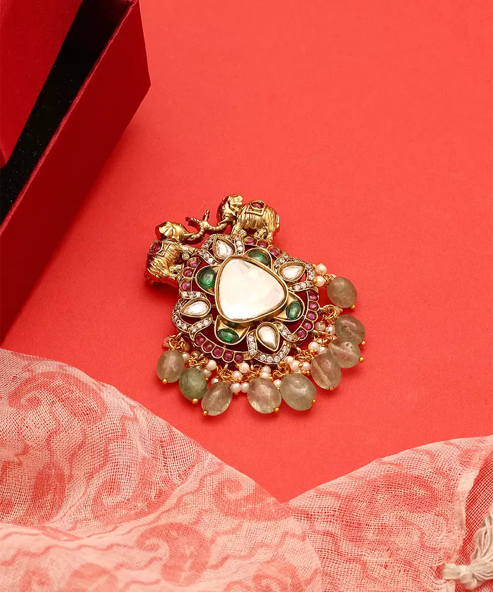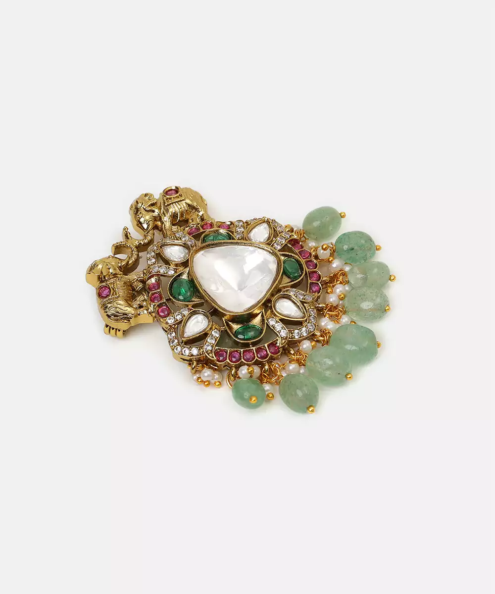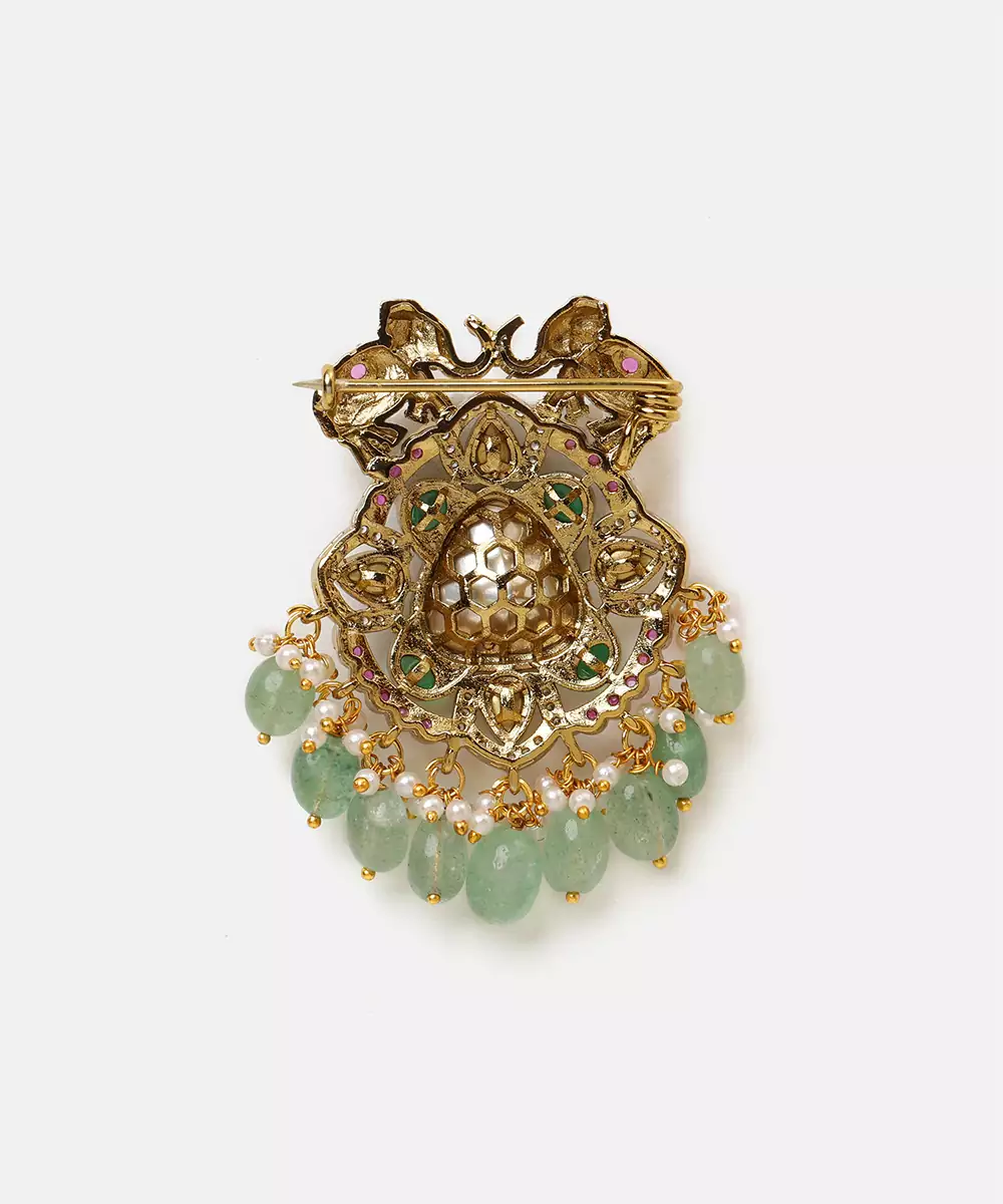This Gold Plated Kundan Multicolor Stones Brooch Features Vibrant Hues And Intricate Craftsmanship. Embellished With Multicolor Stones And Traditional Kundan Work, It Brings A Lively And Royal Charm To Any Outfit. Ideal For Festive Occasions And Weddings, This Brooch Complements Sherwanis, Bandhgalas, And Ethnic Wear.