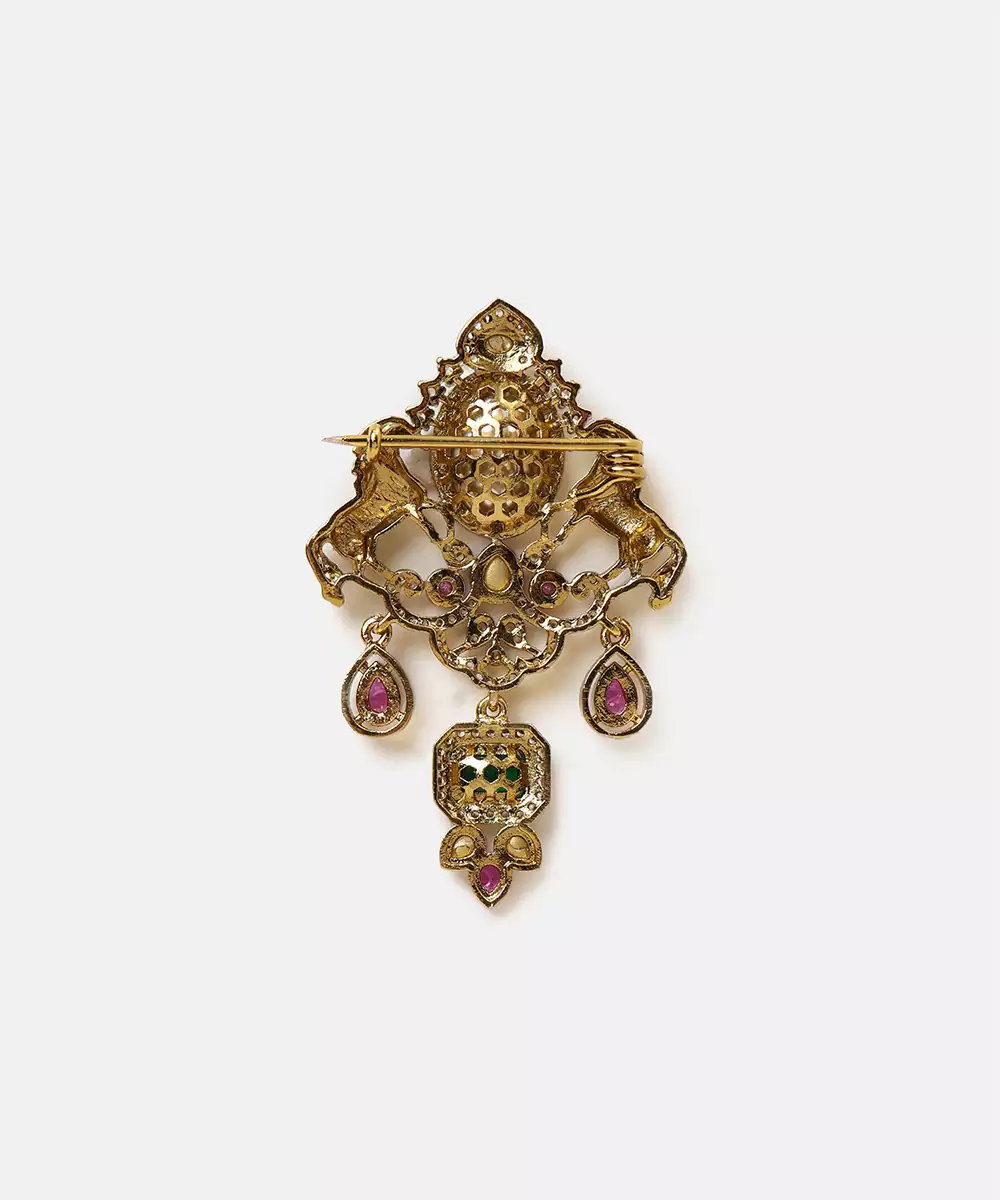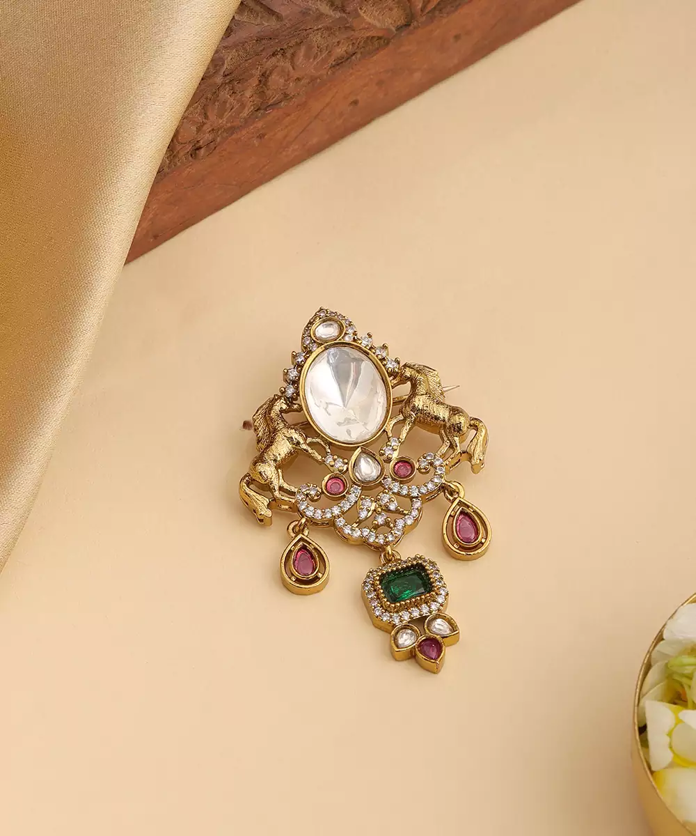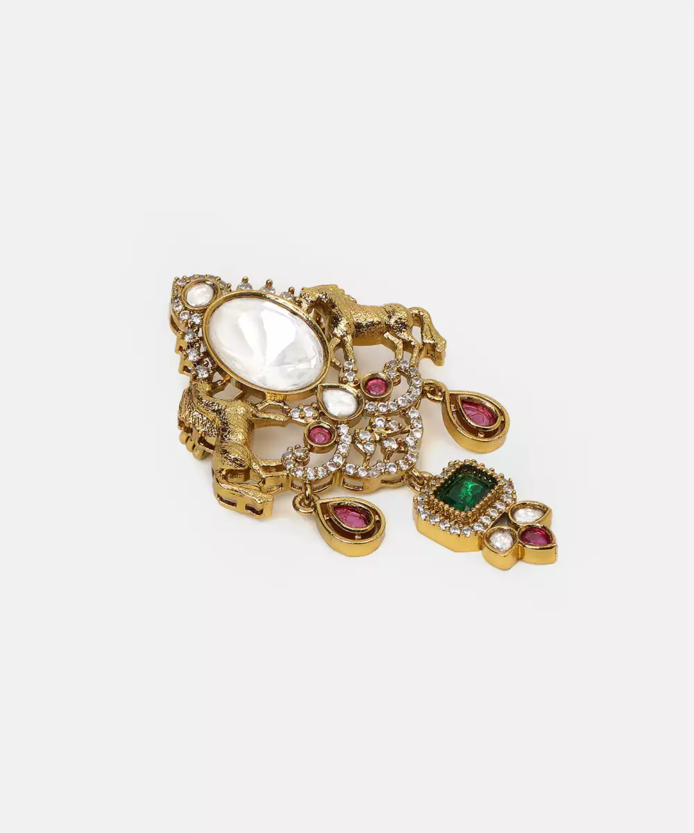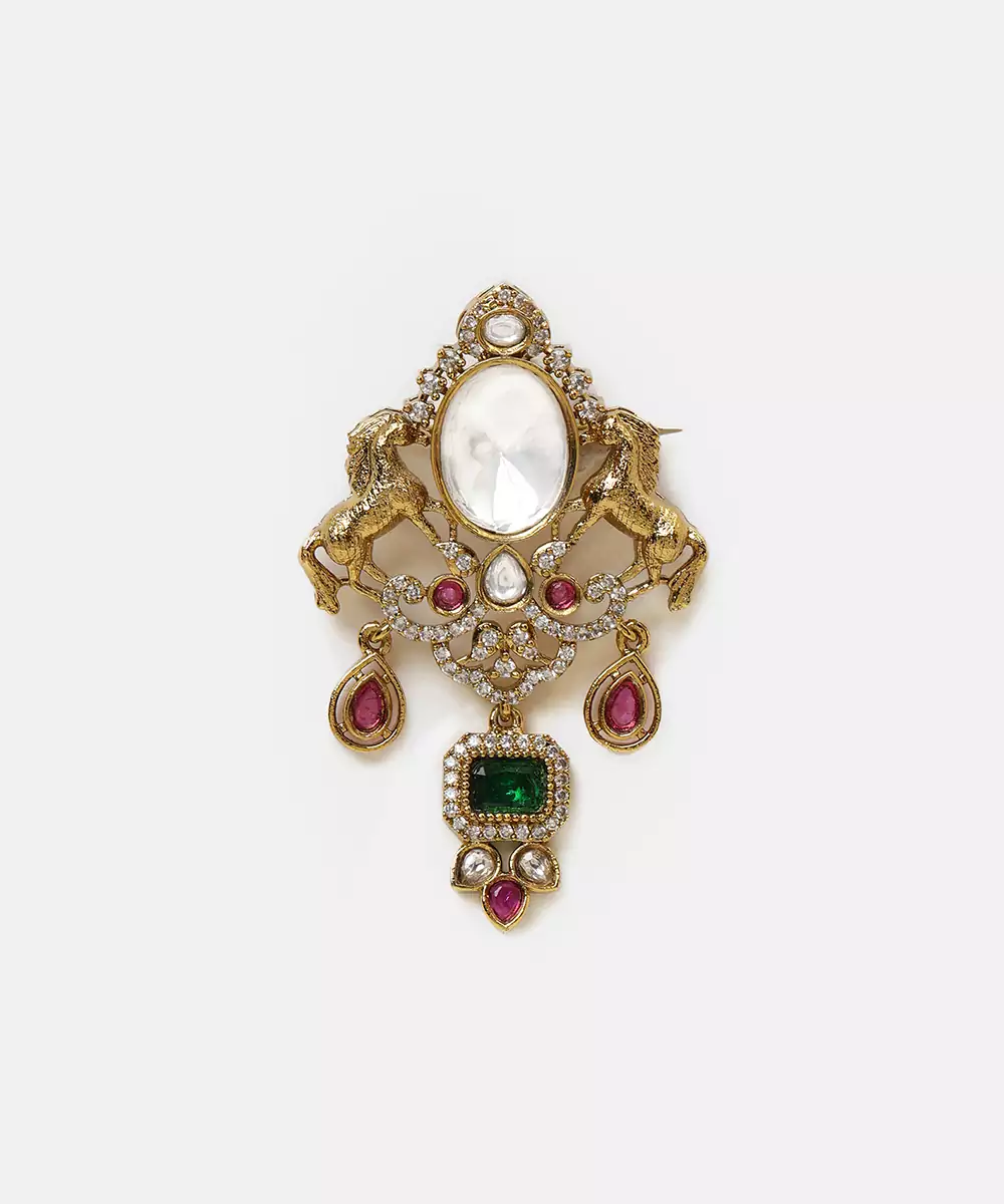This Gold Plated Kundan Multicolor Stones Brooch Showcases Exquisite Craftsmanship And Vibrant Appeal. Decorated With Multicolor Stones And Kundan Work, It Brings Richness And Charm To Ethnic Outfits. Ideal For Weddings And Celebrations, This Brooch Beautifully Enhances Sherwanis, Bandhgalas, And Traditional Attire.