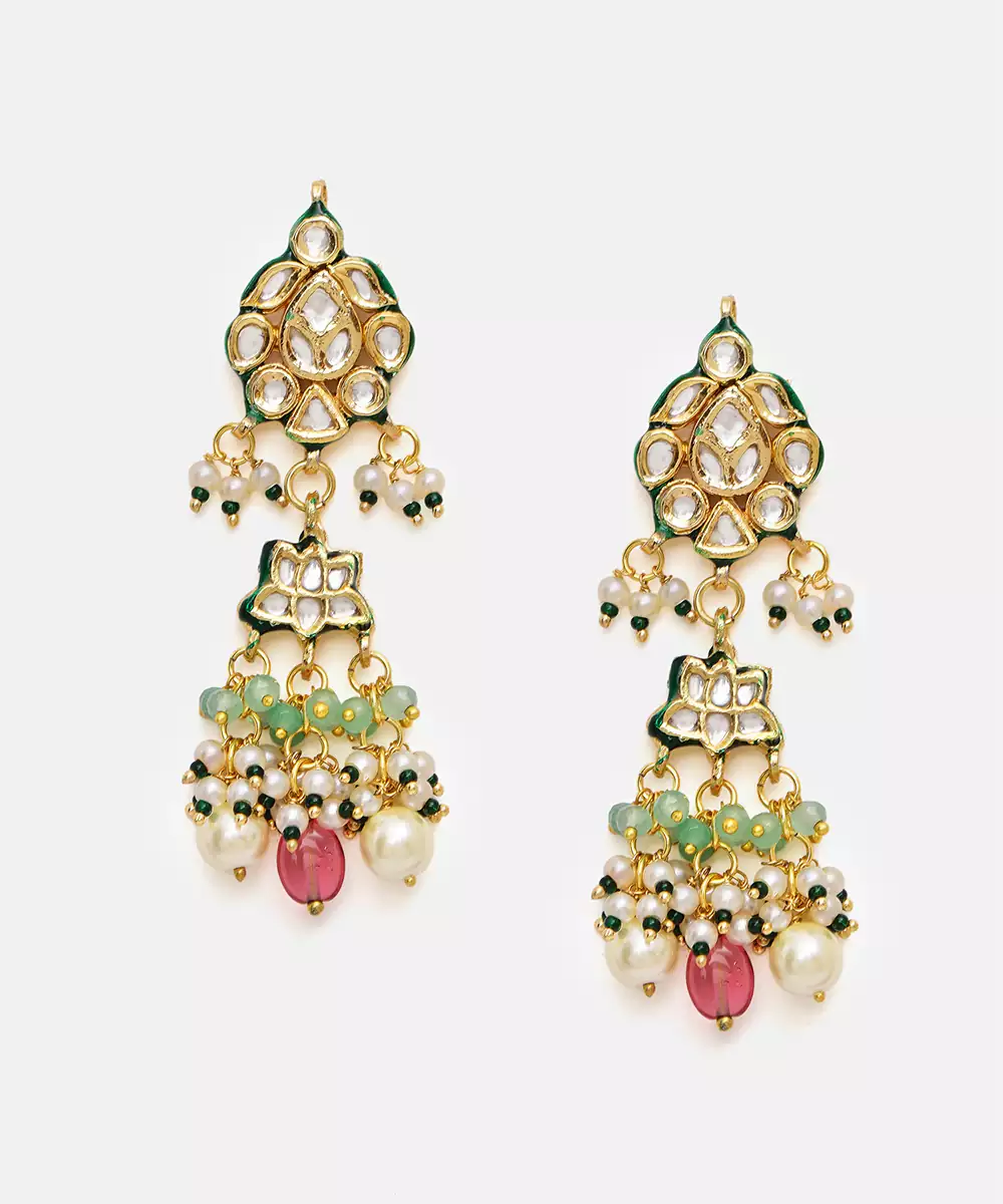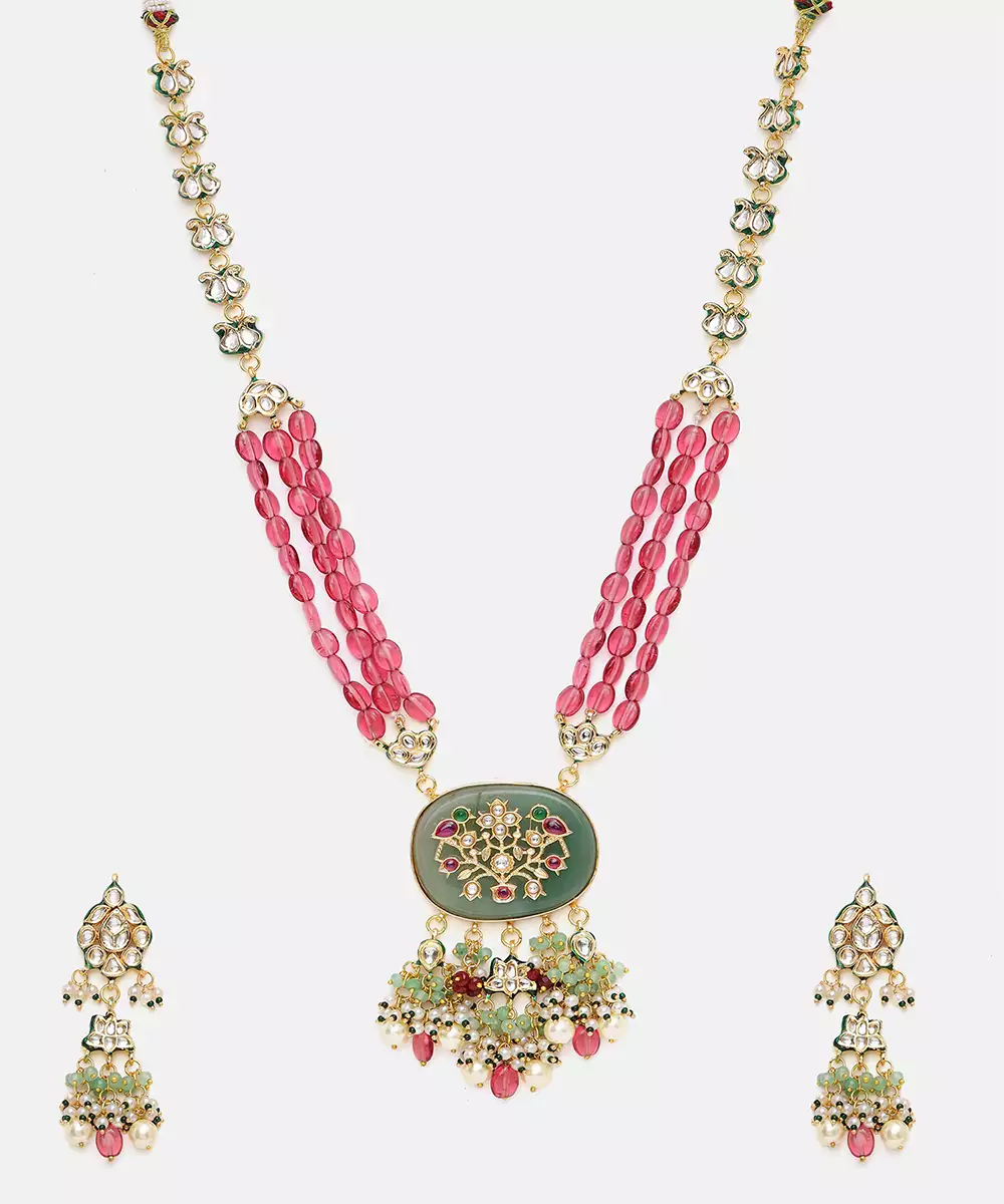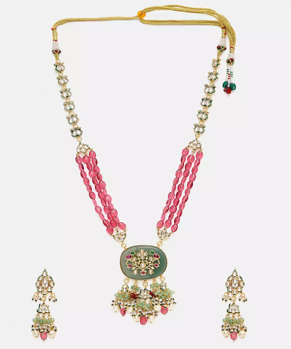This Gold Plated Kundan Multicolor Stones Necklace Set Radiates Regal Elegance With Its Intricate Craftsmanship And Rich Detailing. Adorned With Classic Kundan Work And Vibrant Green Accents, It Adds A Festive, Traditional Charm. Perfect For Weddings, Celebrations, And Special Occasions, It Beautifully Complements Ethnic And Bridal Ensembles With Timeless Sophistication.