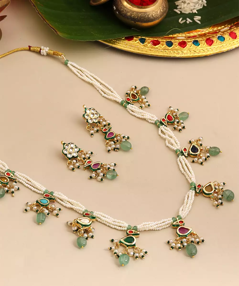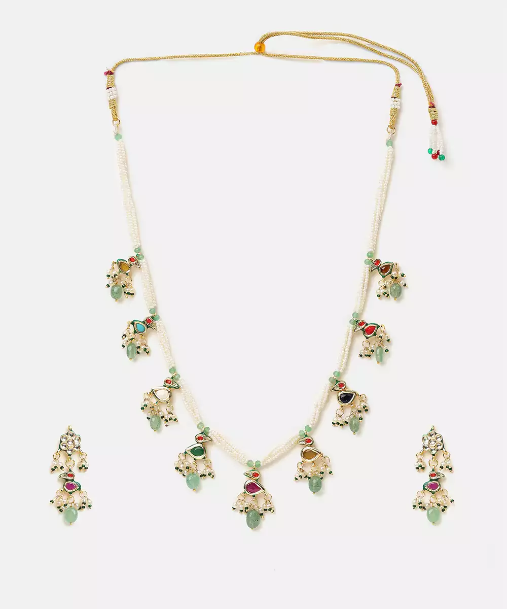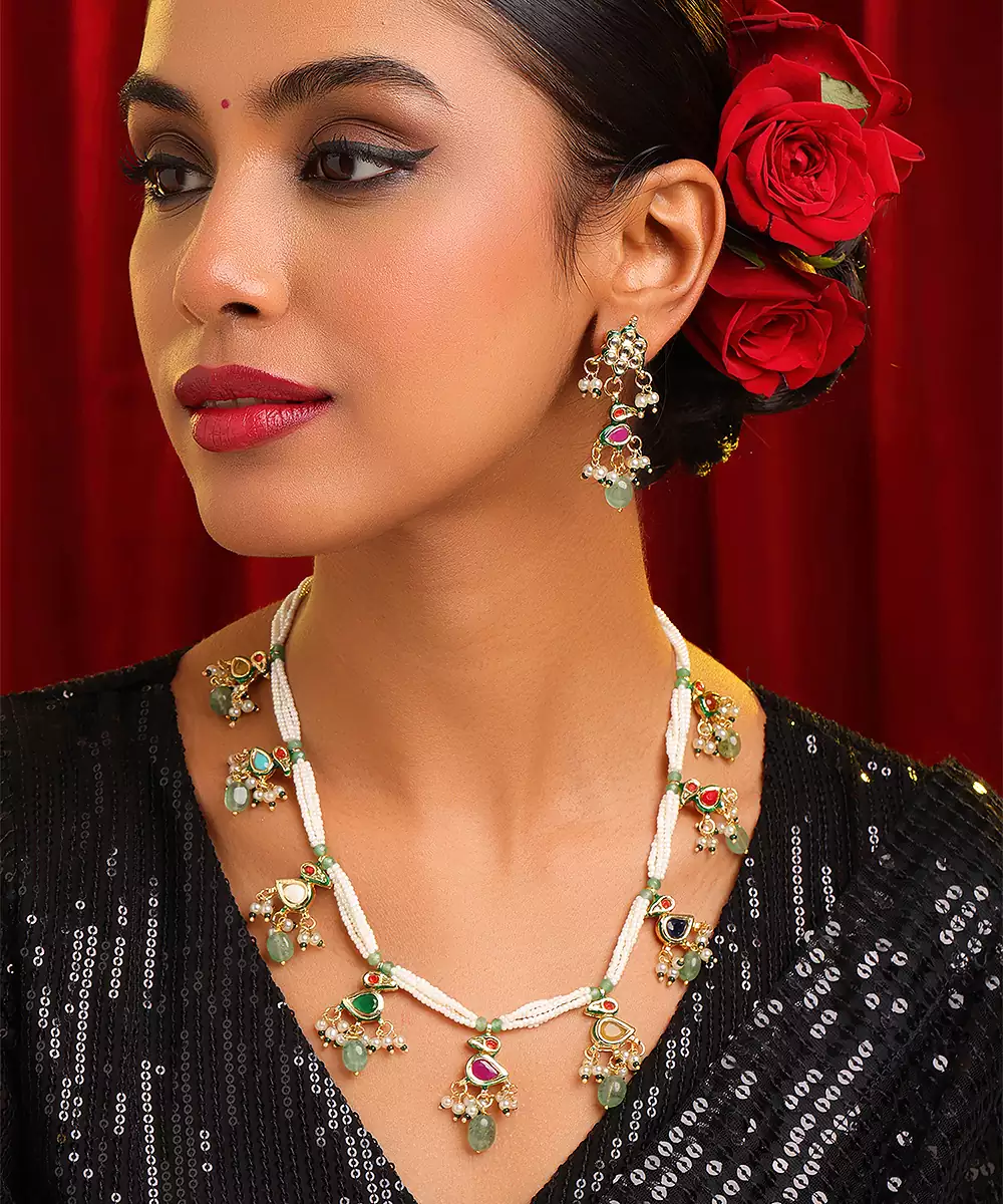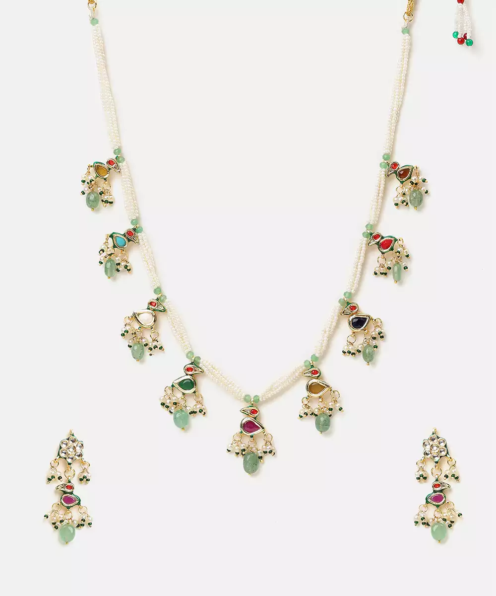 This Gold Plated Kundan Multicolor Stones Necklace Set Features Vibrant Hues And Exquisite Craftsmanship. Embellished With Multicolor Stones And Classic Kundan Work, It Brings Festive Charm To Bridal Styling. Ideal For Weddings And Celebrations, This Necklace Set Beautifully Complements Lehengas And Sarees.