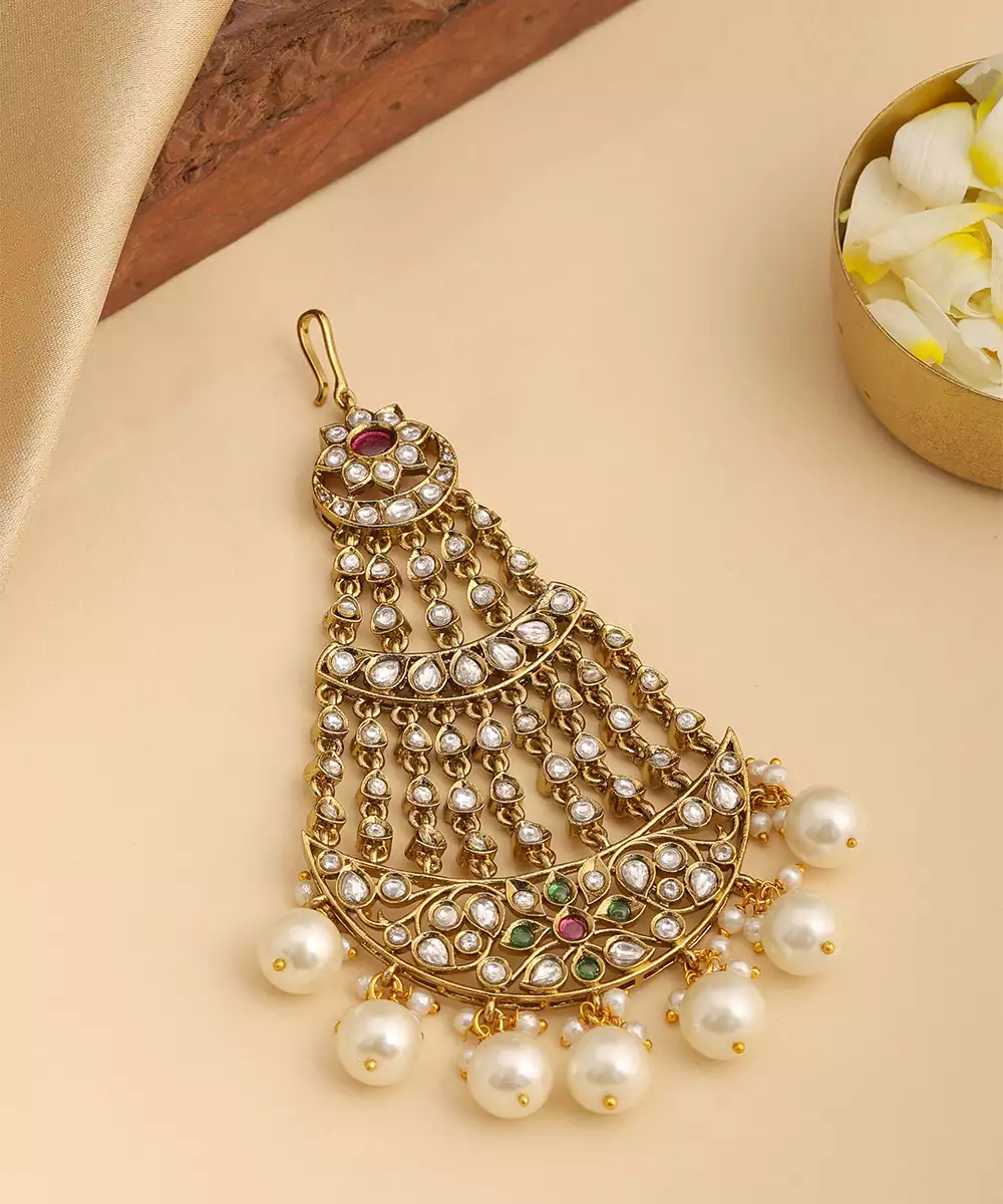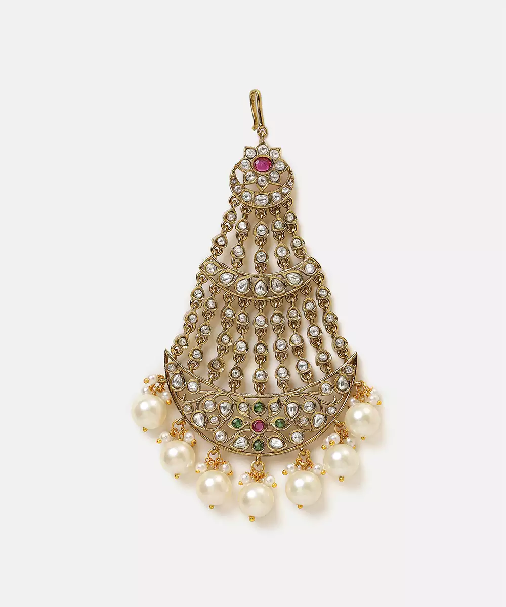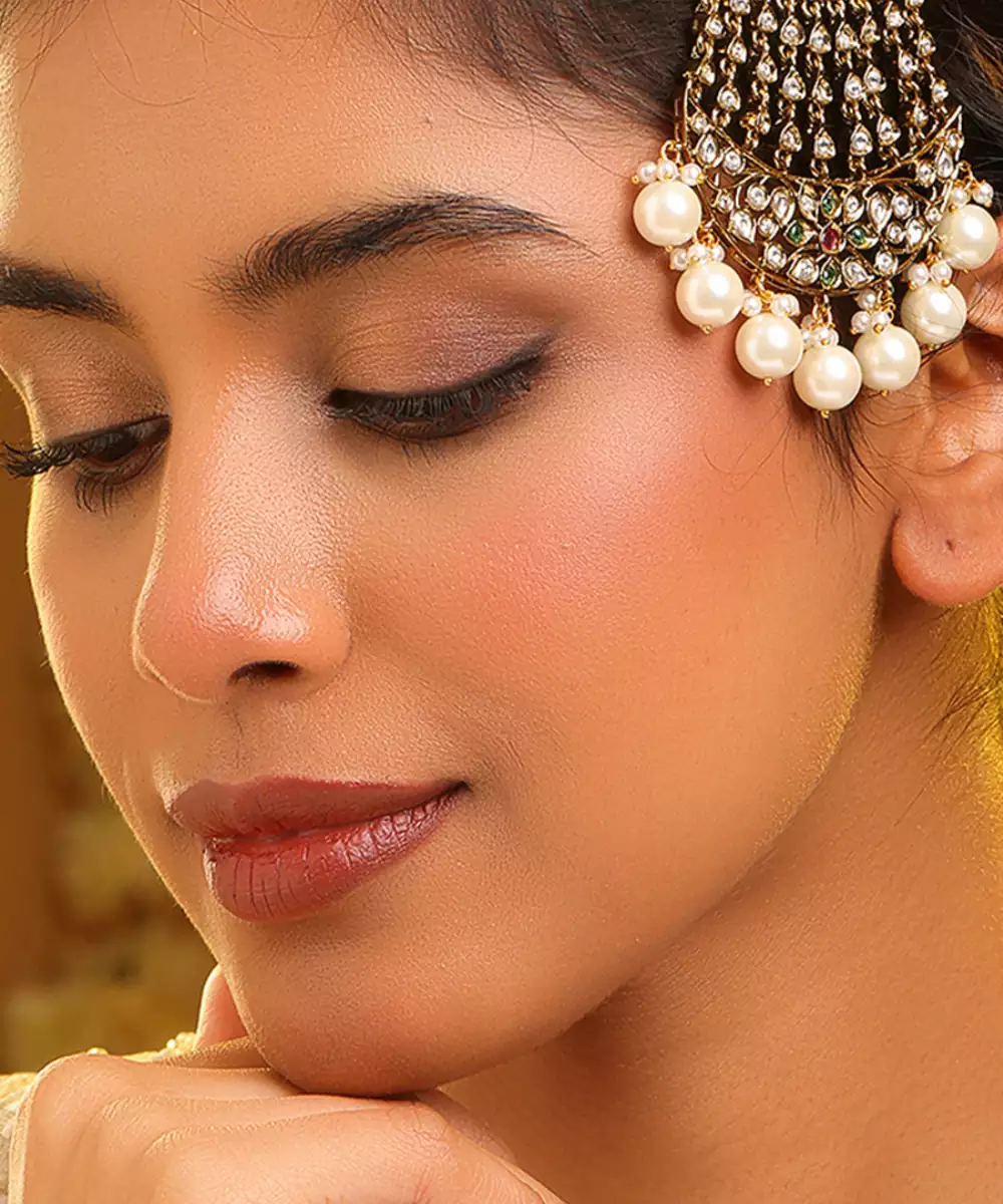 This Gold Plated Kundan Multicolor Stones Passa Features Vibrant Hues And Intricate Craftsmanship. Embellished With Multicolor Stones And Classic Kundan Work, It Adds A Regal Charm To Bridal Hairstyles. Ideal For Weddings And Festive Celebrations, This Passa Complements Traditional Outfits With Rich Elegance.