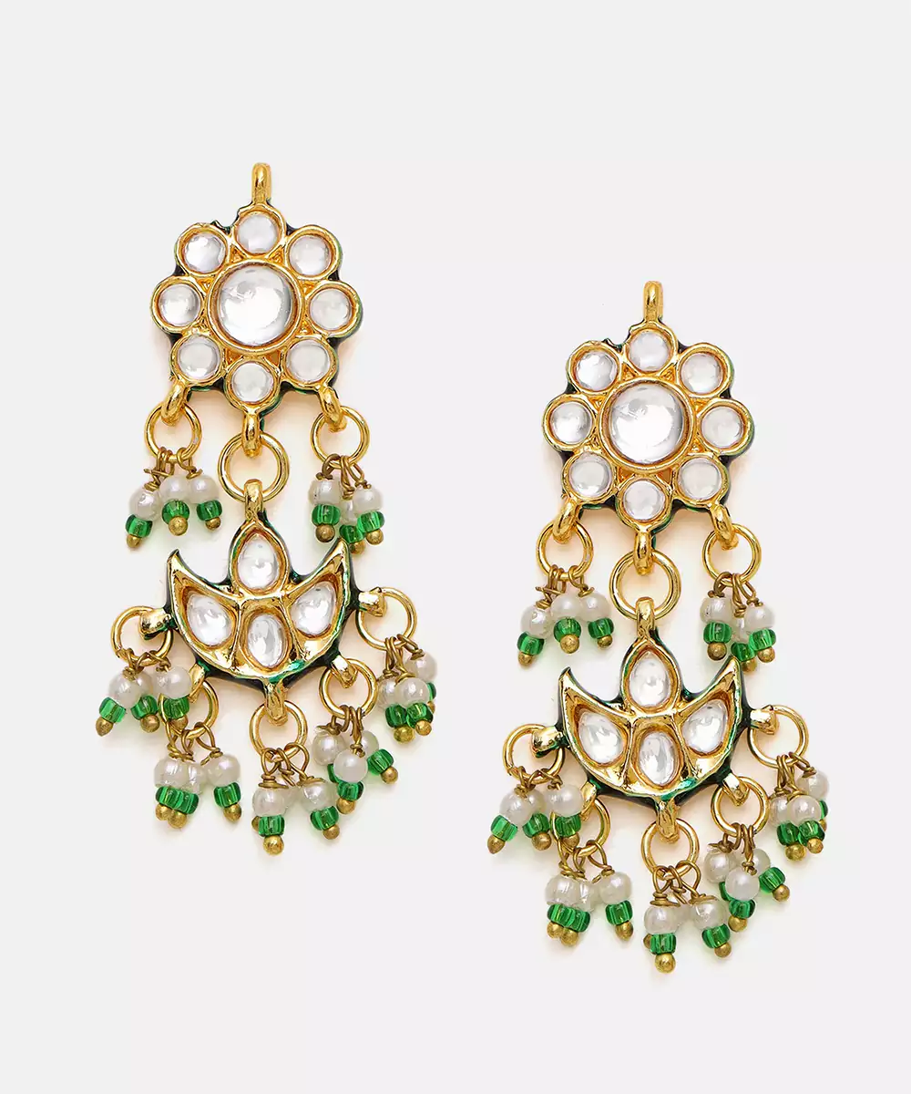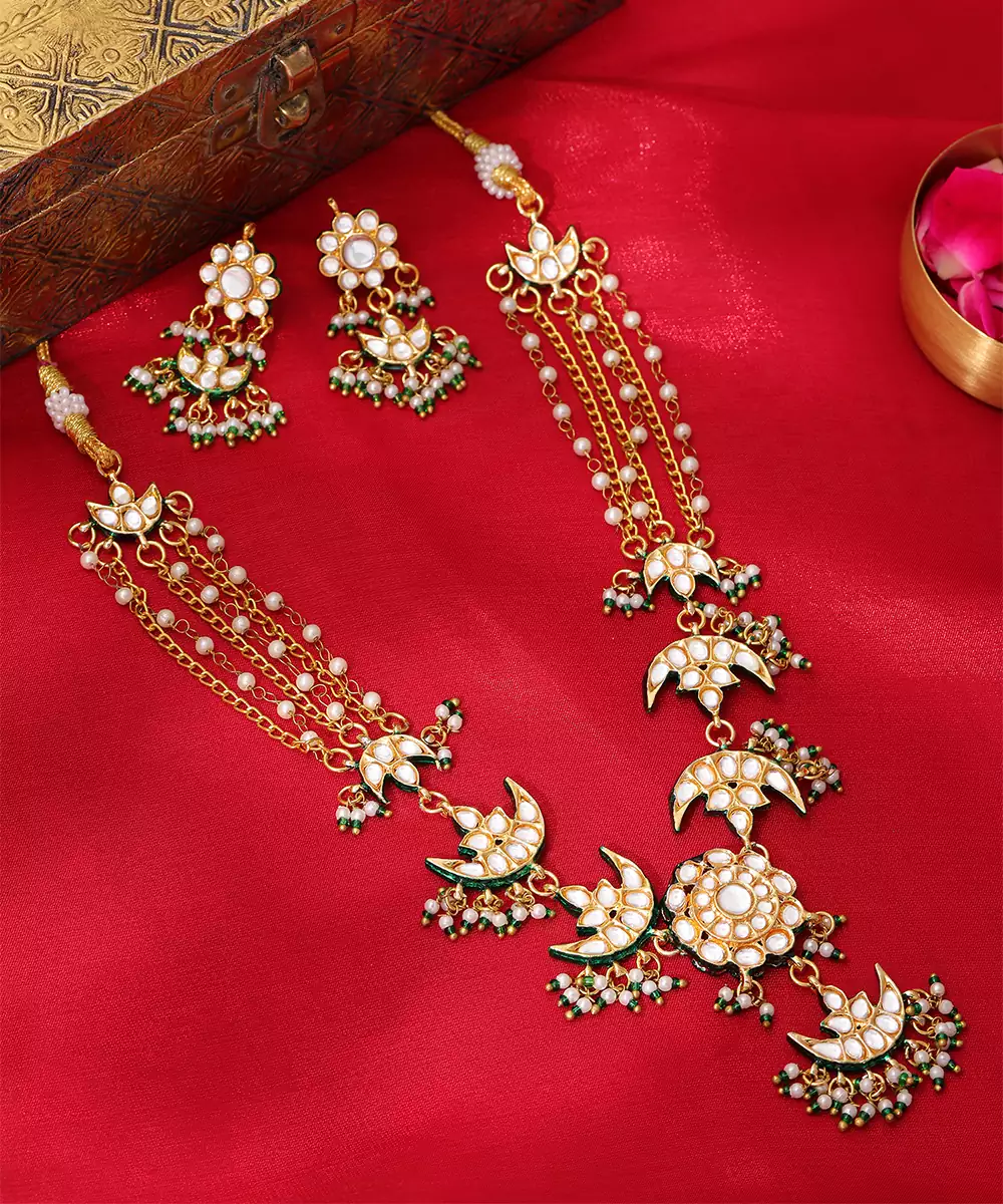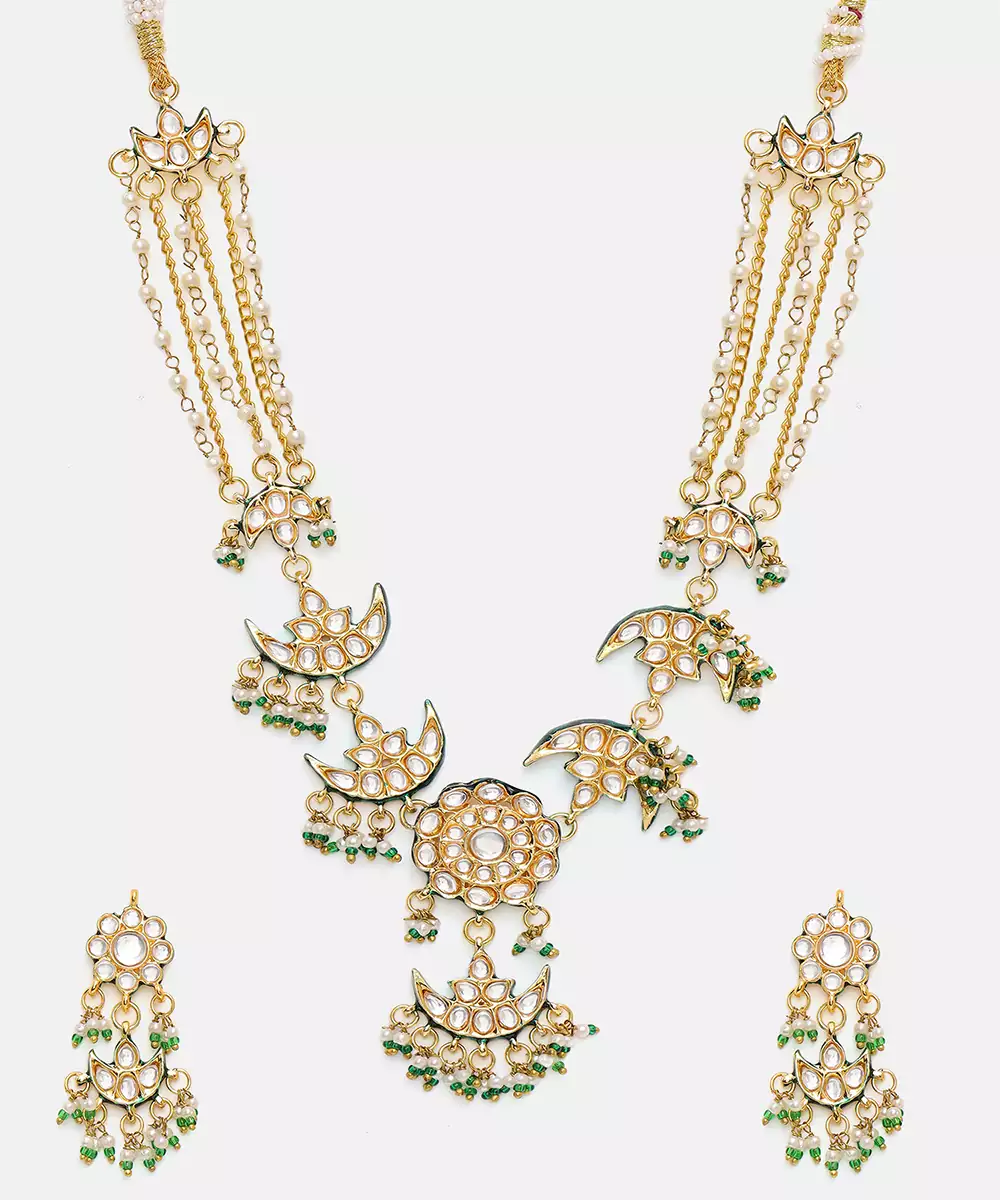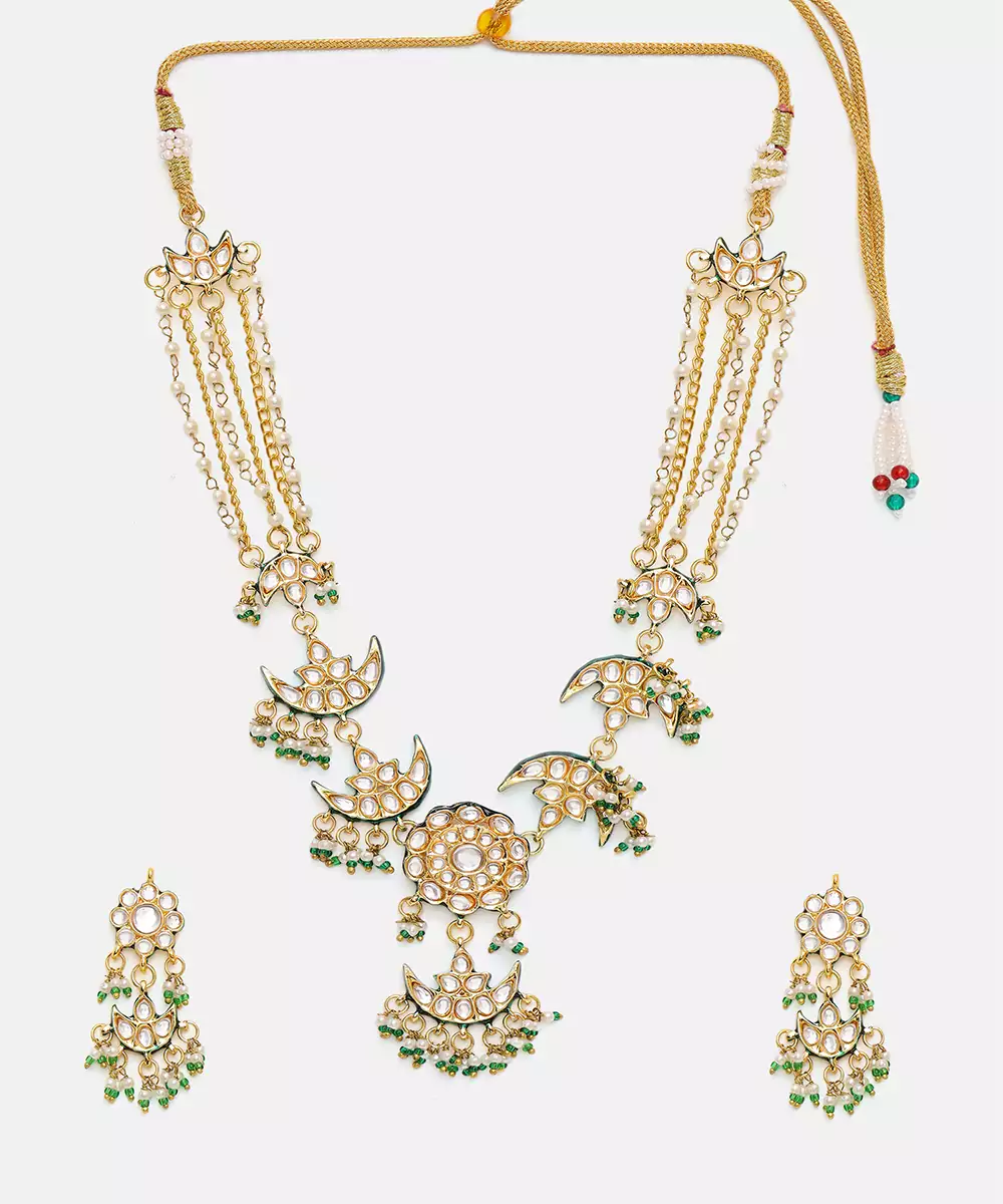 This Gold Plated Kundan Green Stones Necklace Set Radiates Regal Elegance With Its Intricate Craftsmanship And Rich Detailing. Adorned With Classic Kundan Work And Vibrant Green Accents, It Adds A Festive, Traditional Charm. Perfect For Weddings, Celebrations, And Special Occasions, It Beautifully Complements Ethnic And Bridal Ensembles With Timeless Sophistication.