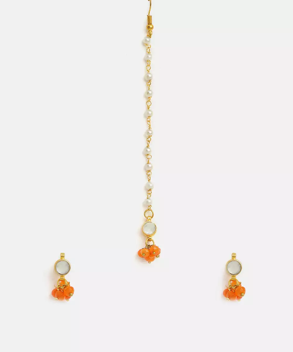 Adorned With Bright Orange Stones, This Gold Plated Kundan Maang Tikka Adds A Cheerful And Vibrant Touch To Ethnic Looks. The Detailed Craftsmanship Reflects Traditional Elegance. Ideal For Festive Wear And Pre Wedding Functions, It Beautifully Complements Colorful Lehengas, Sarees, And Indo Western Outfits.