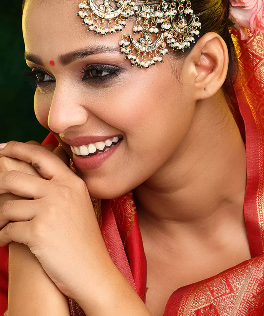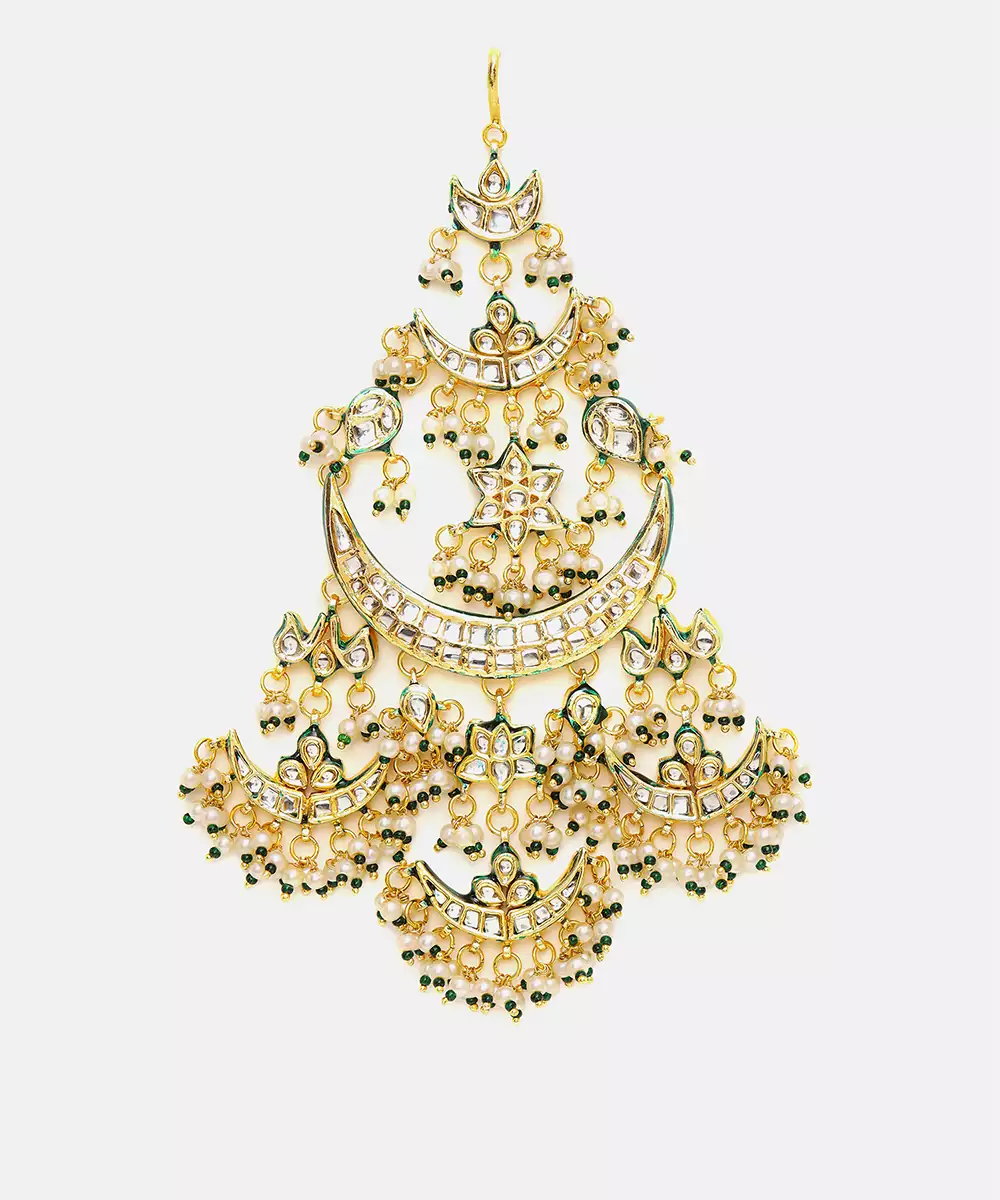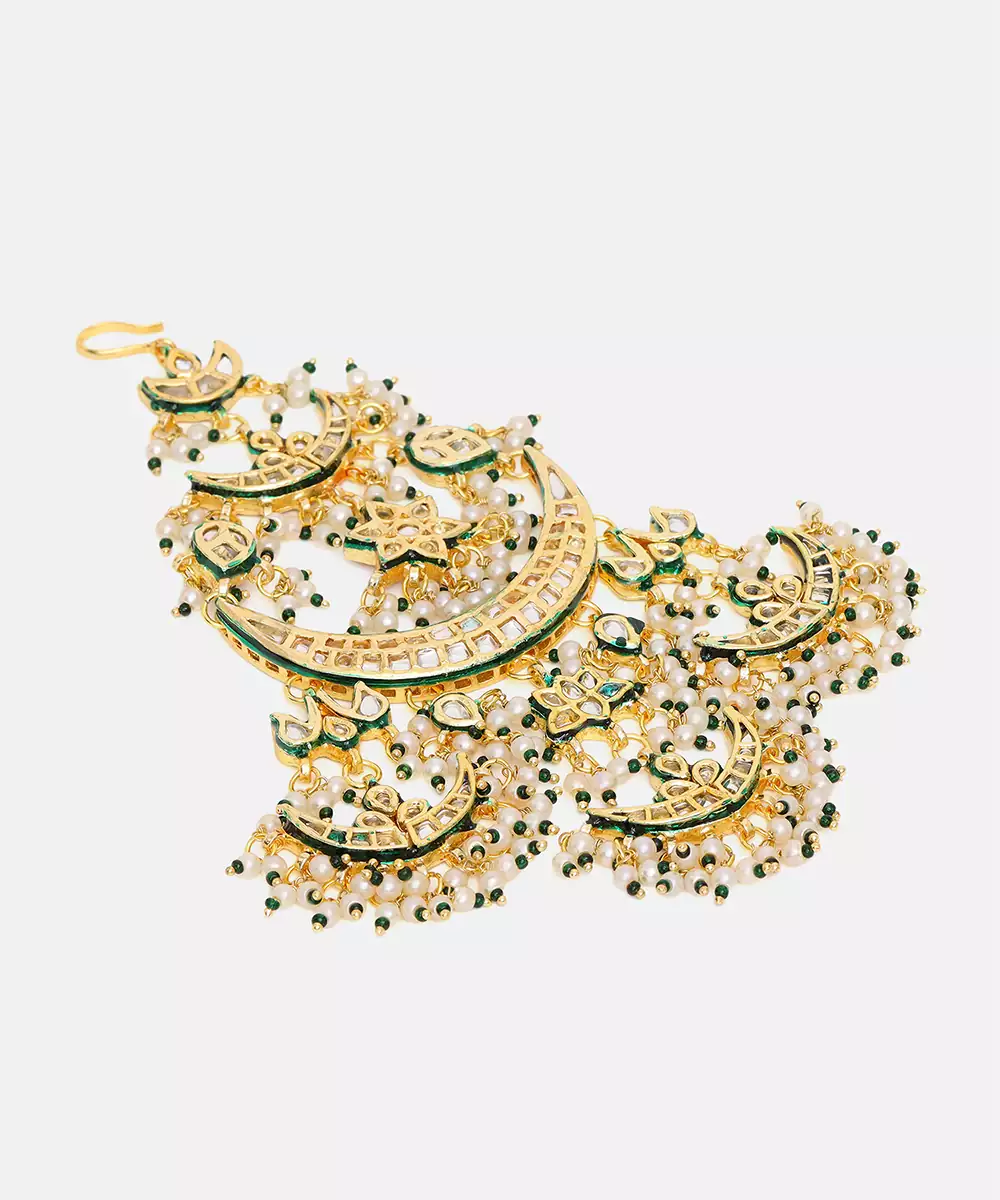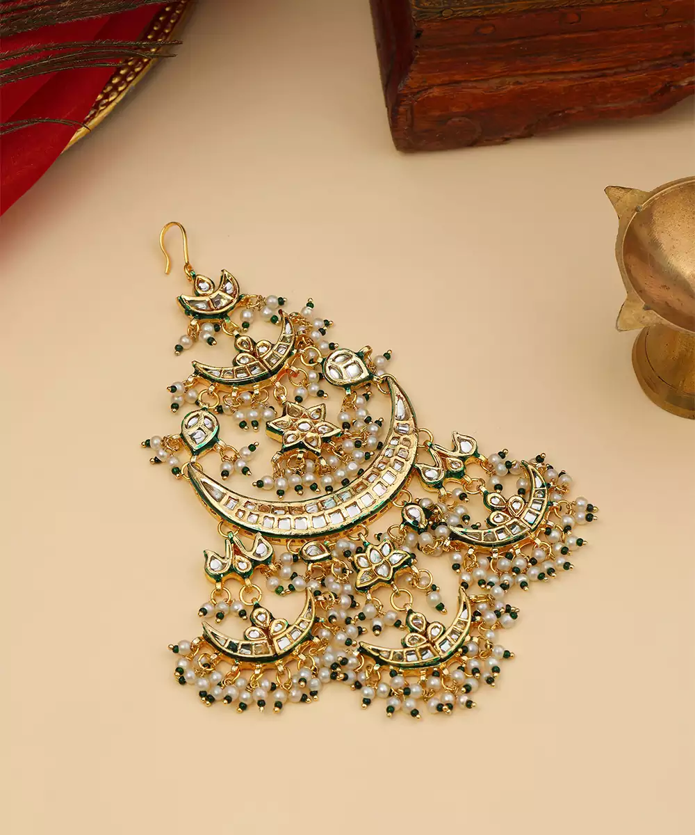 This Gold Plated Kundan Passa Exudes Regal Charm With Its Elegant Crescent Silhouette And Intricate Detailing. Adorned With Classic Kundan Work And Delicate Green Bead Accents, It Adds A Festive, Traditional Touch. Perfect For Weddings, Celebrations, And Special Occasions, It Beautifully Complements Ethnic Ensembles With Timeless Sophistication.