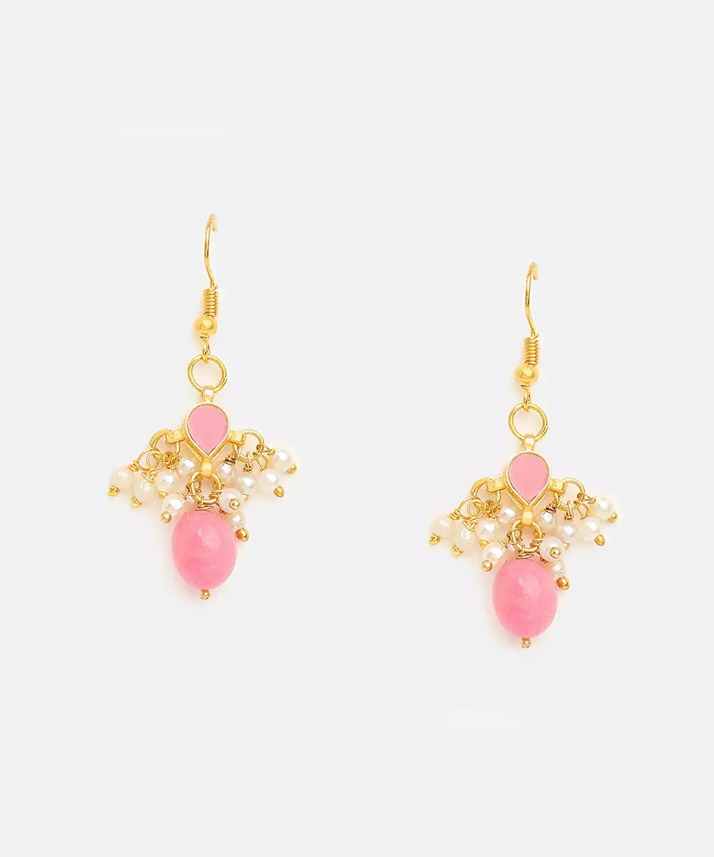 These Gold Plated Kundan Earrings Are Embellished With Soft Pink Stones For A Delicate Yet Festive Look. Crafted With Intricate Detailing, They Highlight The Face Gracefully. Perfect For Weddings, Parties, And Cultural Celebrations, They Enhance Traditional Attire With Elegance, Charm, And Feminine Sophistication.