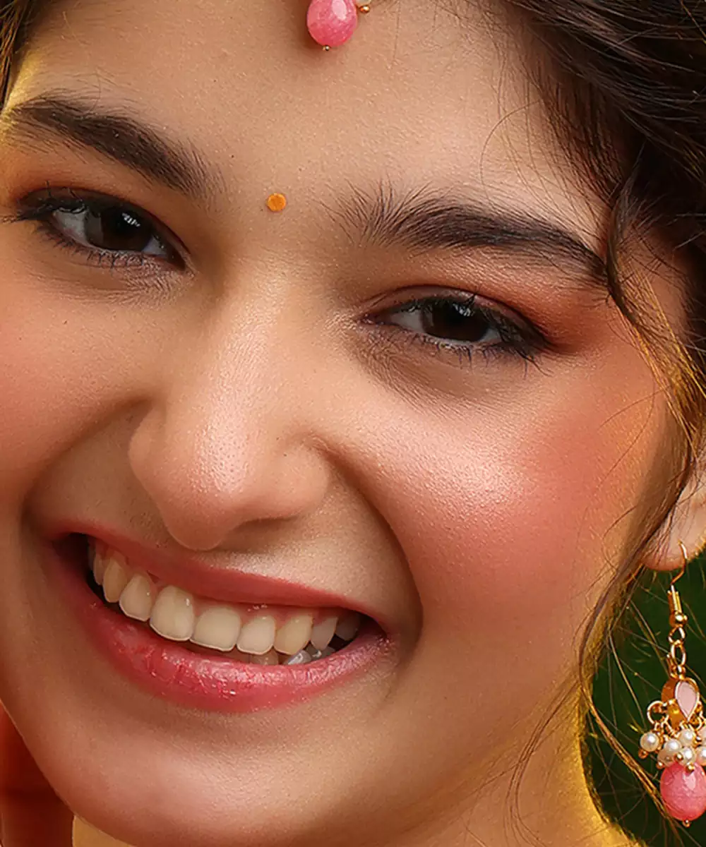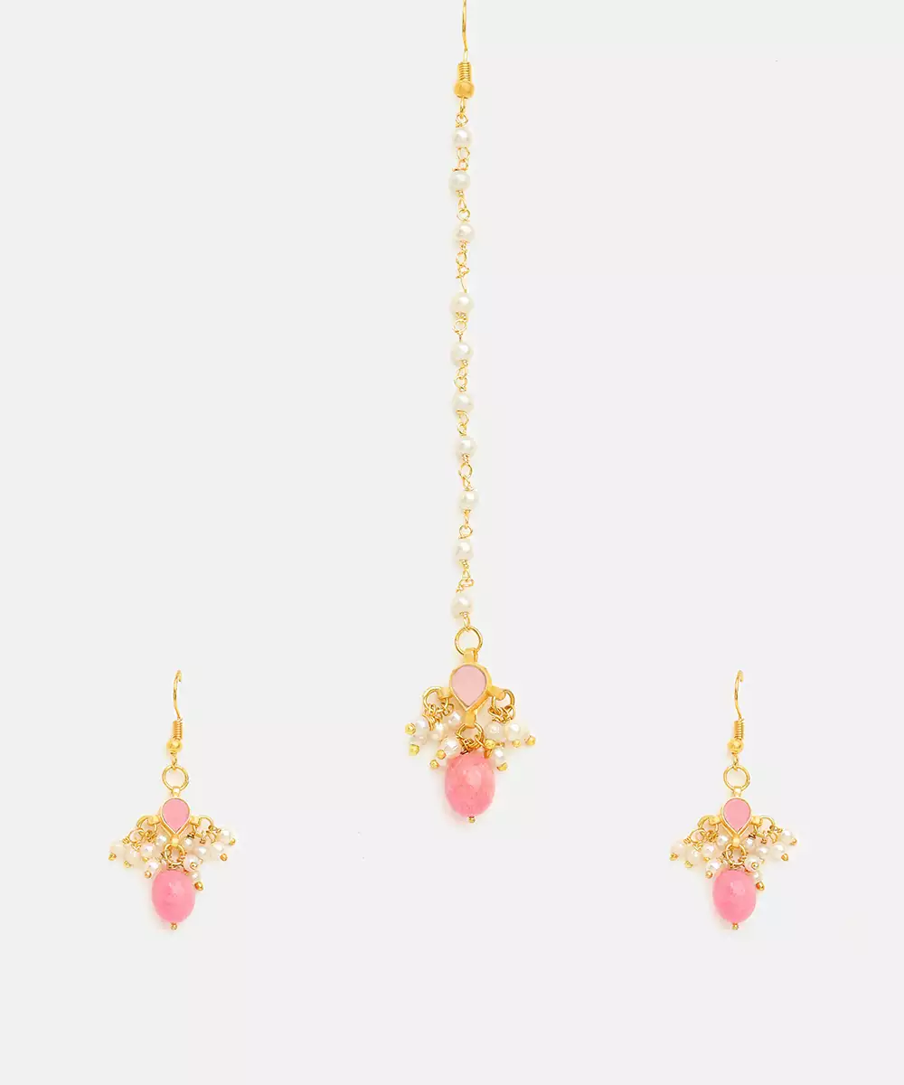 Accented With Soft Pink Stones, This Gold Plated Kundan Maang Tikka Offers A Delicate Yet Festive Appeal. The Intricate Kundan Work Adds Richness And Traditional Charm. Ideal For Weddings, Parties, And Cultural Celebrations, It Brings A Touch Of Femininity And Sophistication To Ethnic Ensembles.