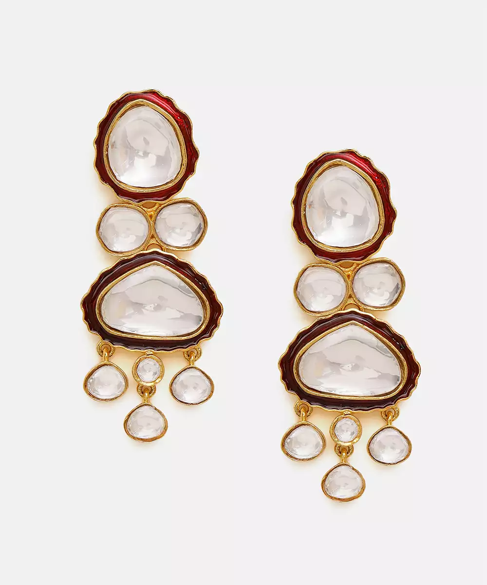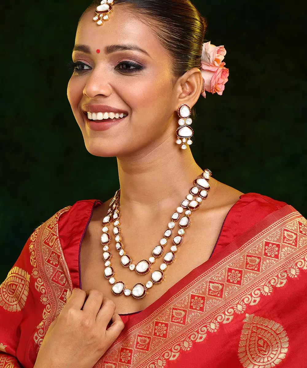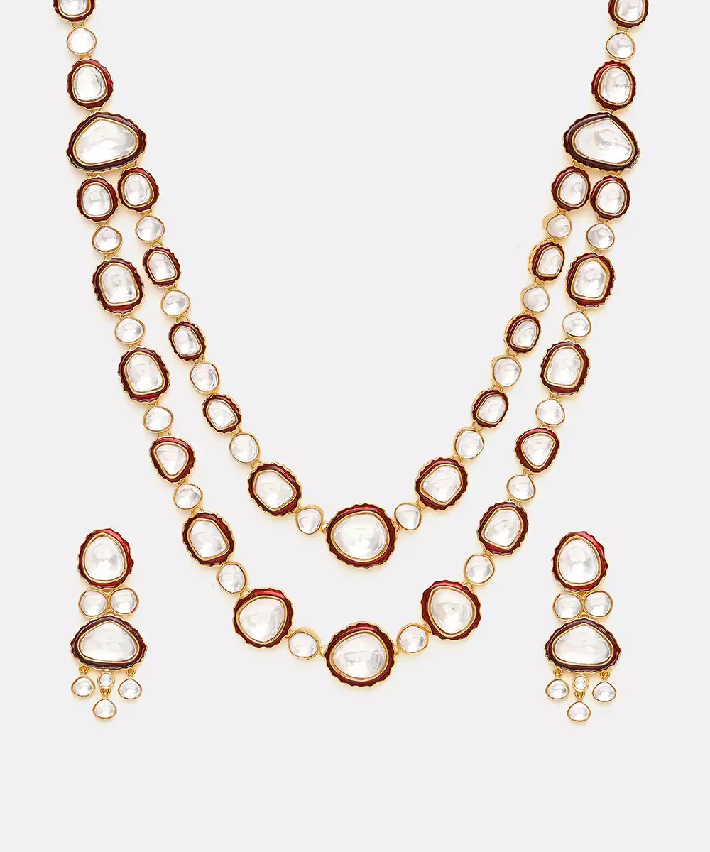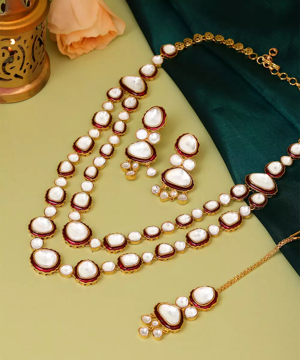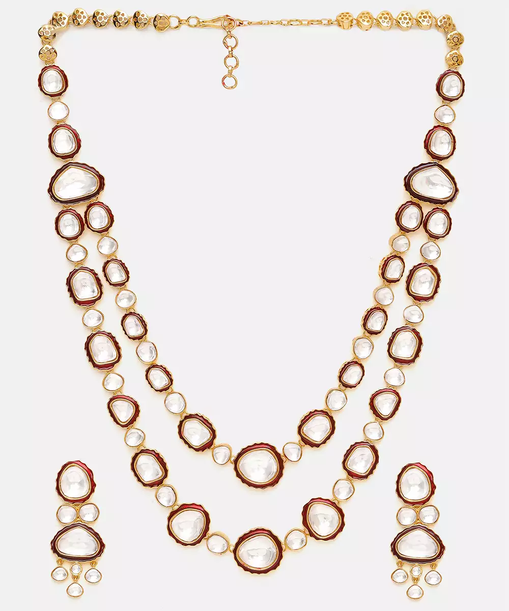 This Gold Plated Kundan Red Stone Necklace Set Radiates Regal Elegance With Its Intricate Craftsmanship And Rich Detailing. Adorned With Classic Kundan Work And Vibrant Green Accents, It Adds A Festive, Traditional Charm. Perfect For Weddings, Celebrations, And Special Occasions, It Beautifully Complements Ethnic And Bridal Ensembles With Timeless Sophistication.