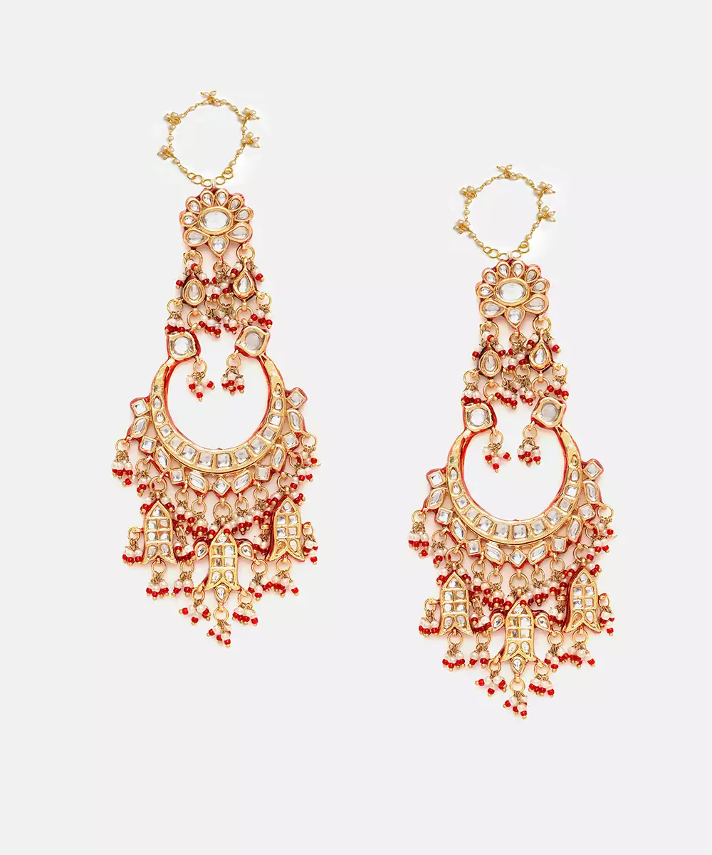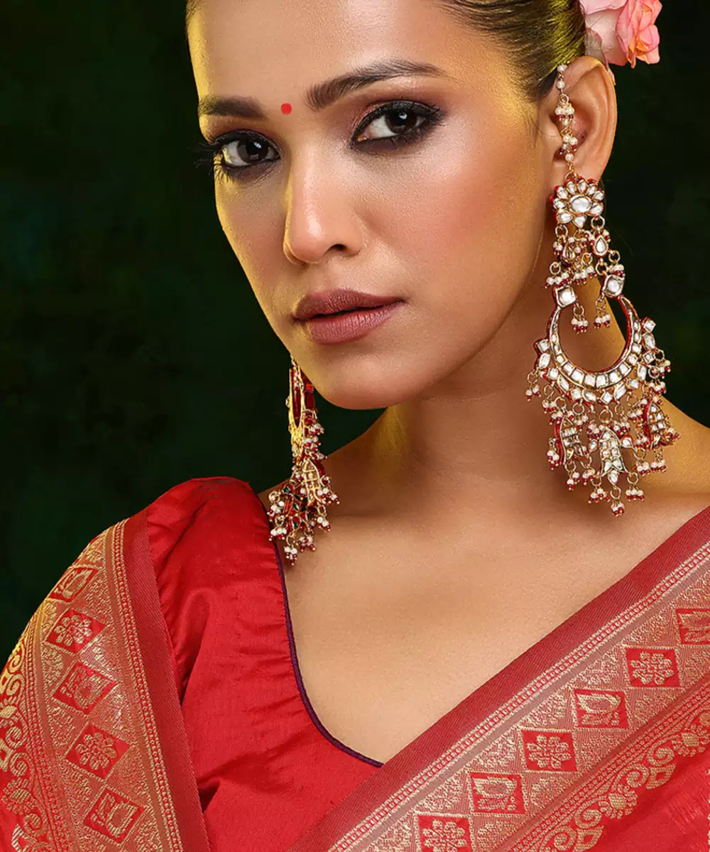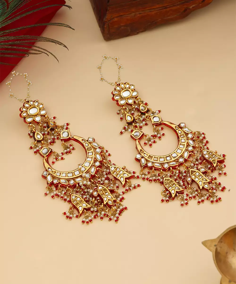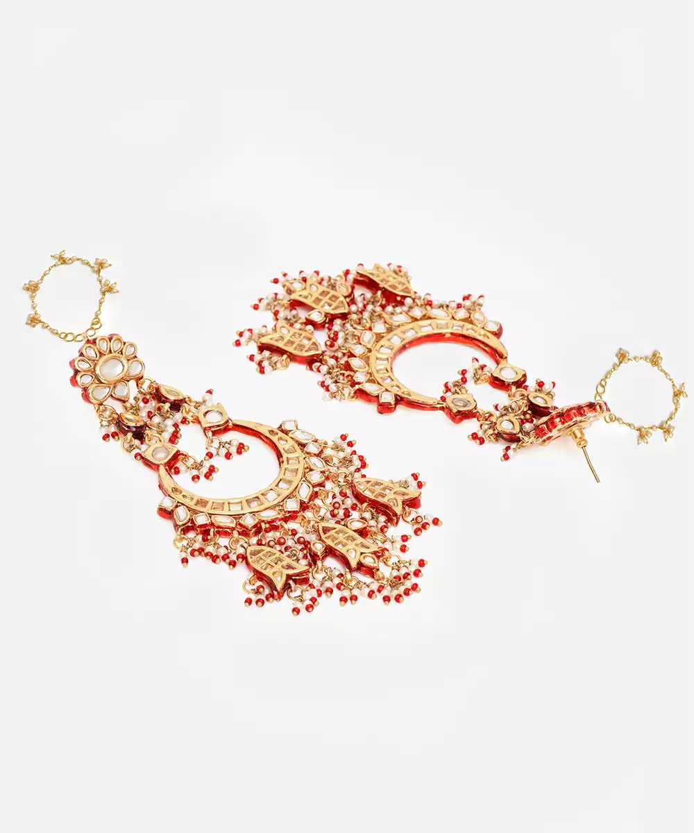 This Red Gold Kundan Beaded Earring Showcases Vibrant Elegance With Its Intricate Craftsmanship And Rich Detailing. Embellished With Classic Kundan Work And Colorful Beads, It Adds A Festive, Eye Catching Charm. Perfect For Weddings, Celebrations, And Special Occasions, It Beautifully Enhances Ethnic Ensembles With A Touch Of Traditional Luxury.