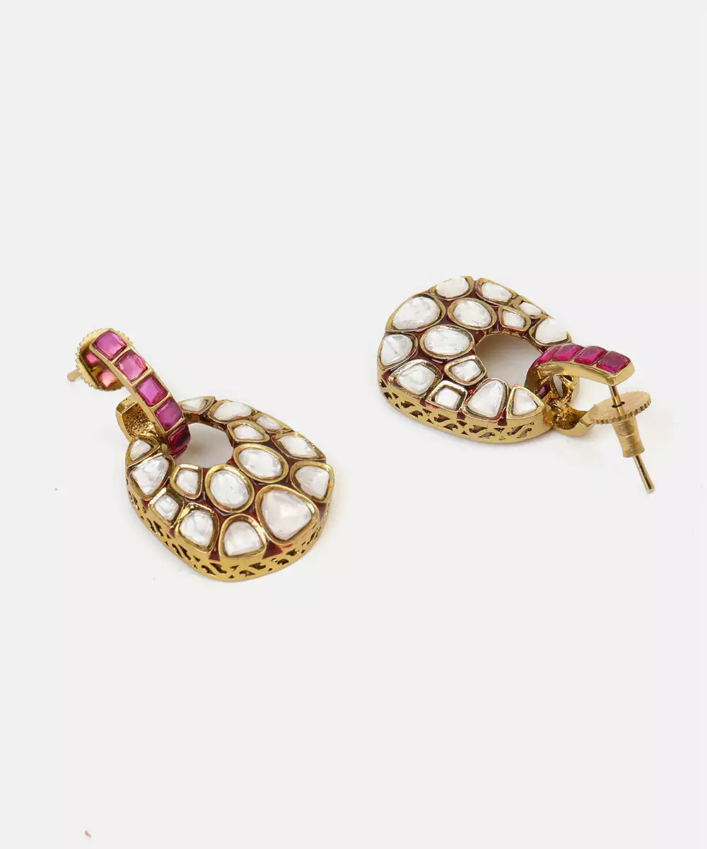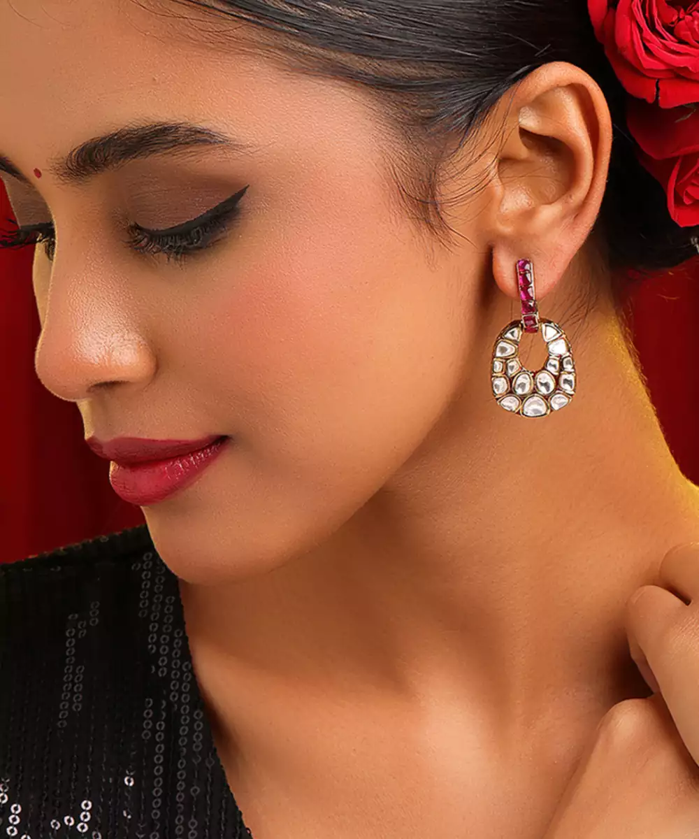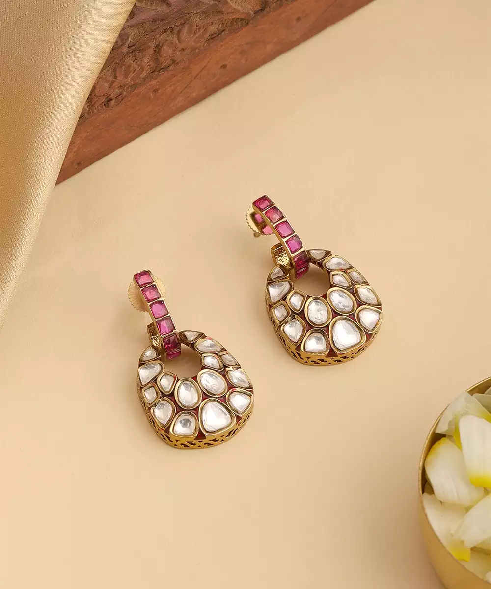 These Gold Plated Kundan Red Stones Earrings Display Rich Color And Traditional Craftsmanship. Featuring Vibrant Red Stones With Classic Kundan Detailing, They Add A Regal Accent To Any Outfit. Perfect For Weddings And Festive Occasions, These Earrings Beautifully Complement Sarees, Lehengas, And Ethnic Ensembles.