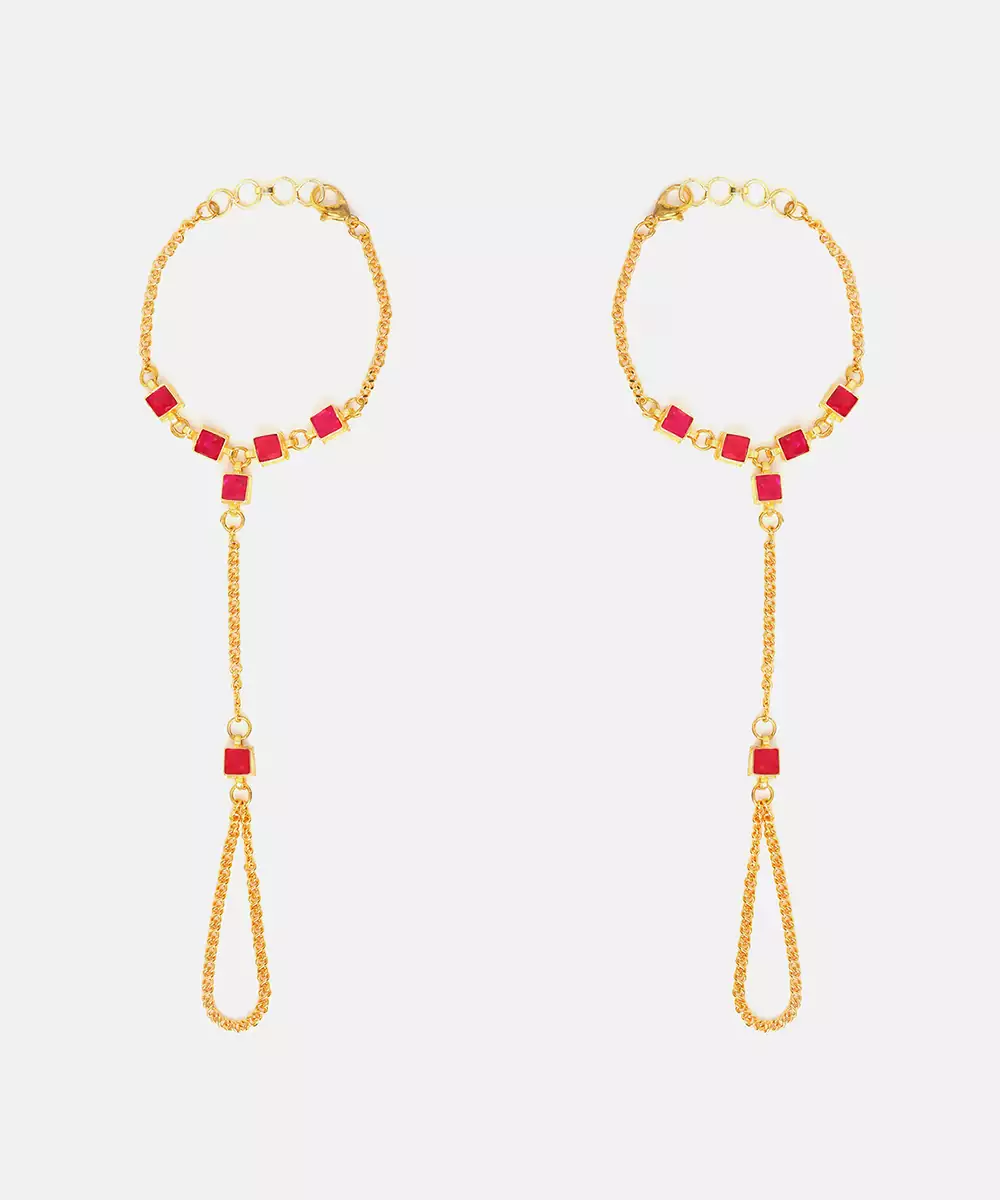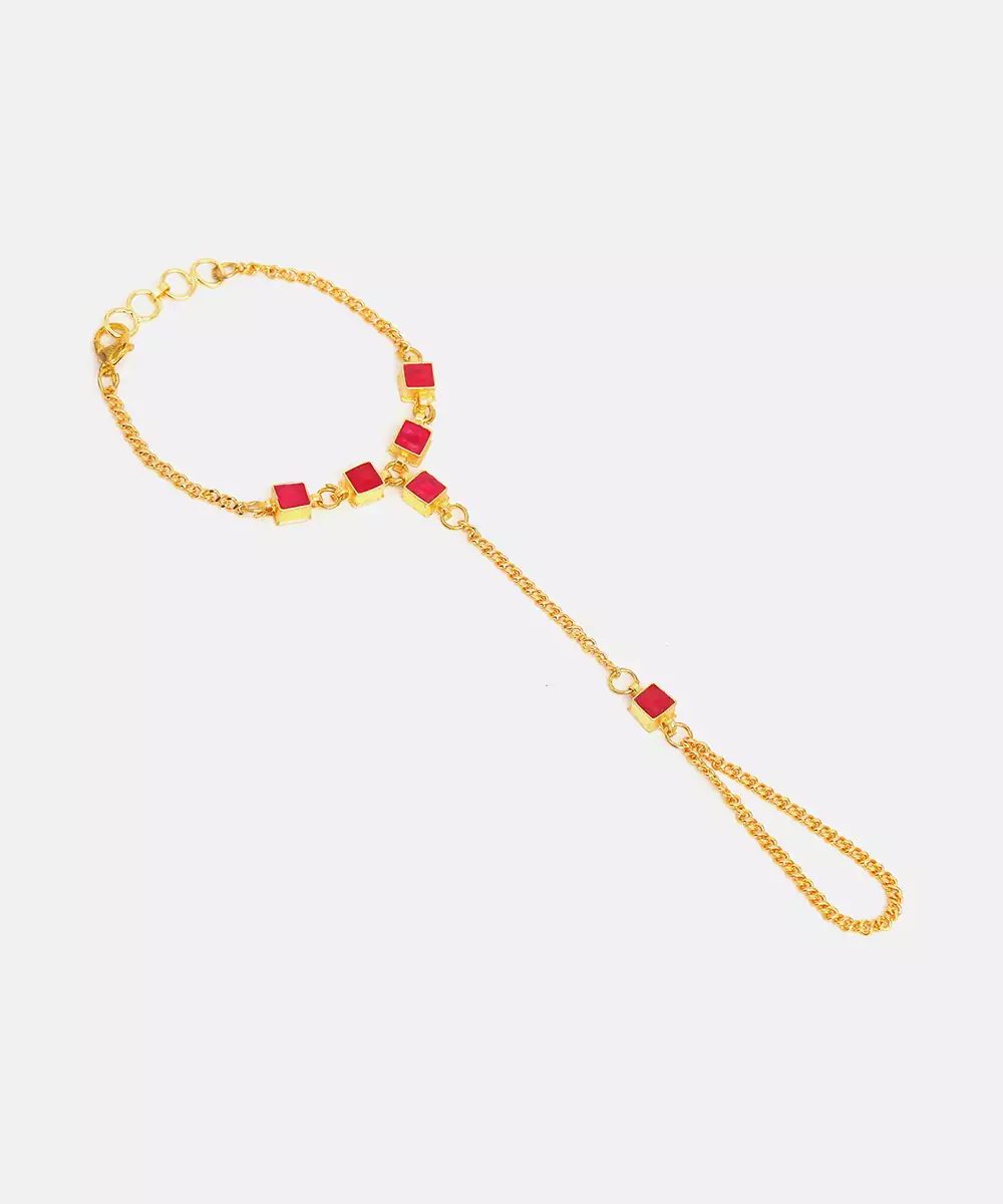 This Gold Plated Kundan Haath Phool Is Embellished With Radiant Red Stones, Creating A Striking And Royal Effect. Designed With Intricate Detailing, It Connects Ring And Bracelet Elegantly. Perfect For Brides And Festive Occasions, It Enhances Hand Movements With Grace And Traditional Beauty.