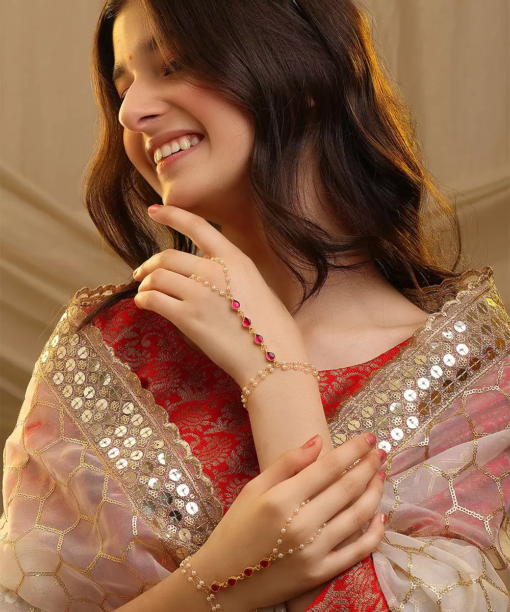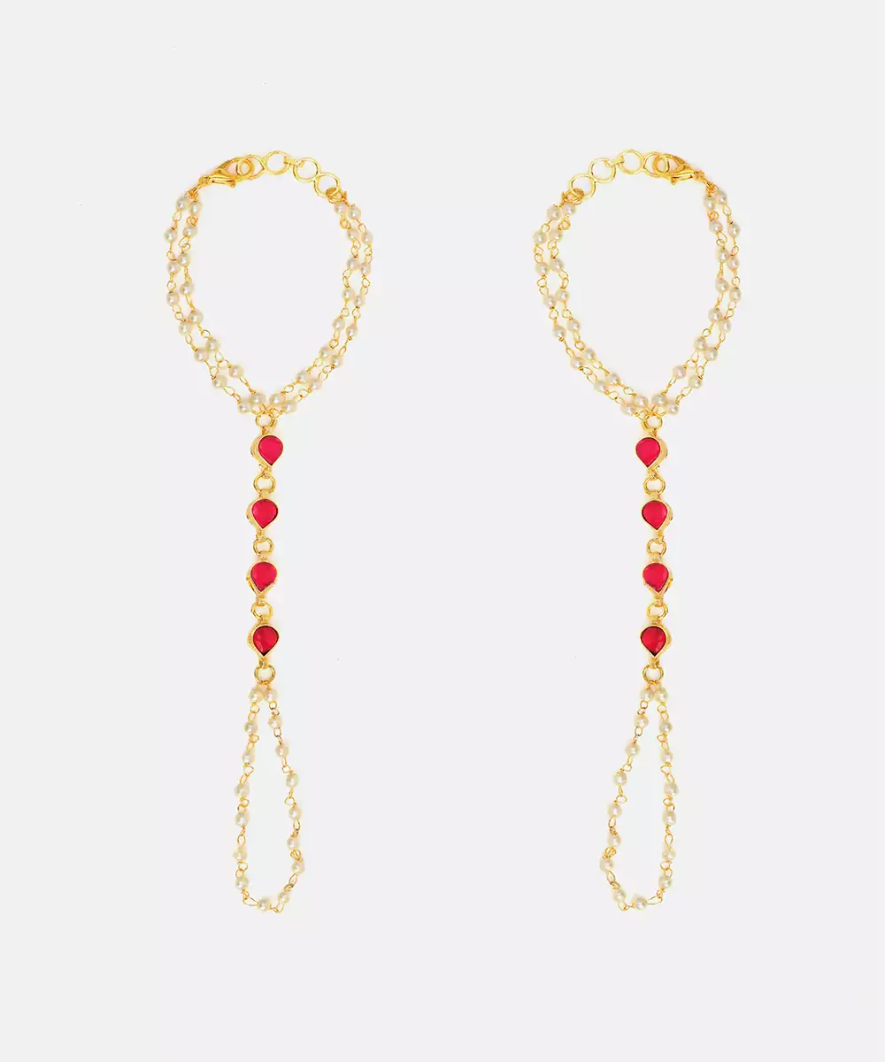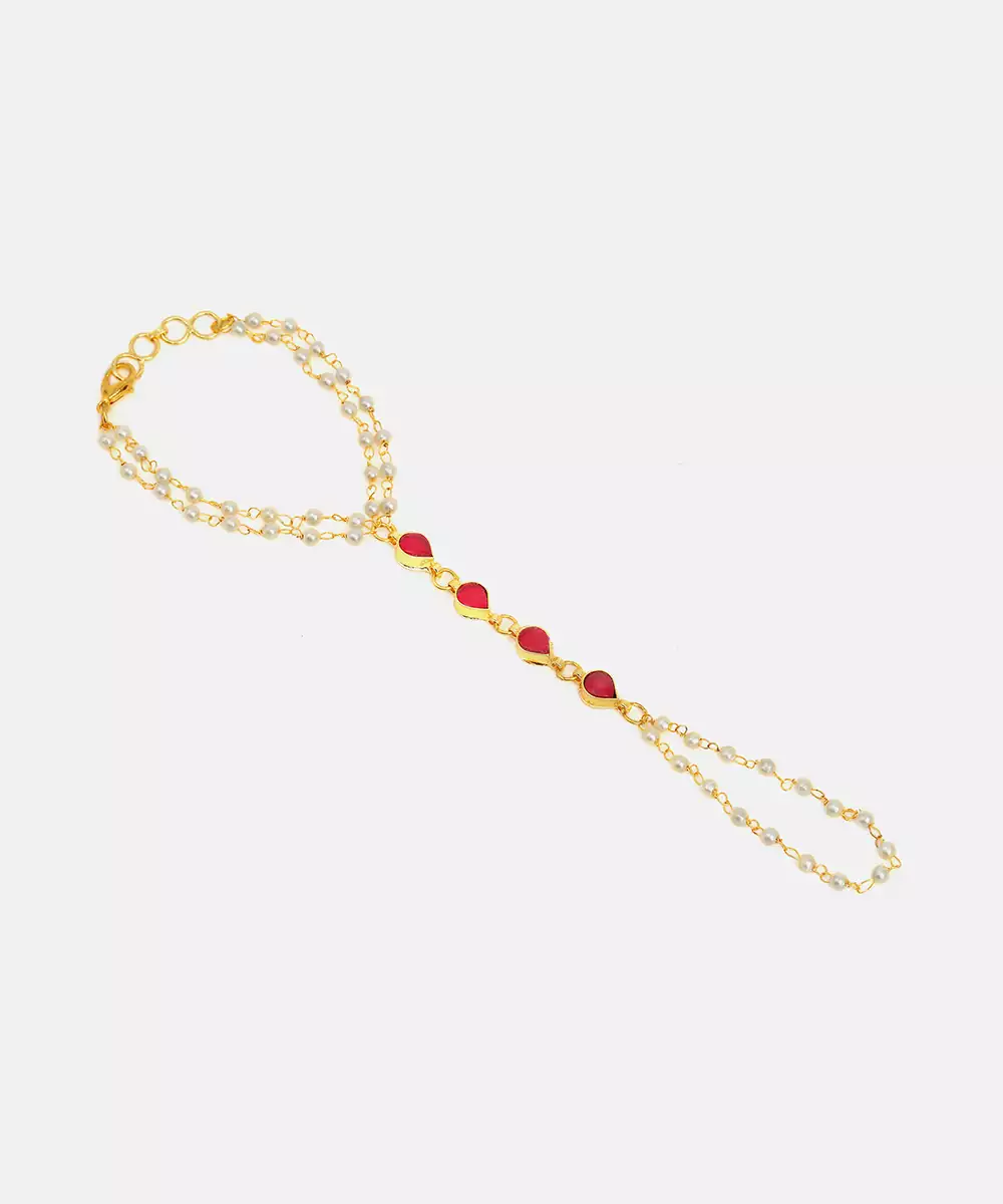 This Gold Plated Kundan Haath Phool Is Adorned With Vibrant Red Stones That Bring A Regal And Festive Charm. Designed With Intricate Craftsmanship, It Connects The Ring And Bracelet Gracefully. Ideal For Bridal Wear And Celebrations, It Enhances Hand Movements With Traditional Elegance And Beauty.