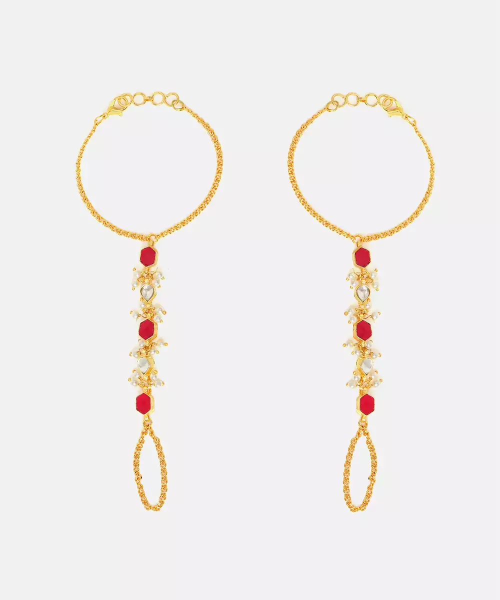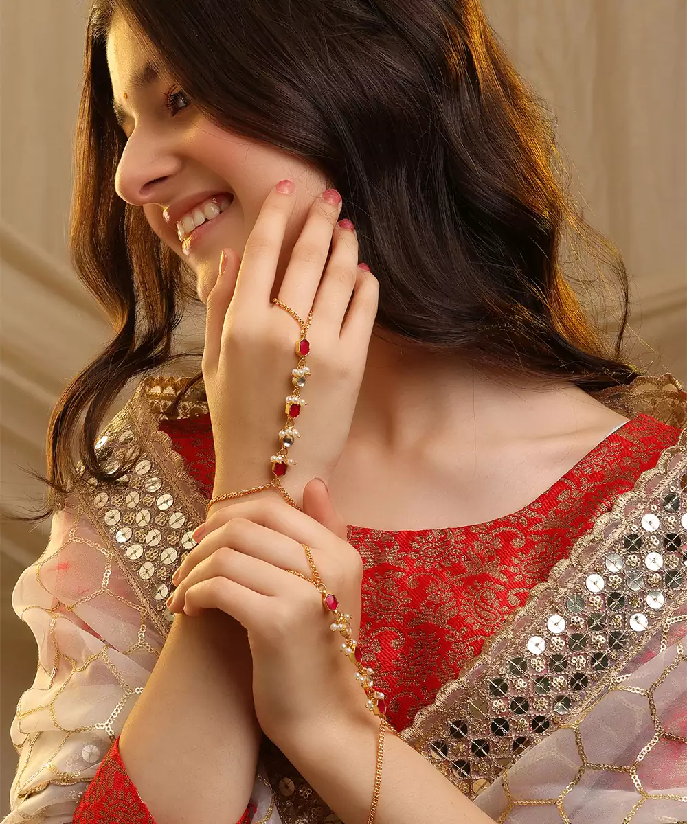 This Gold Plated Kundan Haath Phool Is Adorned With Vibrant Red Stones That Bring A Regal And Festive Charm. Designed With Intricate Craftsmanship, It Connects The Ring And Bracelet Gracefully. Ideal For Bridal Wear And Celebrations, It Enhances Hand Movements With Traditional Elegance And Beauty.