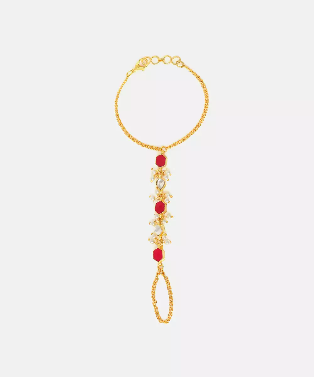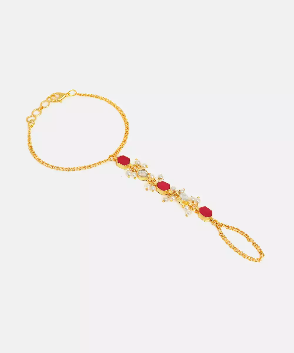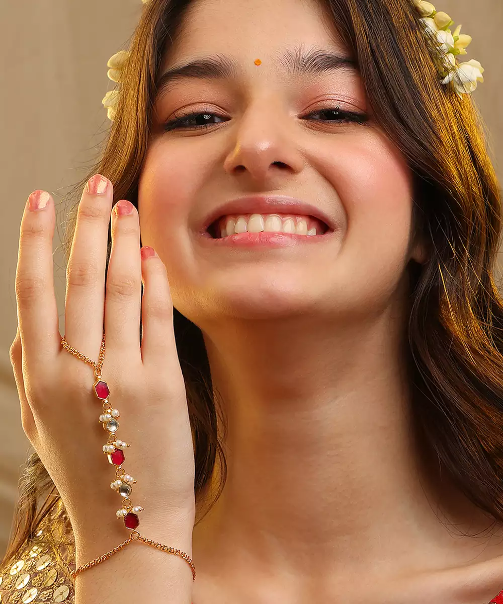 This Gold Plated Kundan Haath Phool Is Highlighted With Striking Red Stones For A Bold And Luxurious Look. Intricately Designed To Link Ring And Bracelet, It Enhances Bridal And Festive Ensembles. A Perfect Accessory To Accentuate Hand Elegance With Traditional Beauty And Refined Craftsmanship.