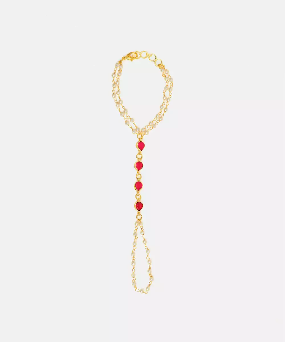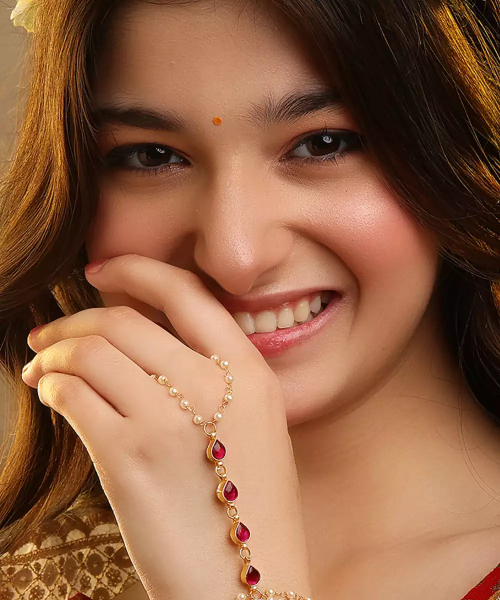 This Gold Plated Kundan Haath Phool Is Highlighted With Striking Red Stones For A Bold And Luxurious Look. Intricately Designed To Link Ring And Bracelet, It Enhances Bridal And Festive Ensembles. A Perfect Accessory To Accentuate Hand Elegance With Traditional Beauty And Refined Craftsmanship.