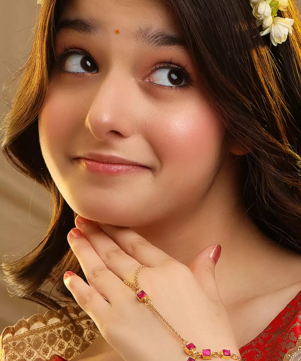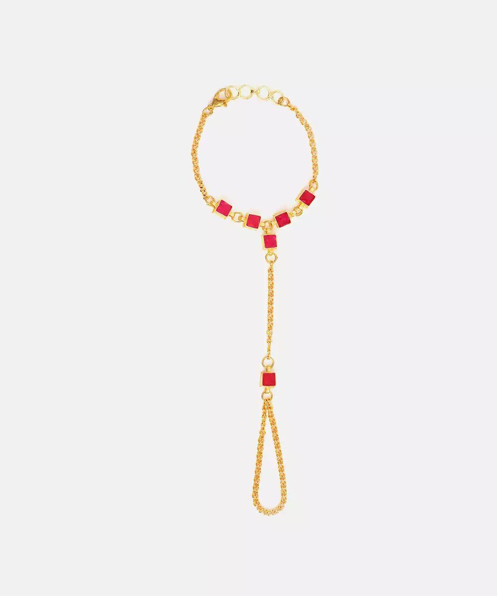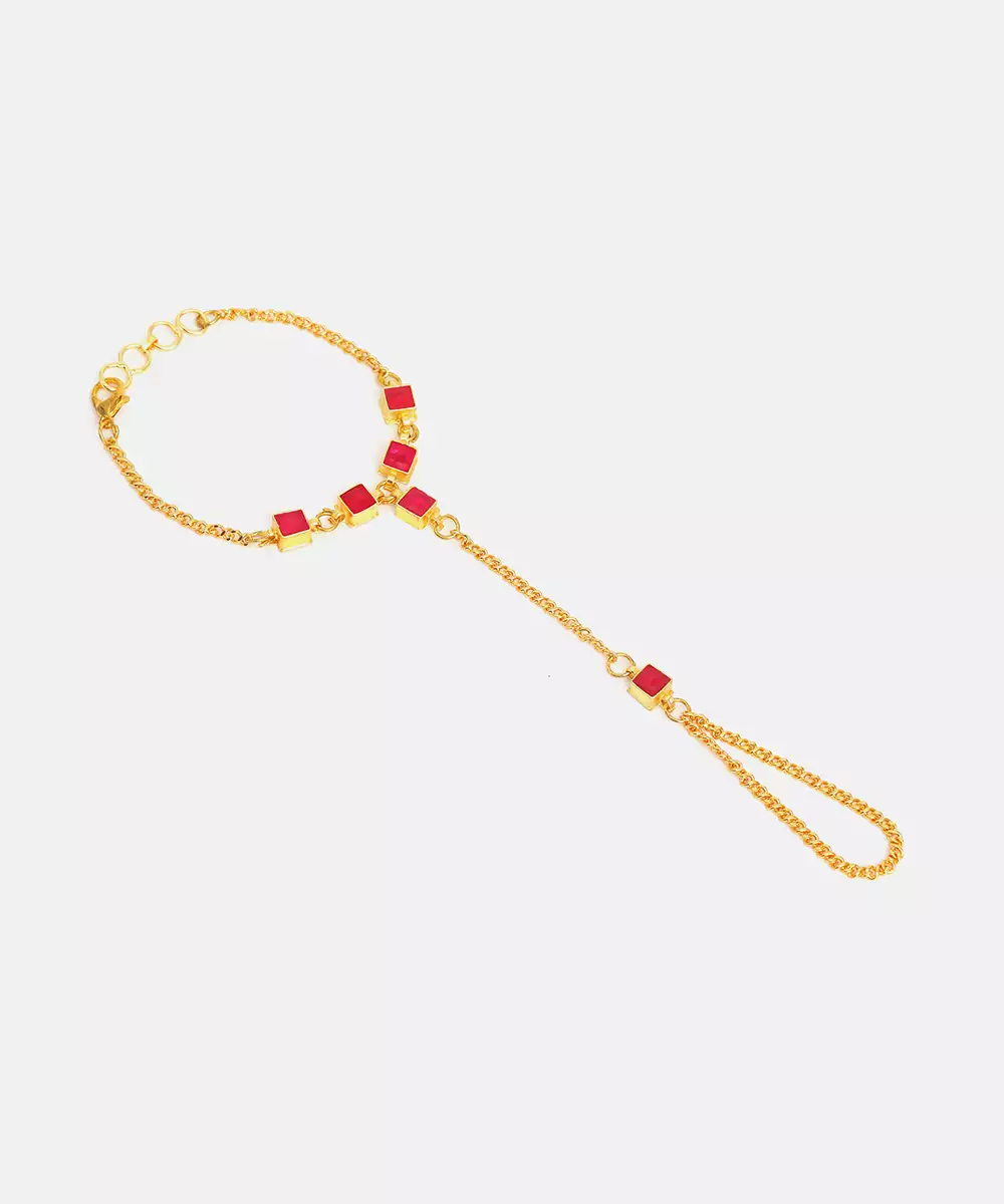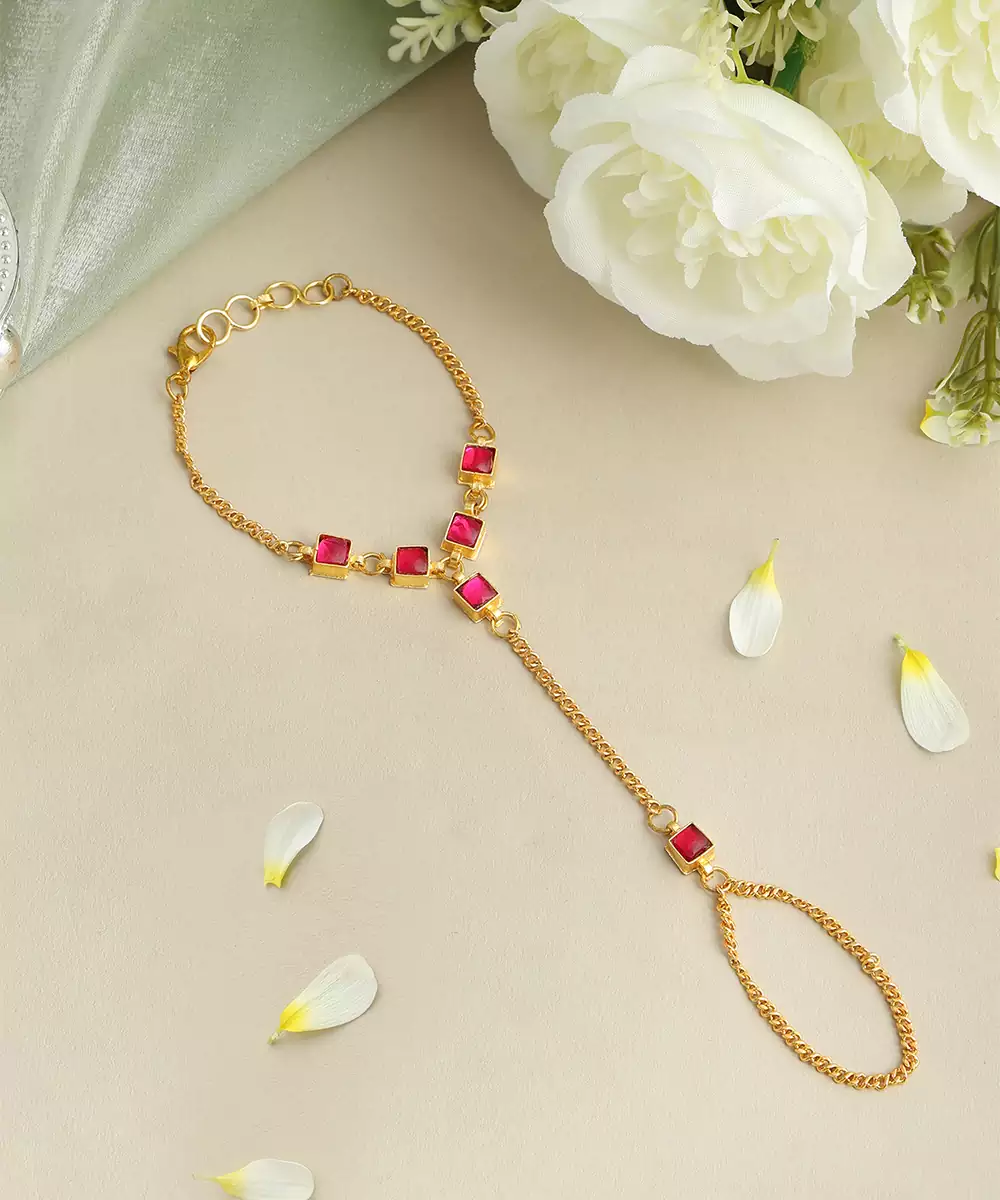 This Gold Plated Kundan Haath Phool Features Rich Red Stones Set In A Classic Traditional Design. The Elegant Structure Highlights Hands Gracefully And Ensures Comfortable Wear. Ideal For Bridal And Festive Occasions, It Completes Ethnic Looks With A Touch Of Royalty And Timeless Sophistication.