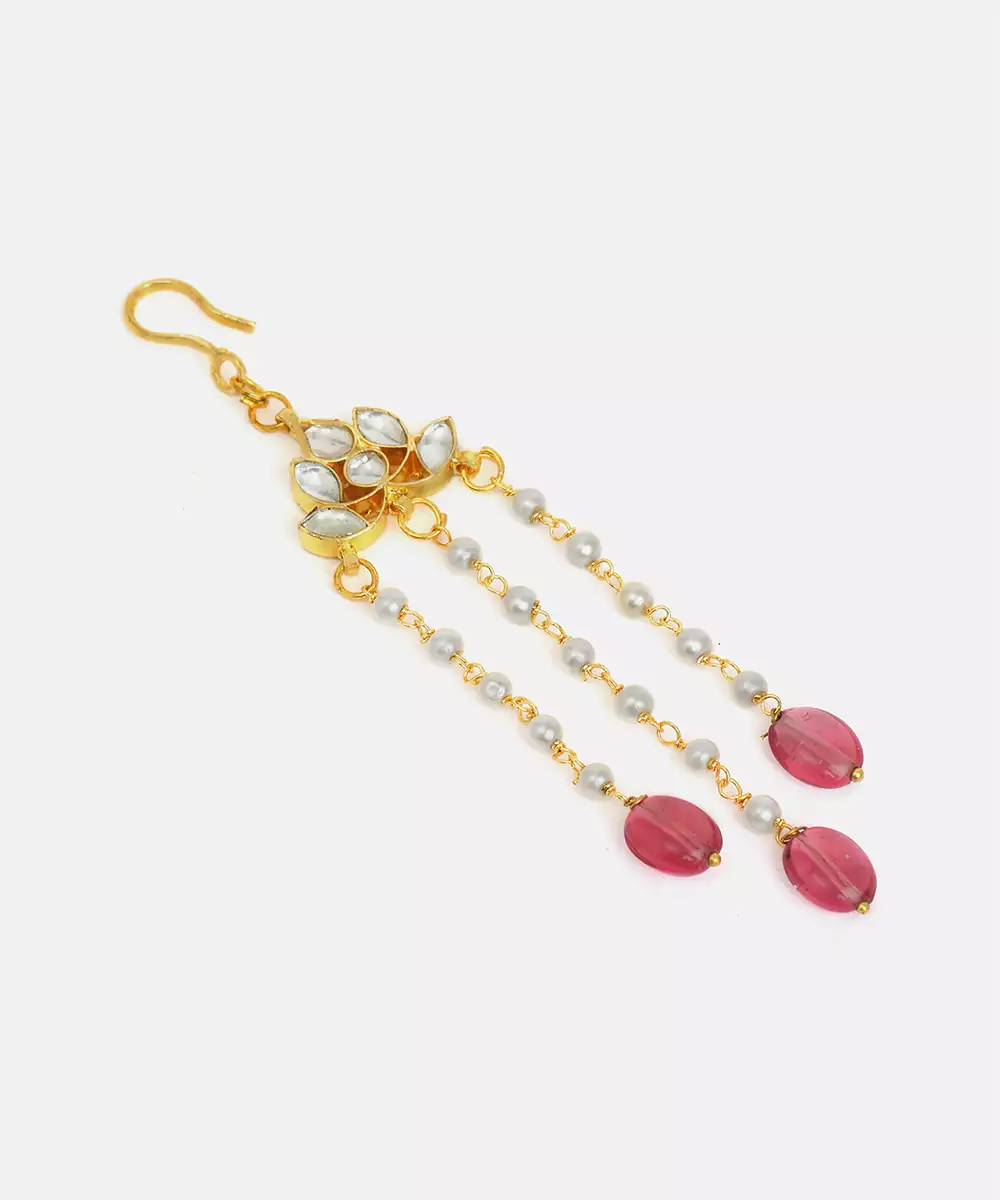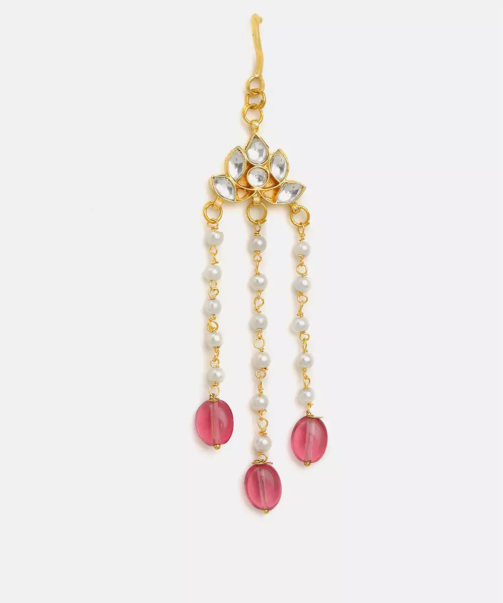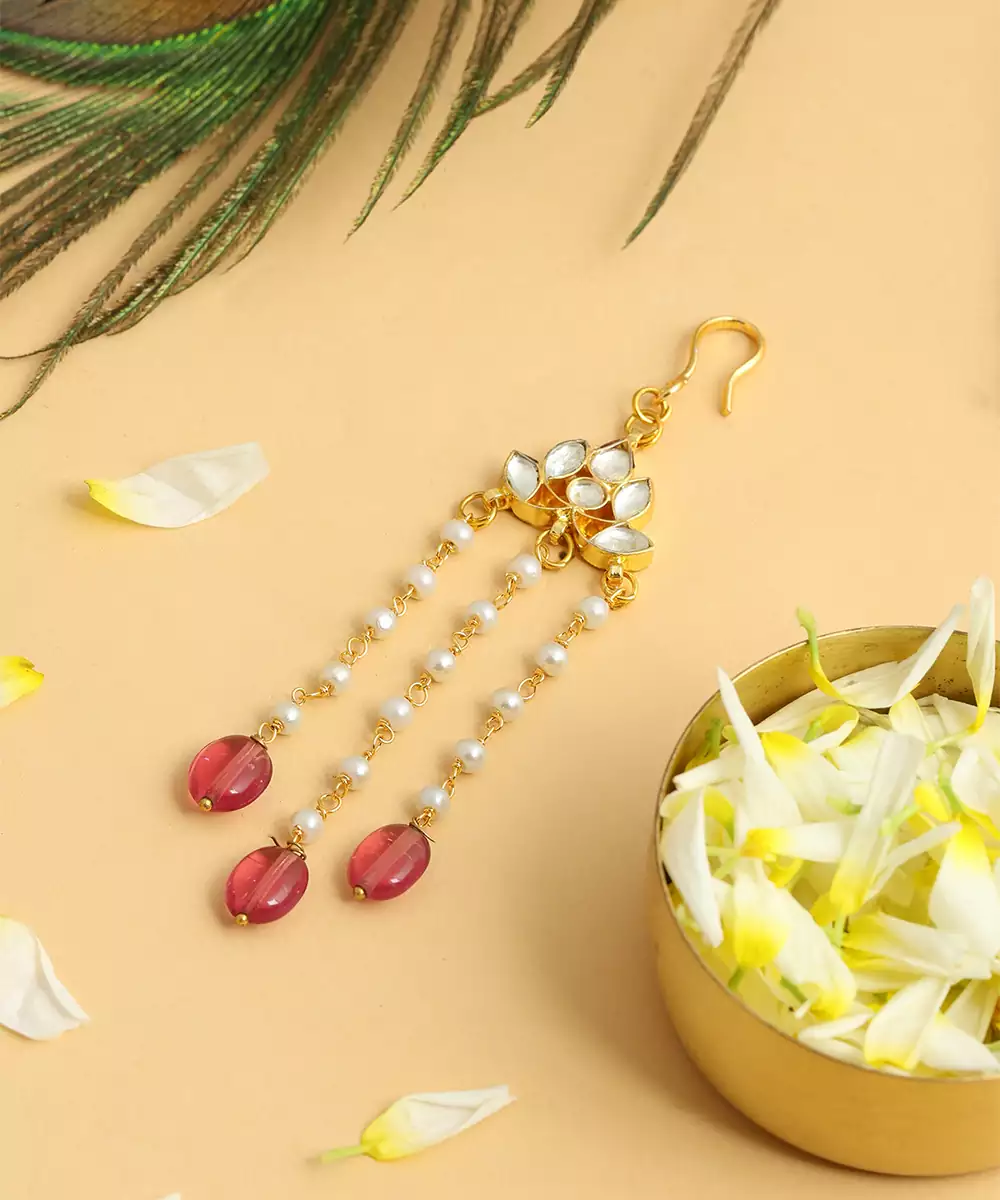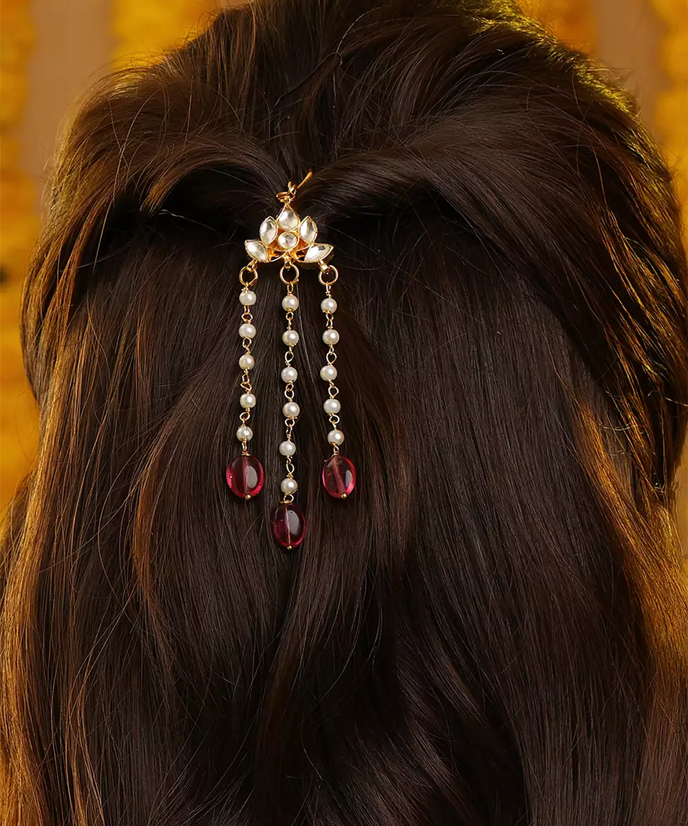 This Gold Plated Kundan Hair Clip Is Highlighted With Striking Red Stones That Bring A Bold And Royal Touch To Hairstyles. Crafted With Precision, It Secures Hair Neatly While Enhancing Festive Appeal. Ideal For Weddings And Celebrations, It Adds Charm To Traditional And Fusion Outfits.