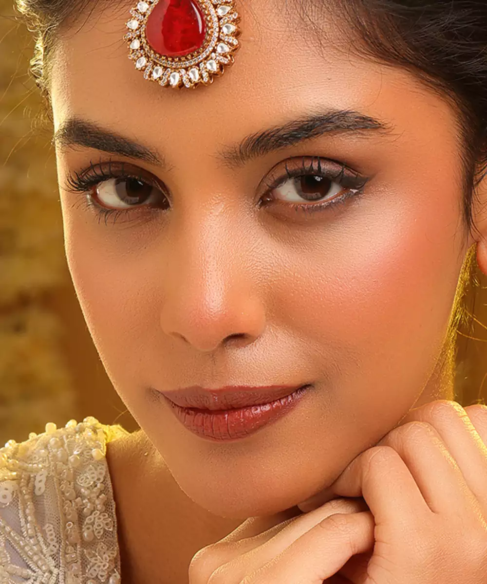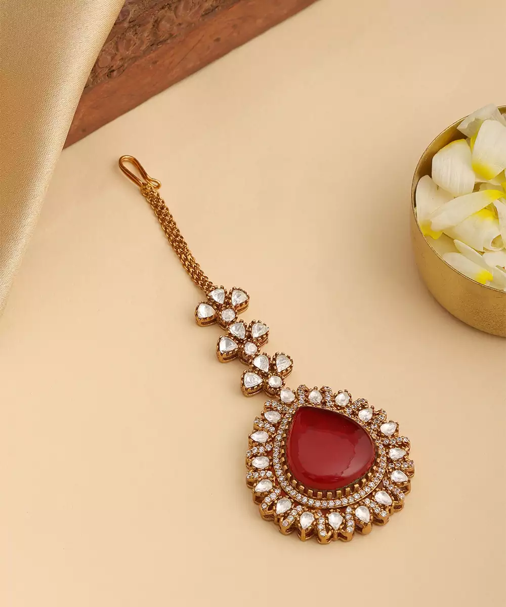 This Gold Plated Kundan Red Stones Maang Tikka Showcases Vibrant Color And Intricate Detailing. Designed With Classic Kundan Work And Bold Red Stones, It Adds A Regal Accent To Bridal Styling. Perfect For Weddings And Celebrations, This Maang Tikka Enhances Lehengas And Sarees With Elegance.
