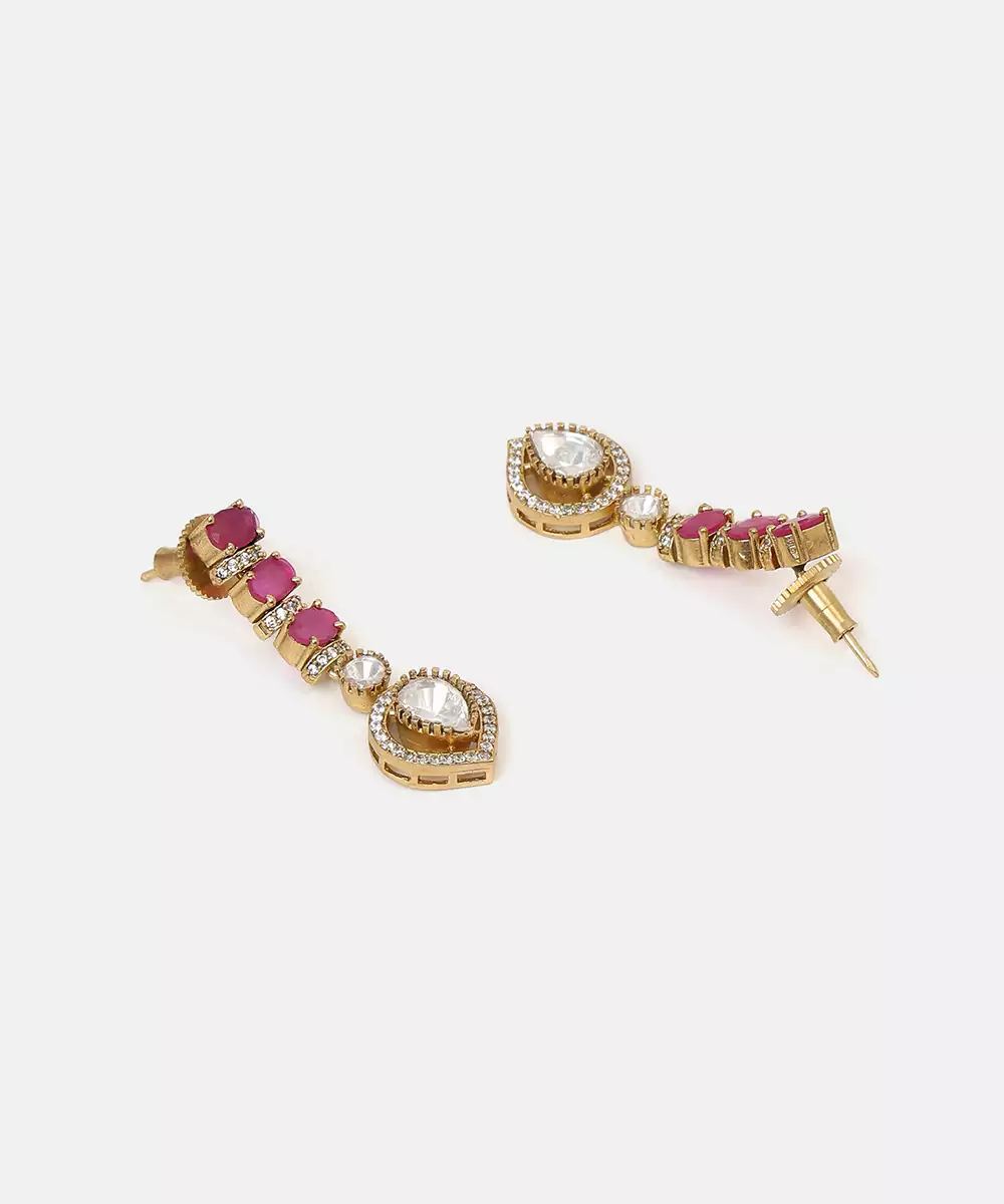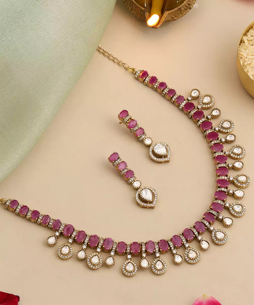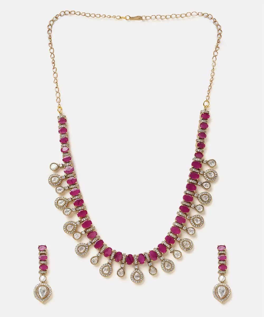 This Gold Plated Kundan Red Stones Necklace Set Highlights Bold Color And Exquisite Detailing. Designed With Traditional Kundan Work And Deep Red Stones, It Adds A Regal Touch To Bridal Looks. Ideal For Weddings And Festive Occasions, This Necklace Set Complements Ethnic Attire With Sophistication.