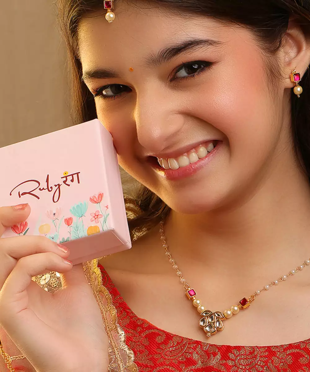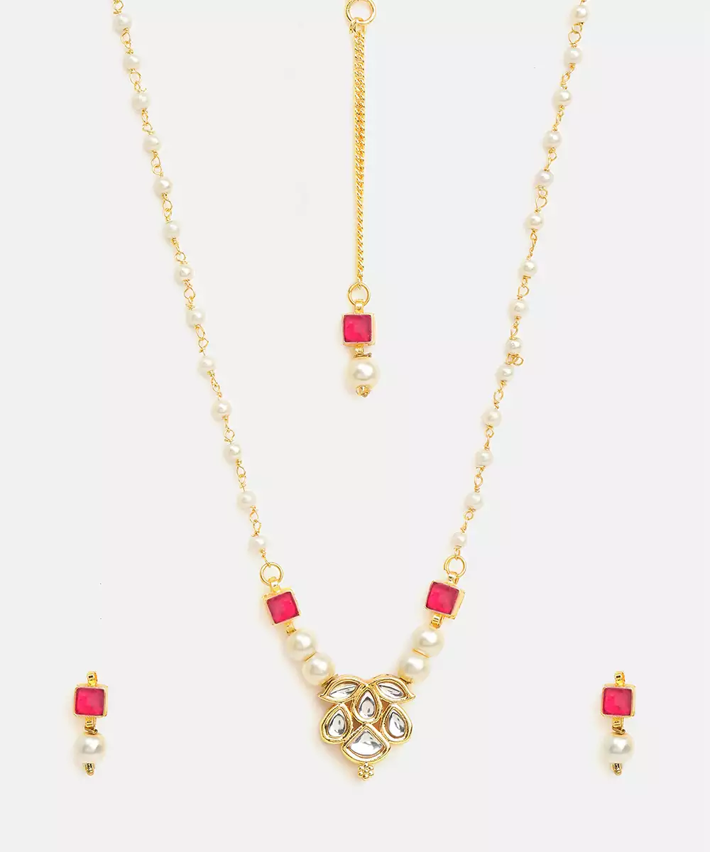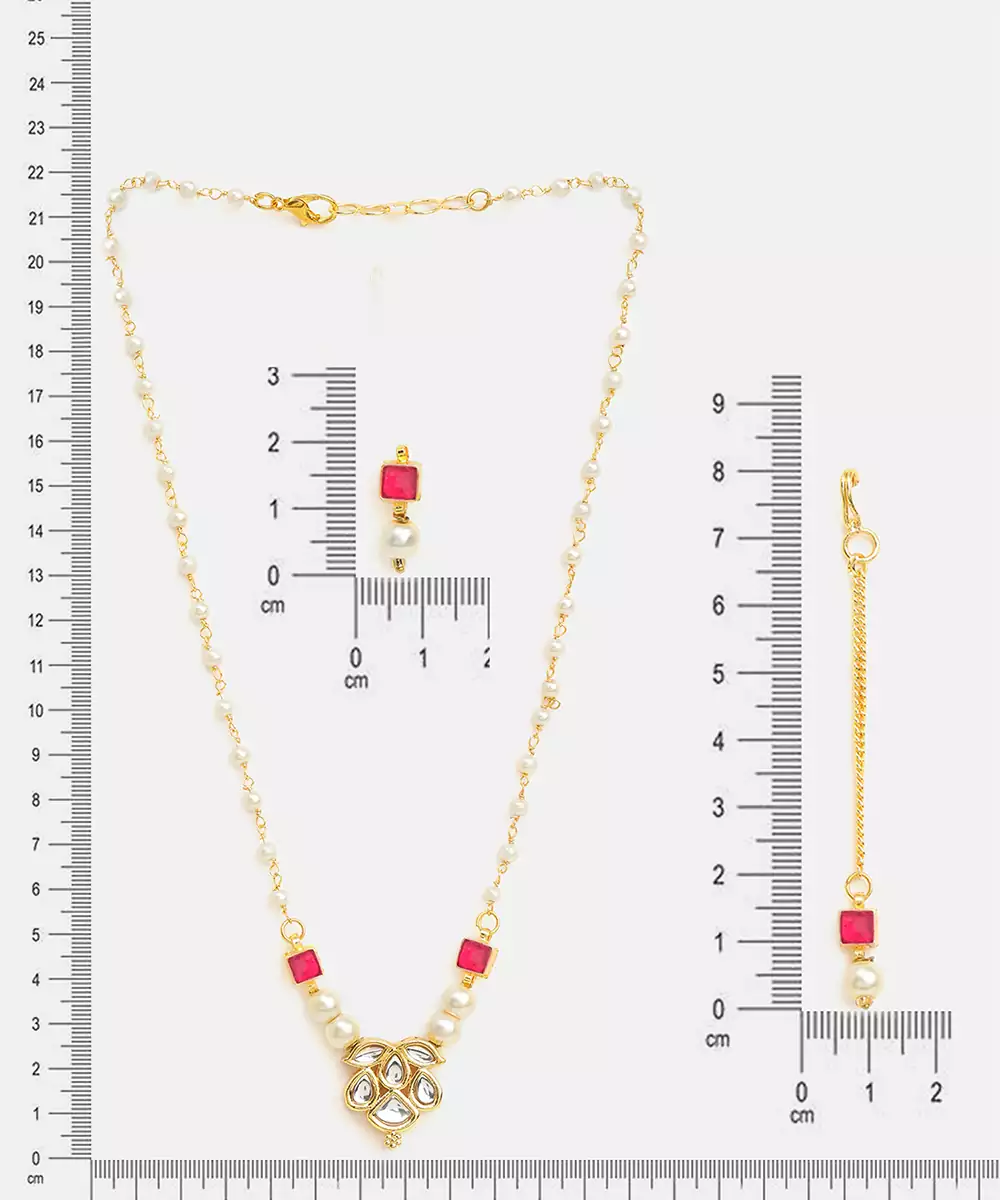 This Stunning Gold Plated Kundan Necklace Set Is Embellished With Striking Red Stones For A Bold And Festive Appeal. Designed With Traditional Artistry, It Reflects Classic Indian Jewelry Aesthetics. Perfect For Weddings And Celebrations, It Enhances Ethnic Attire With Rich Color And Refined Craftsmanship.